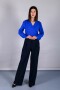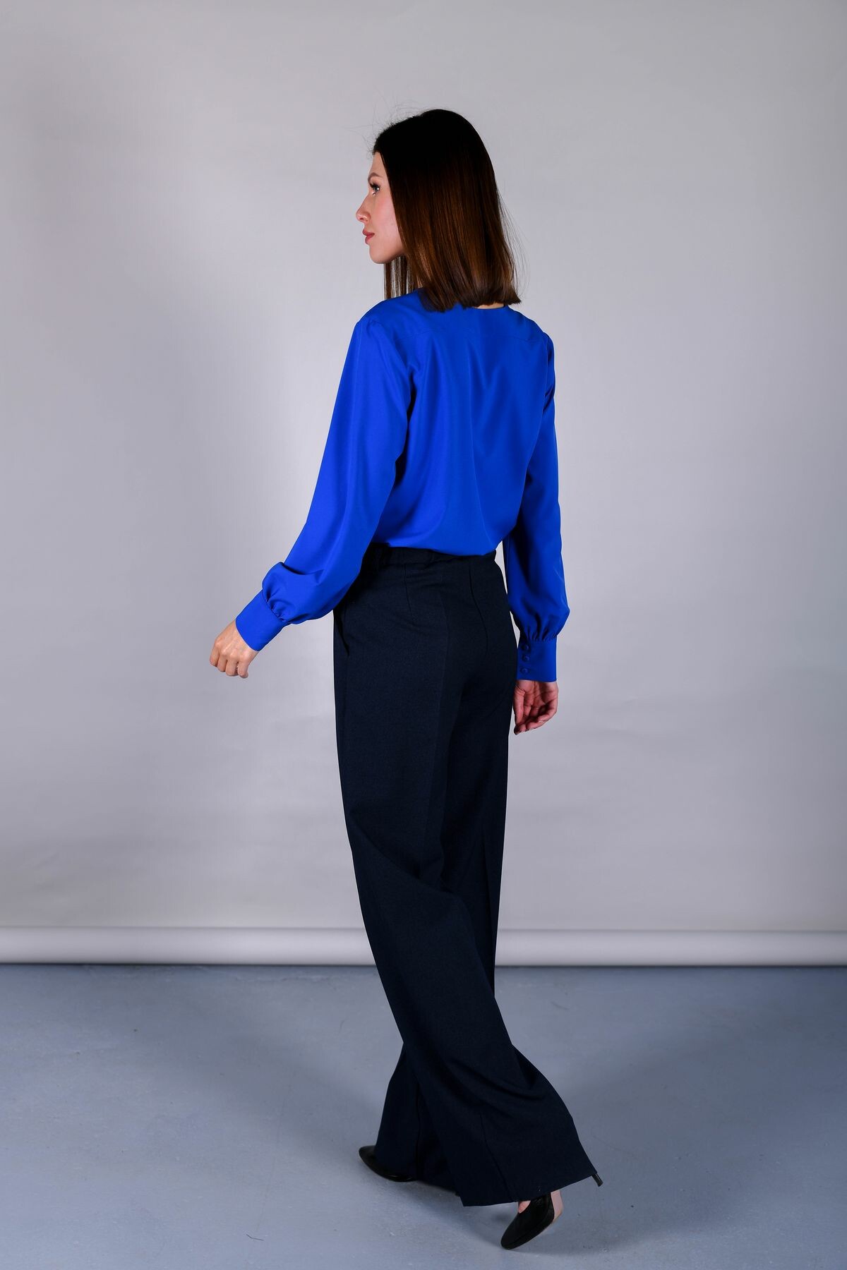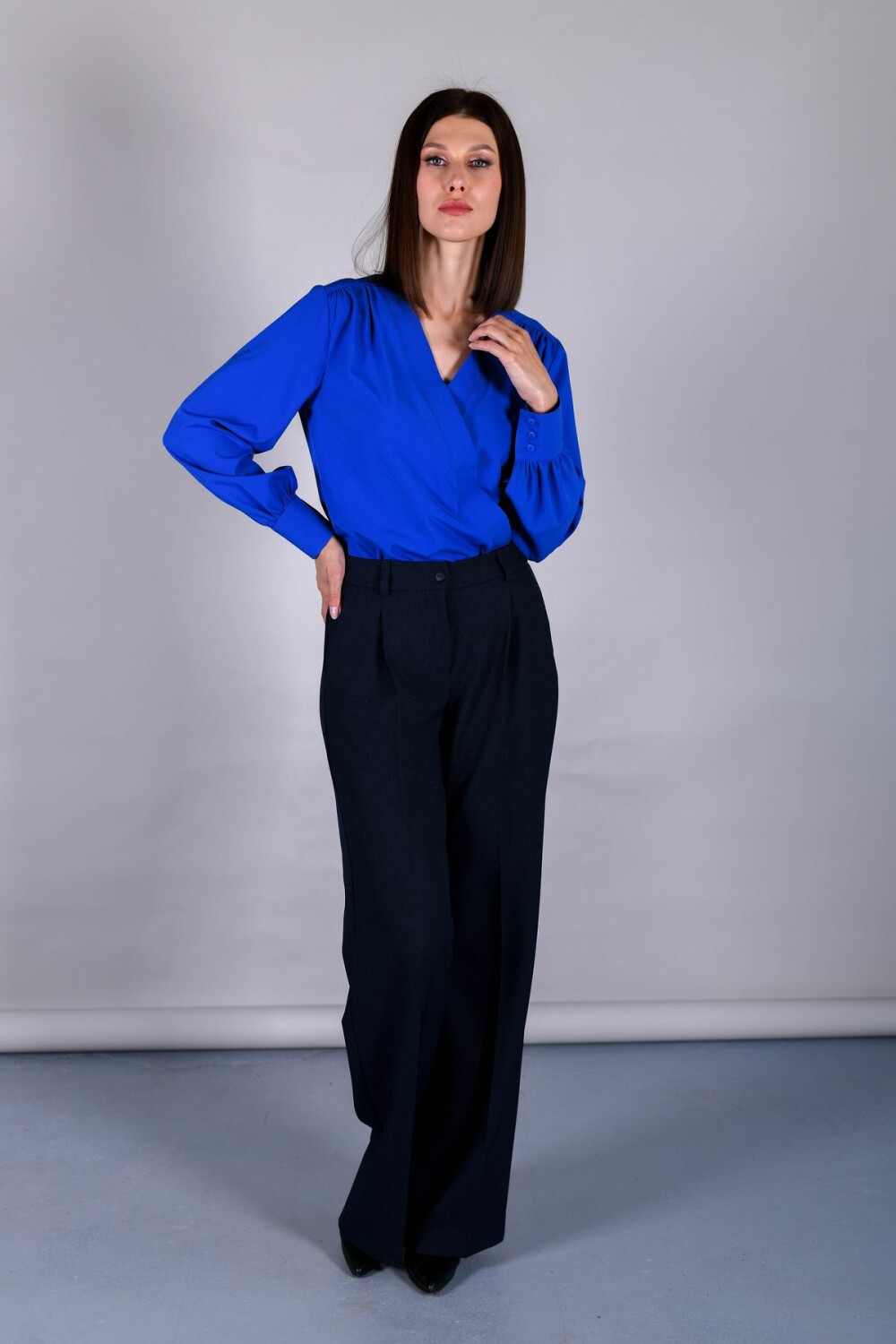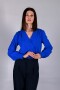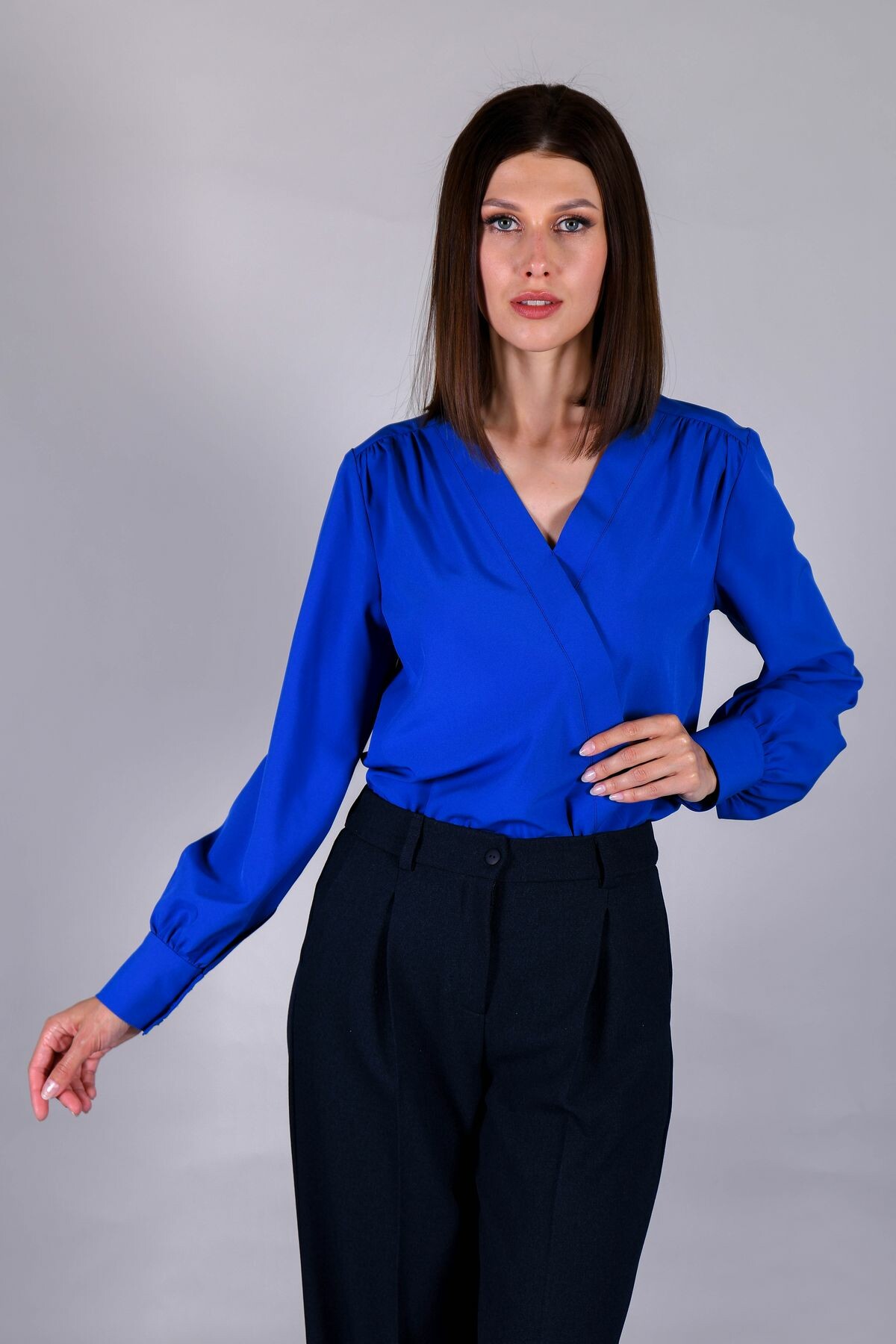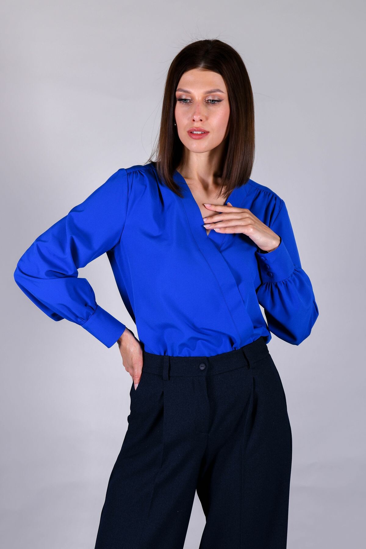 Блузка прямого силуэта с имитацией запАха. Отделка изделия выполнена из контрастного полотна с принтом (в зависимости от расцветки). Длинный втачной рукав обработан манжетой.
