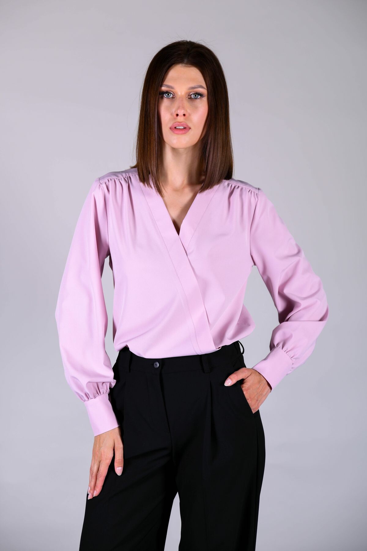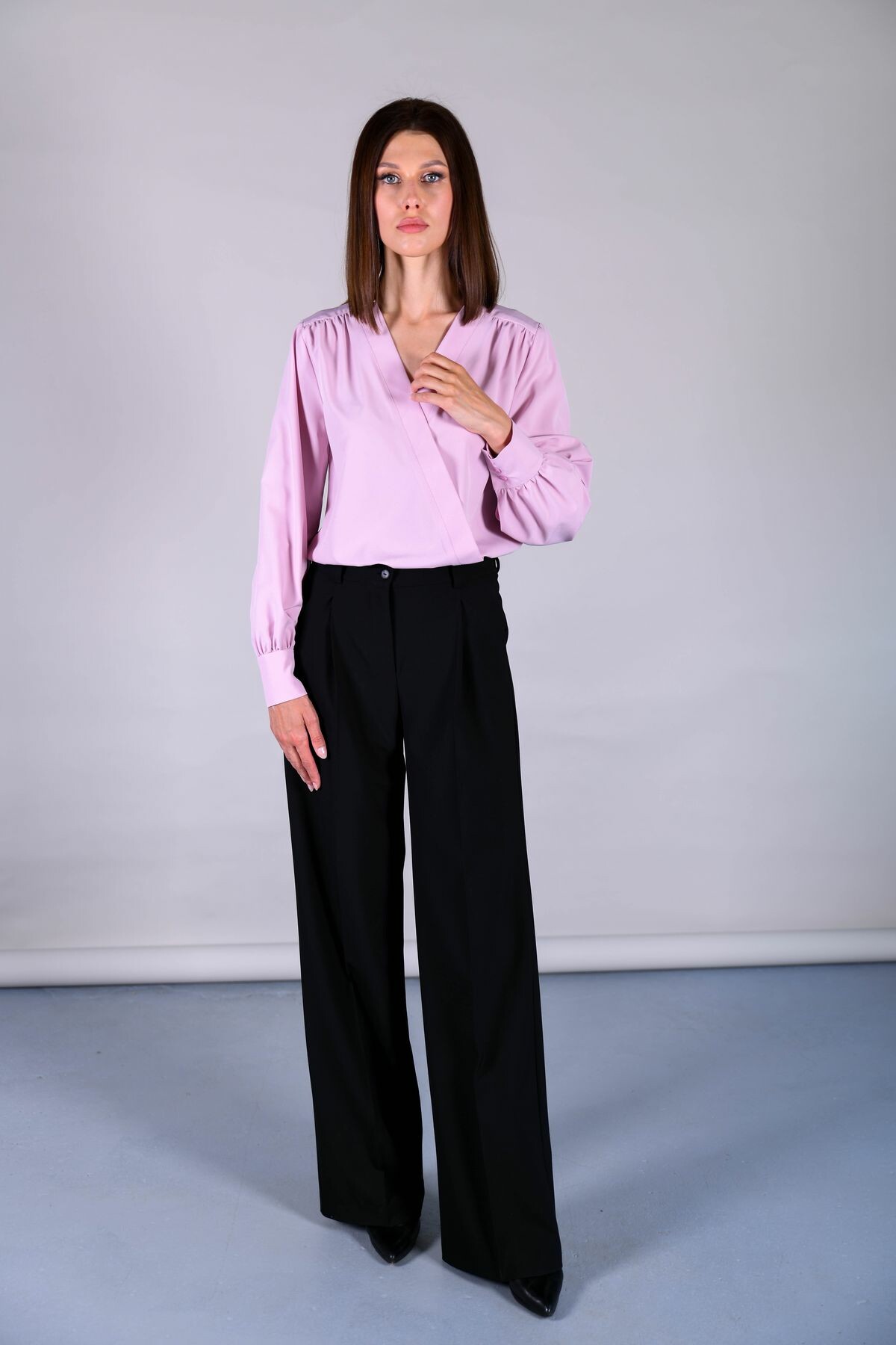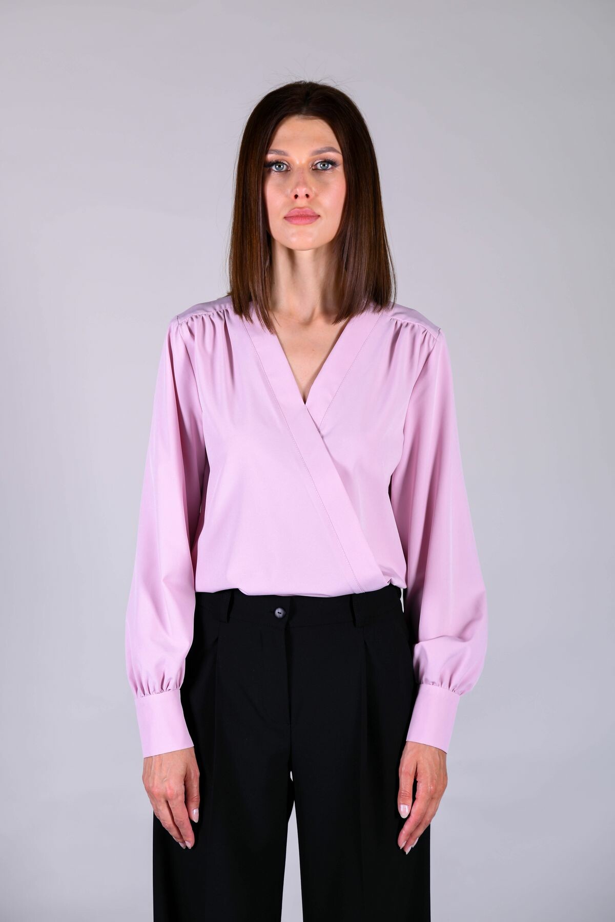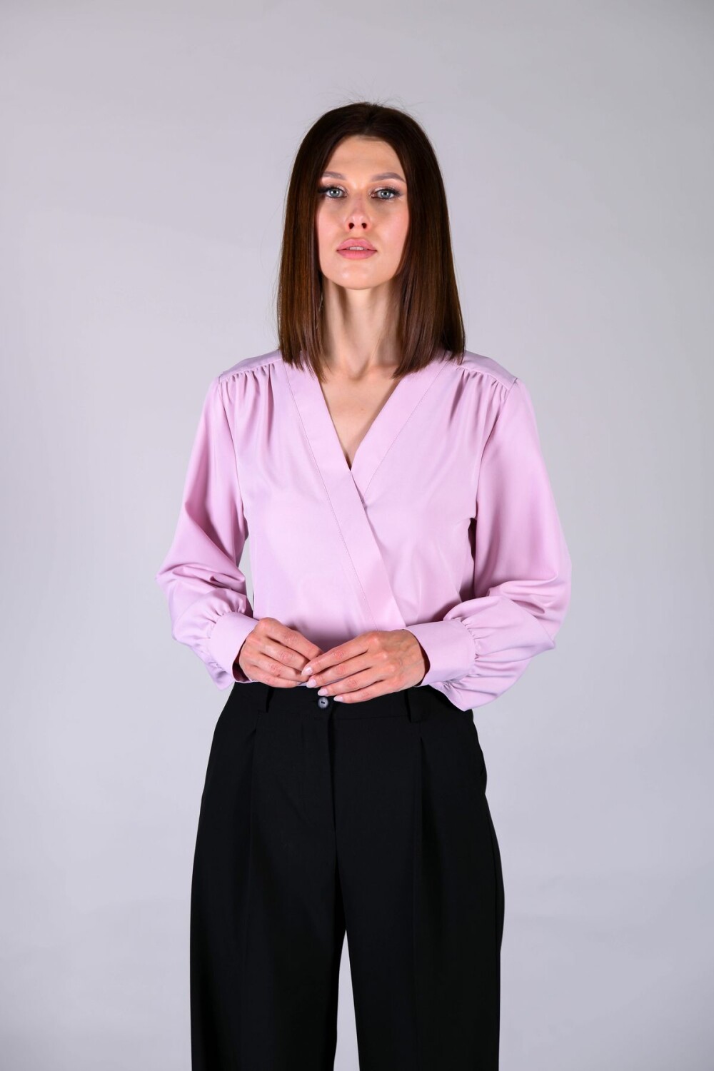 Блузка прямого силуэта с имитацией запАха. Отделка изделия выполнена из контрастного полотна с принтом (в зависимости от расцветки). Длинный втачной рукав обработан манжетой.