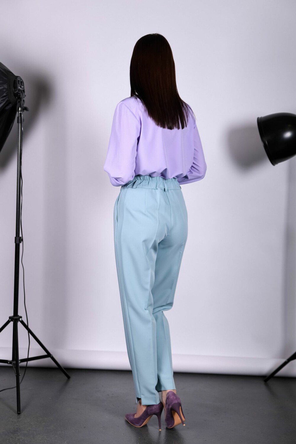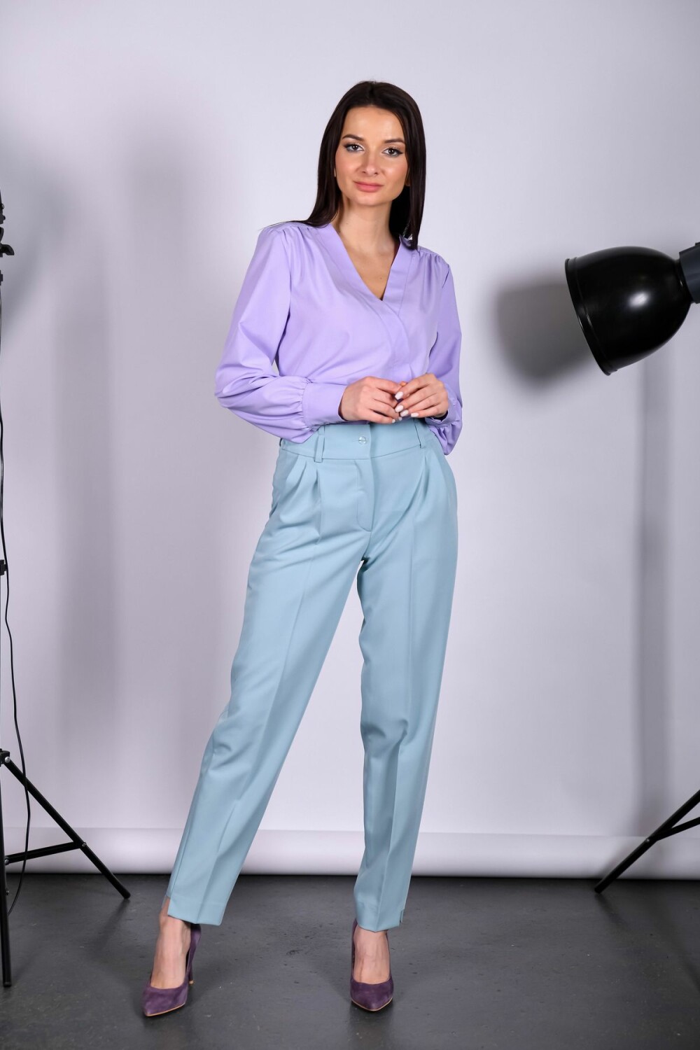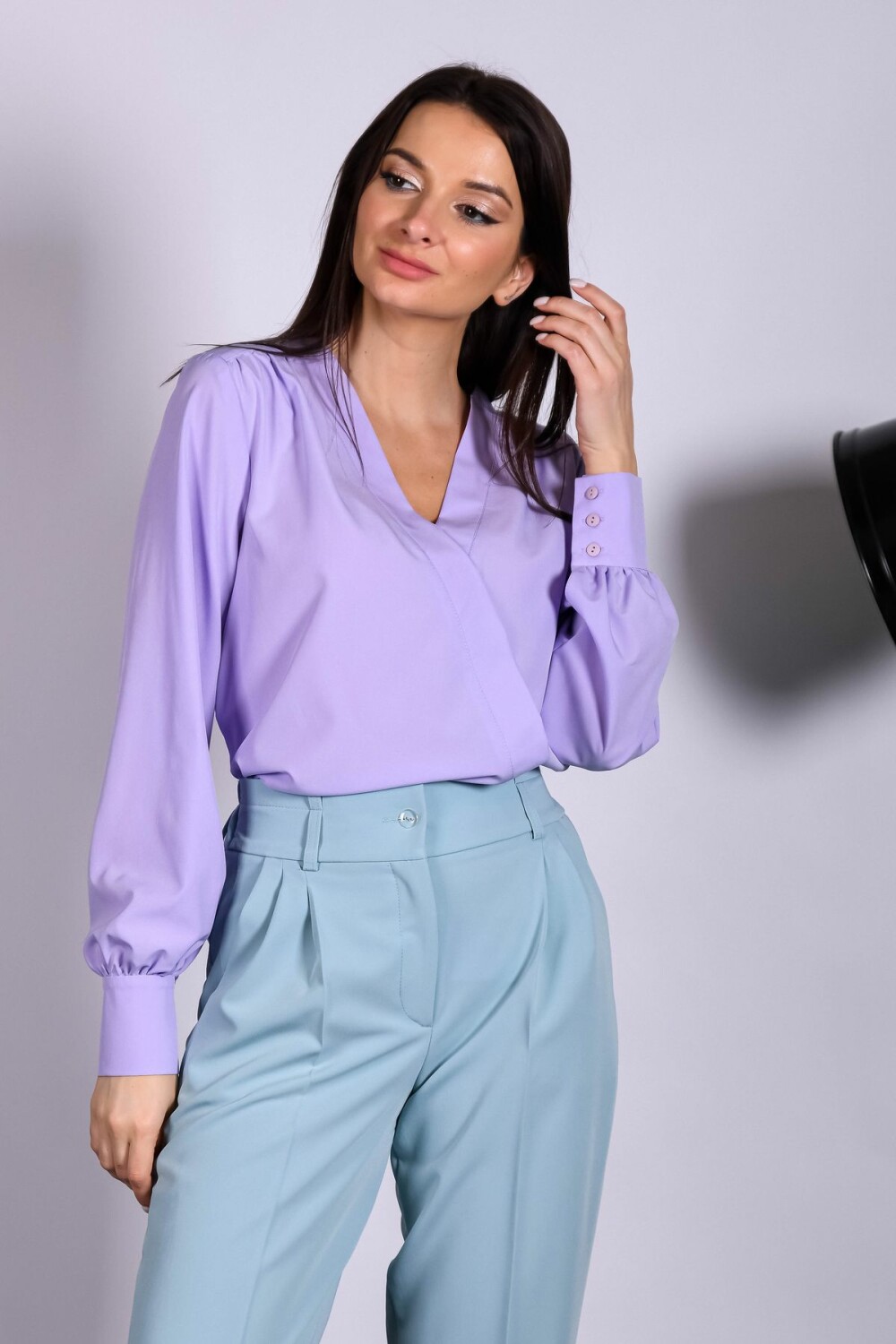 Блузка прямого силуэта с имитацией запАха. Отделка изделия выполнена из контрастного полотна с принтом (в зависимости от расцветки). Длинный втачной рукав обработан манжетой.