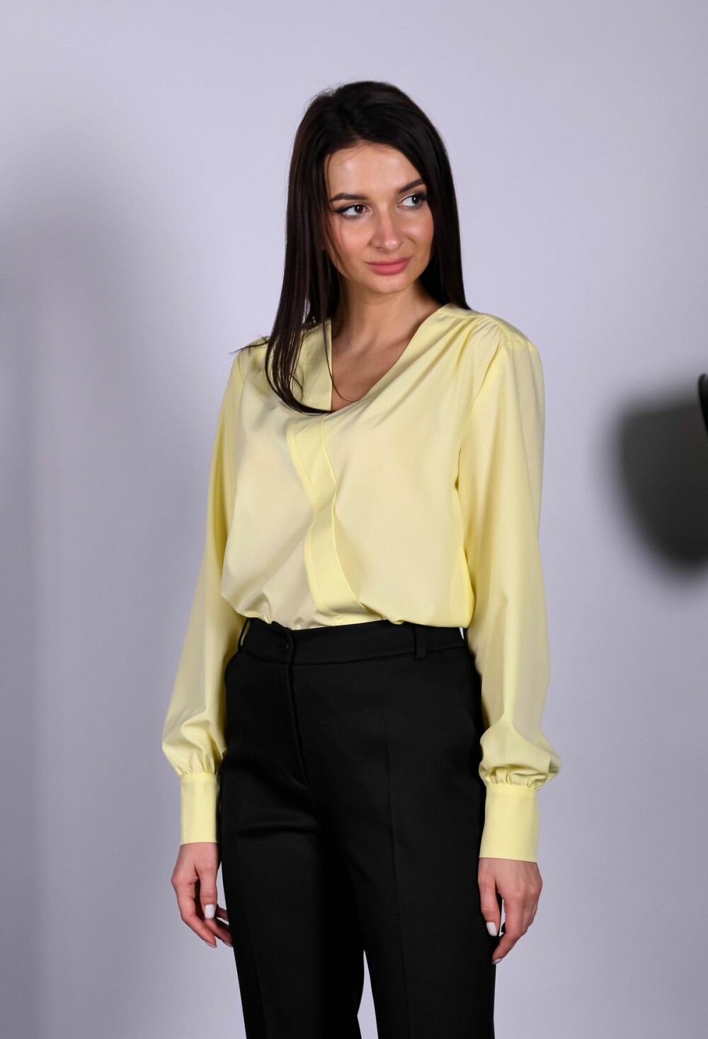 Блузка прямого силуэта с имитацией запАха. Отделка изделия выполнена из контрастного полотна с принтом (в зависимости от расцветки). Длинный втачной рукав обработан манжетой.