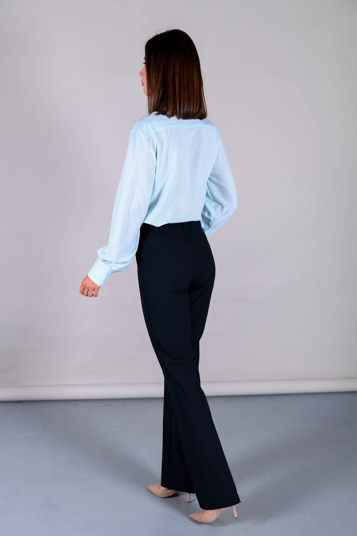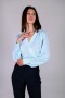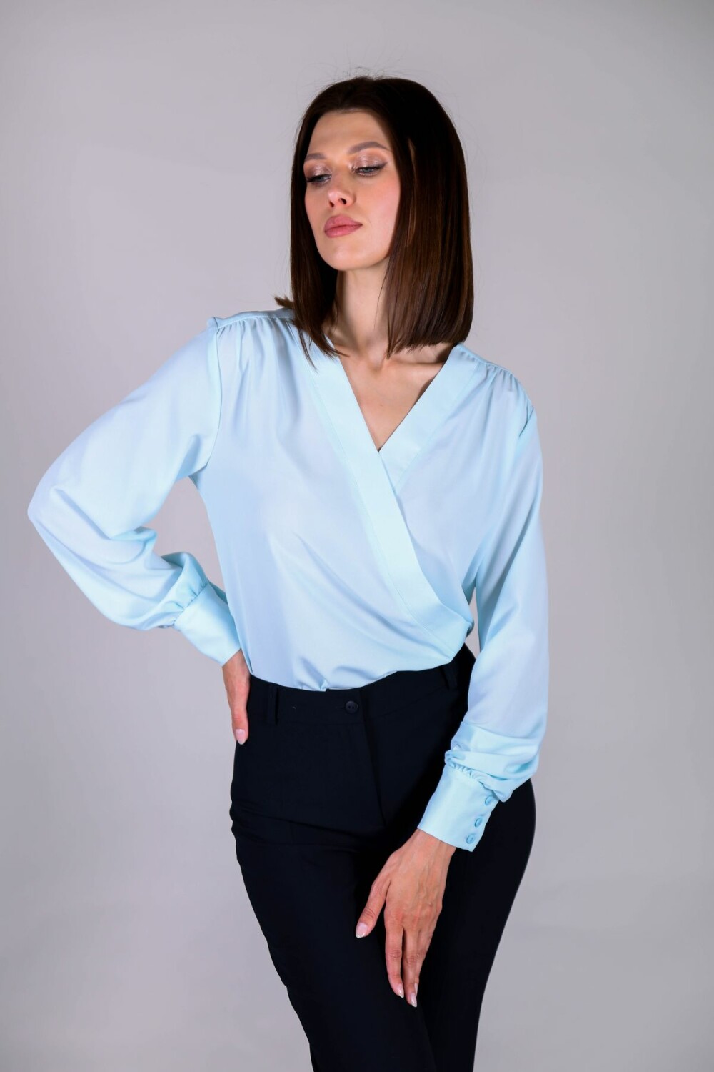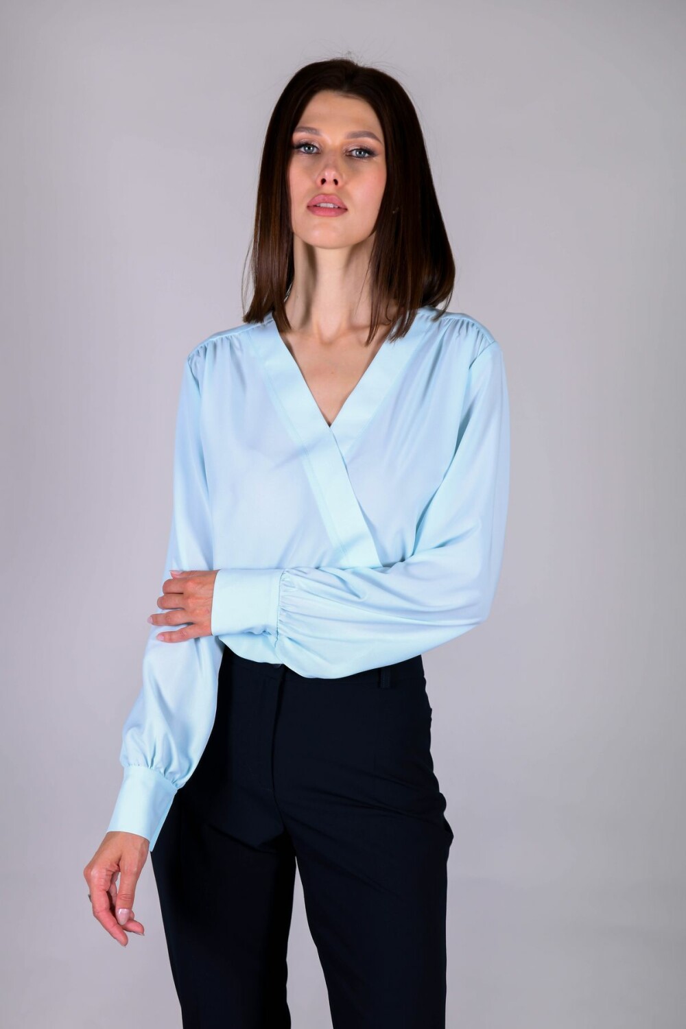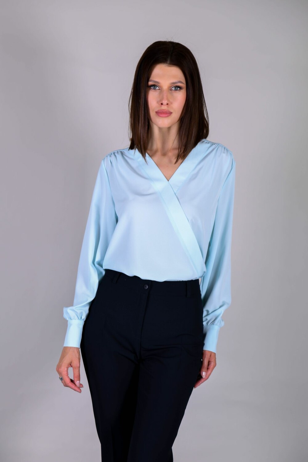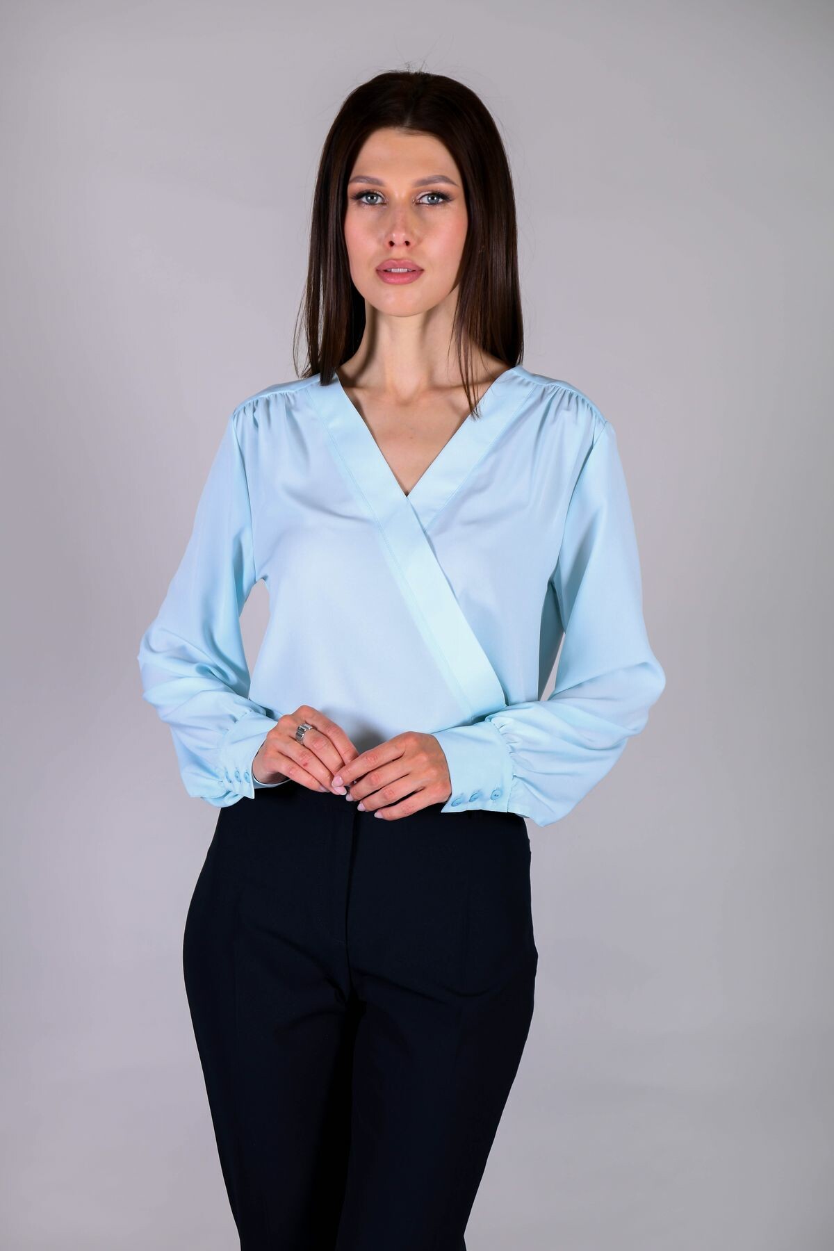 Блузка прямого силуэта с имитацией запАха. Отделка изделия выполнена из контрастного полотна с принтом (в зависимости от расцветки). Длинный втачной рукав обработан манжетой.