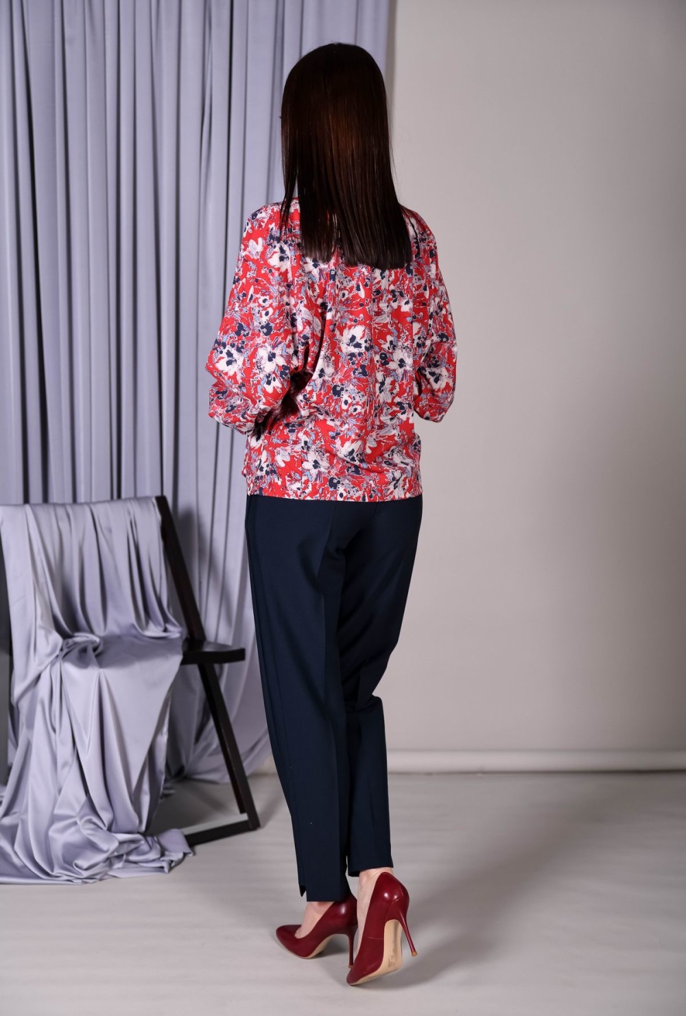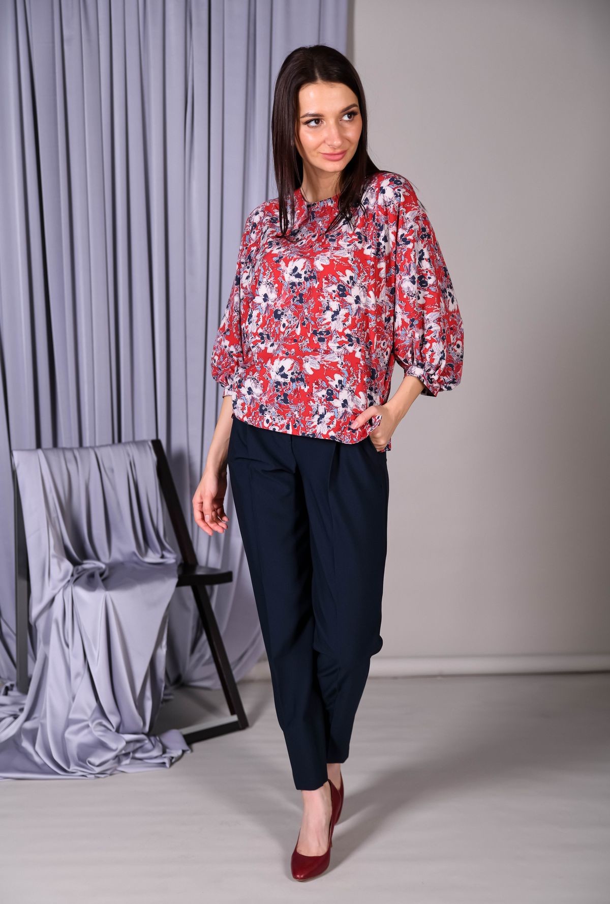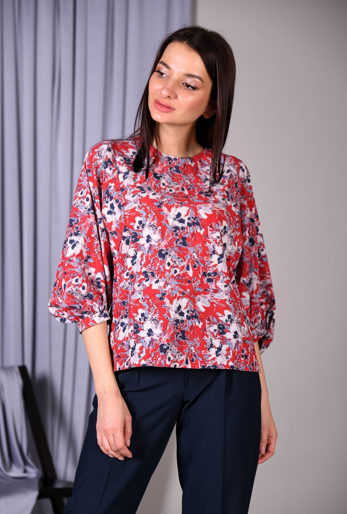Блузка прямого силуэта. Округлый вырез горловины, пышный втачной рукав обработан манжетой. Застежка на петлю и пуговицу на спинке.