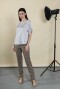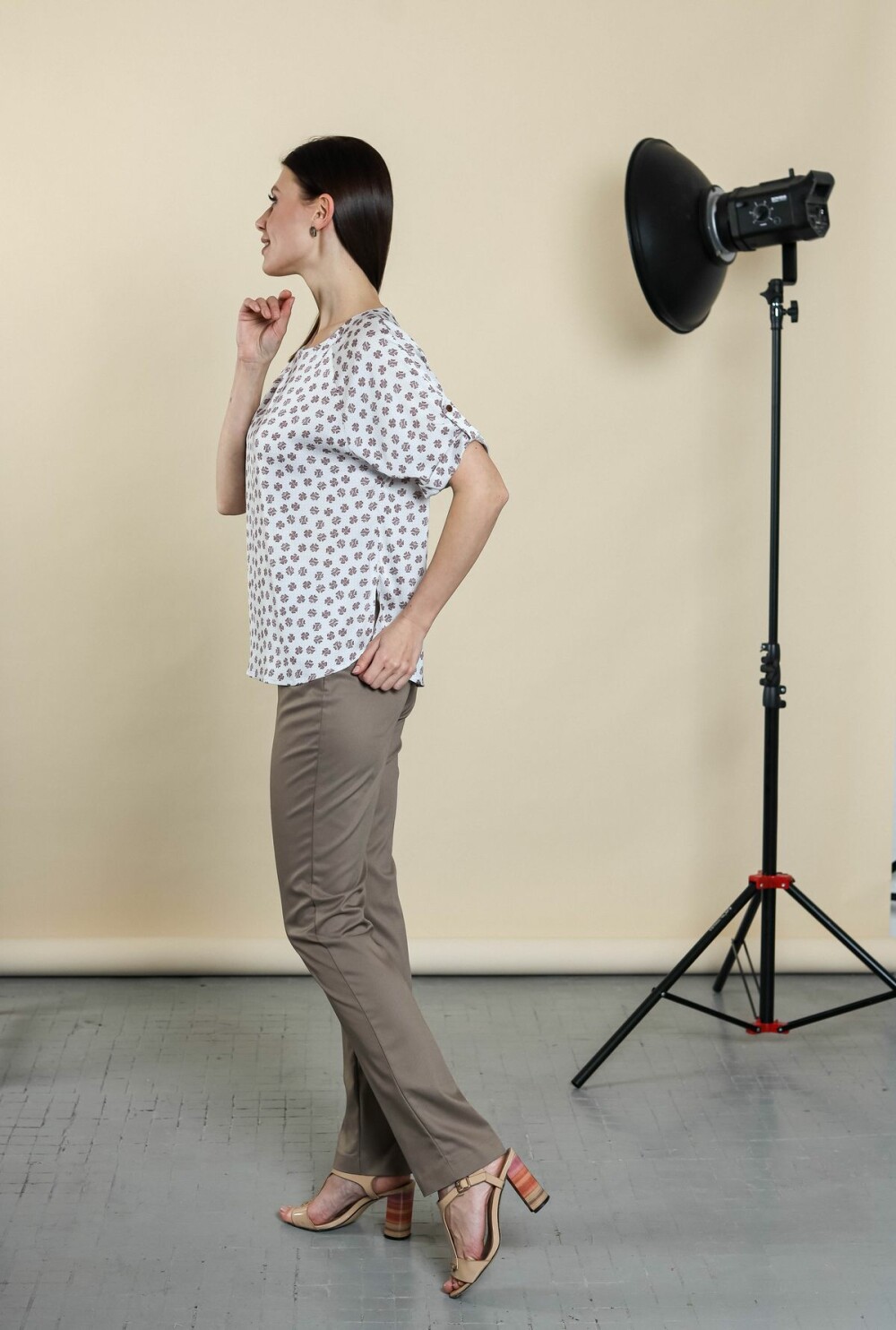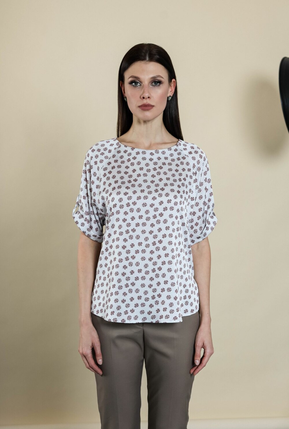 Блузка прямого силуэта. Цельнокроенный рукав с регулировкой на пату обработан отворотом. Боковые швы изделия обработаны разрезами.