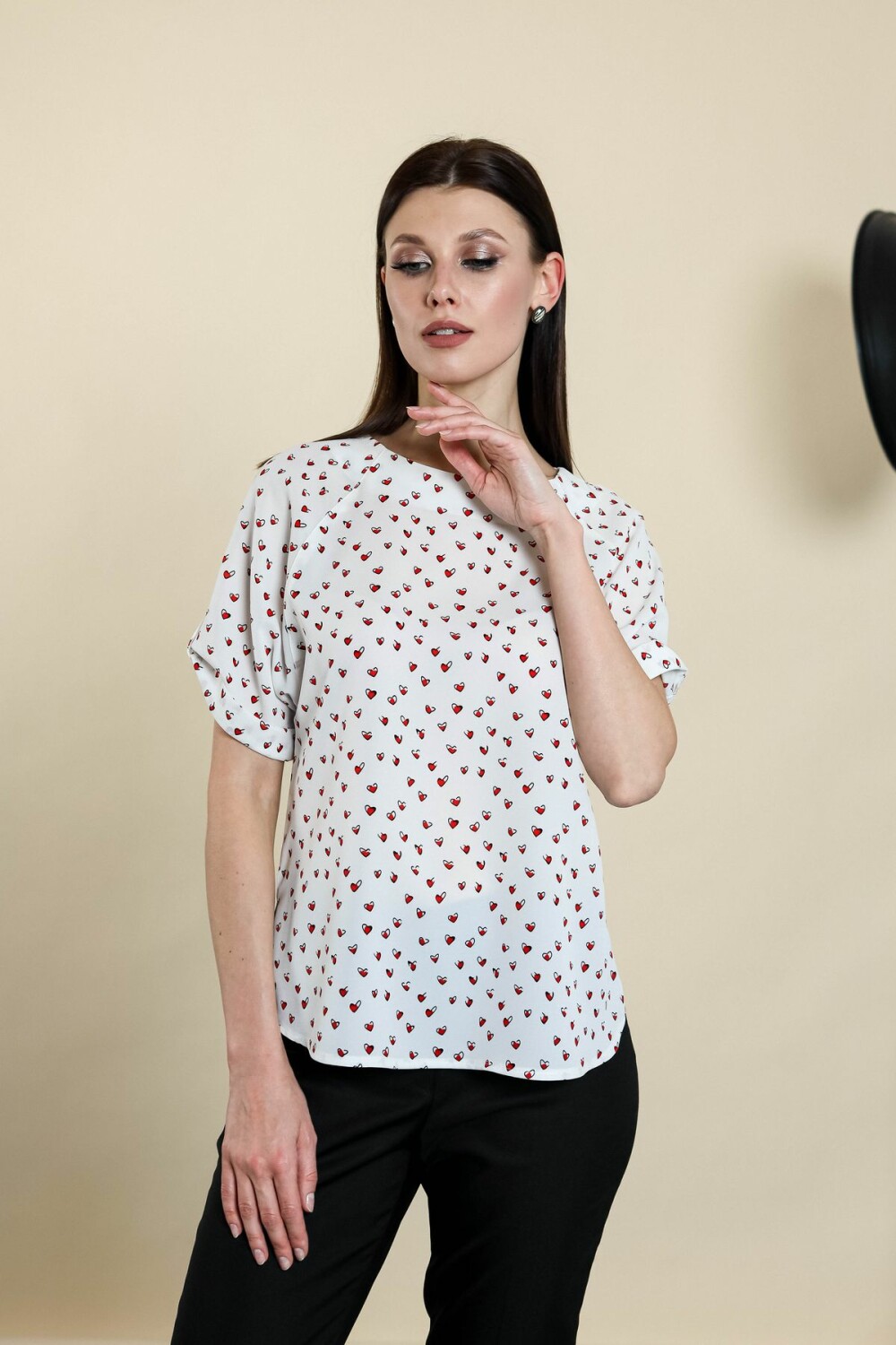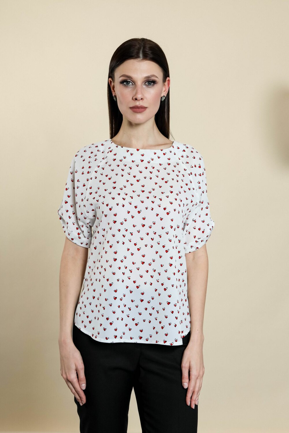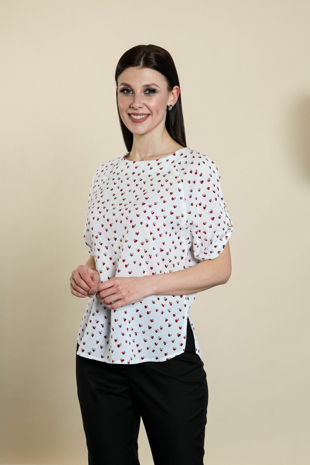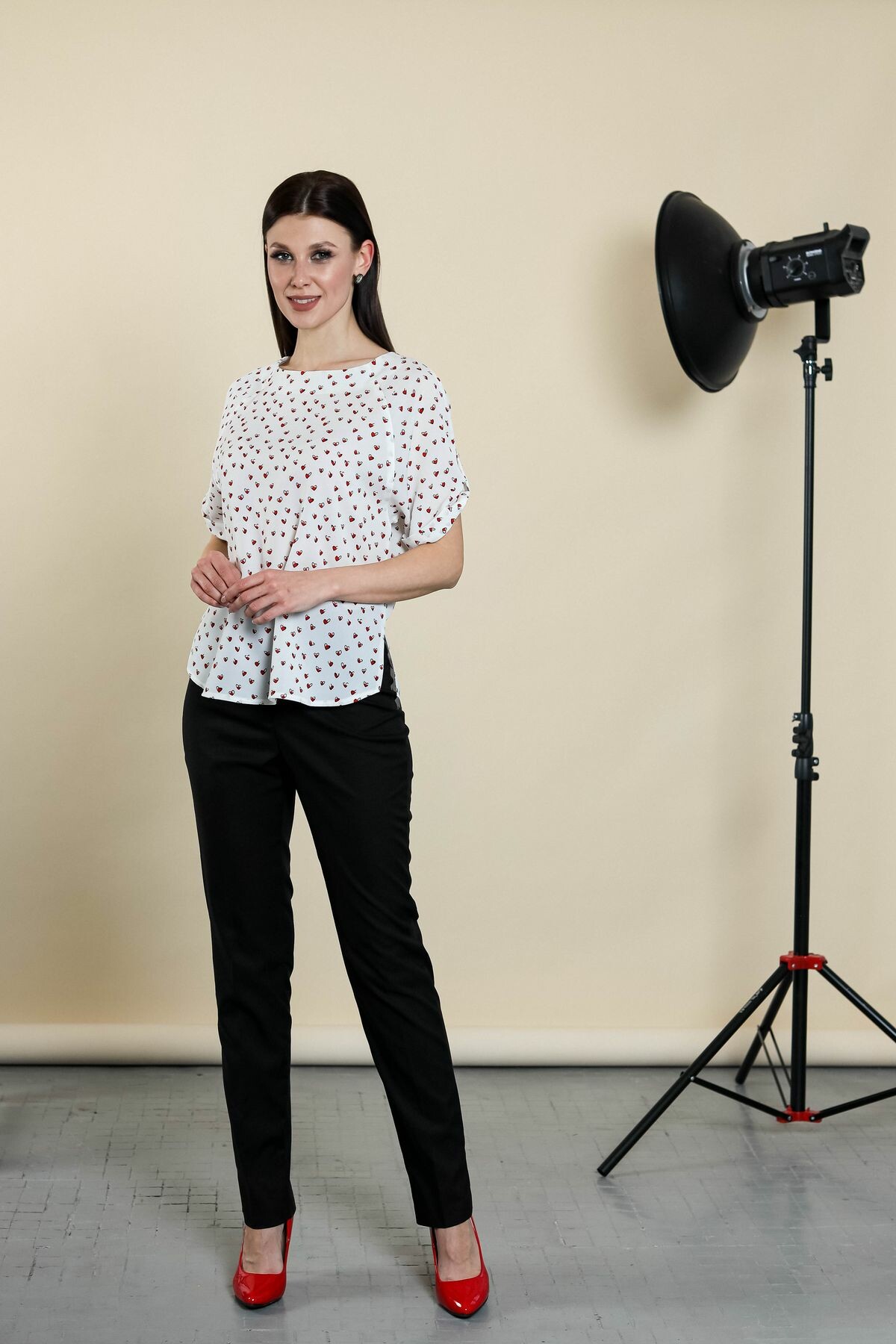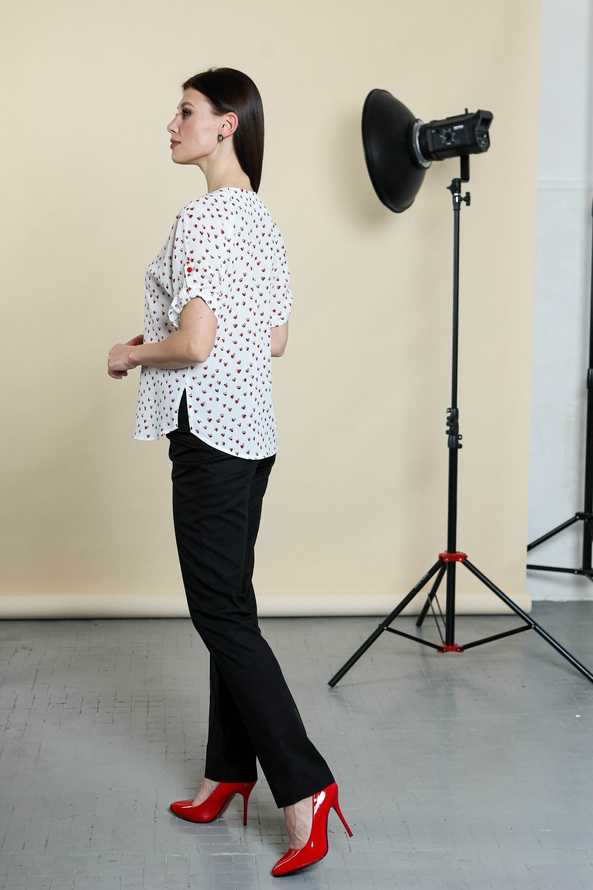 Блузка прямого силуэта. Цельнокроенный рукав с регулировкой на пату обработан отворотом. Боковые швы изделия обработаны разрезами.