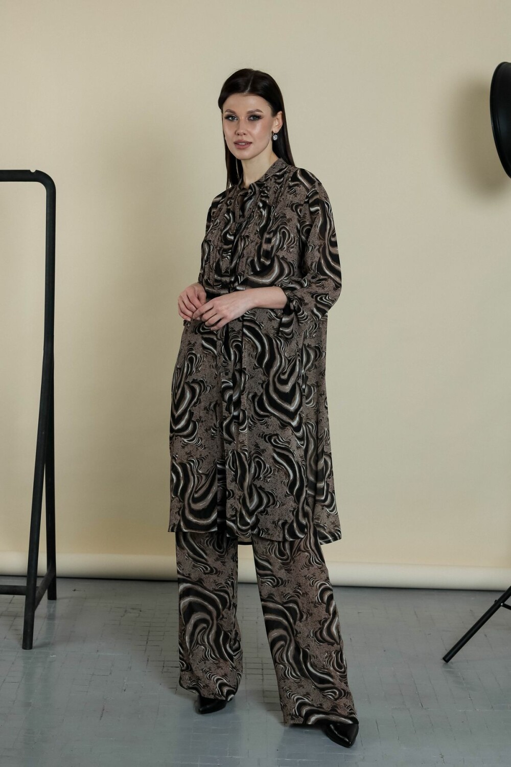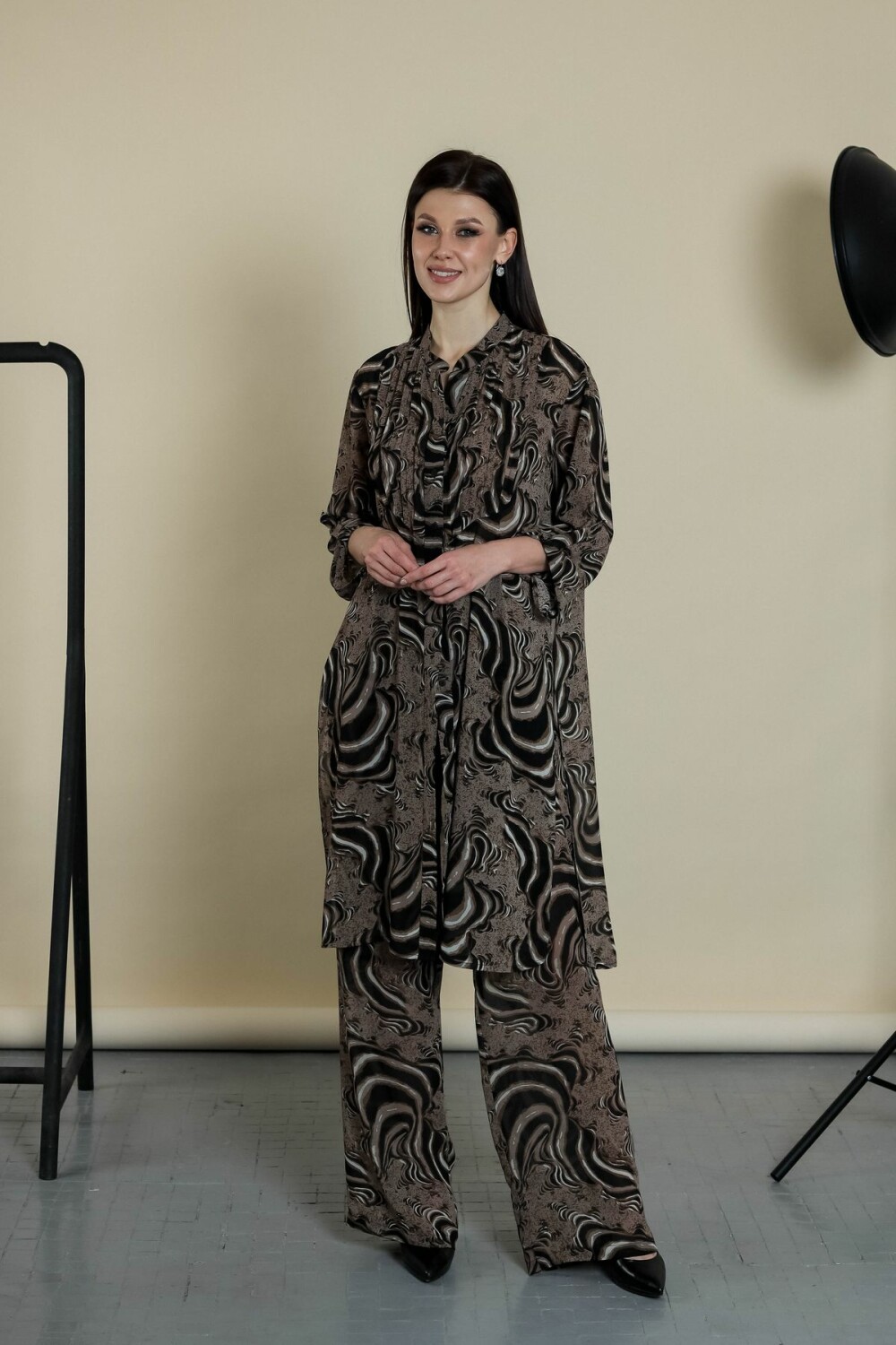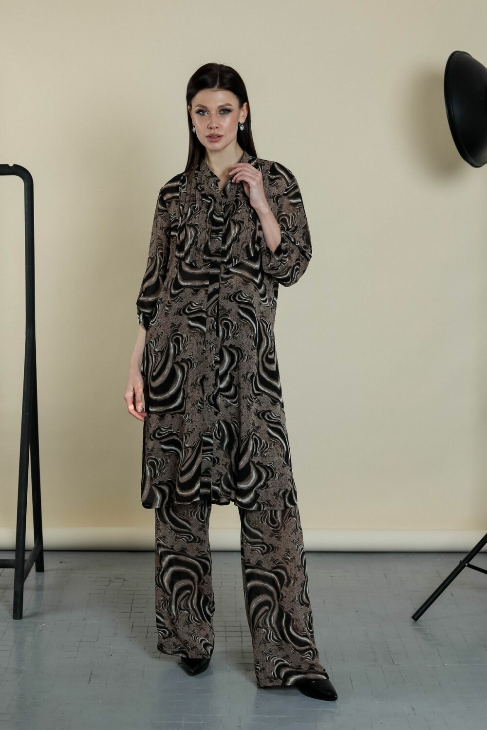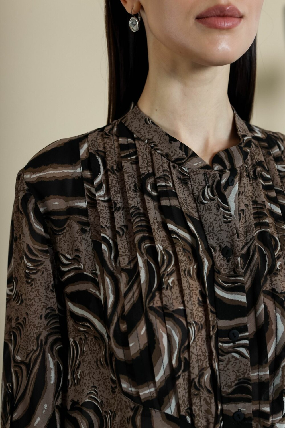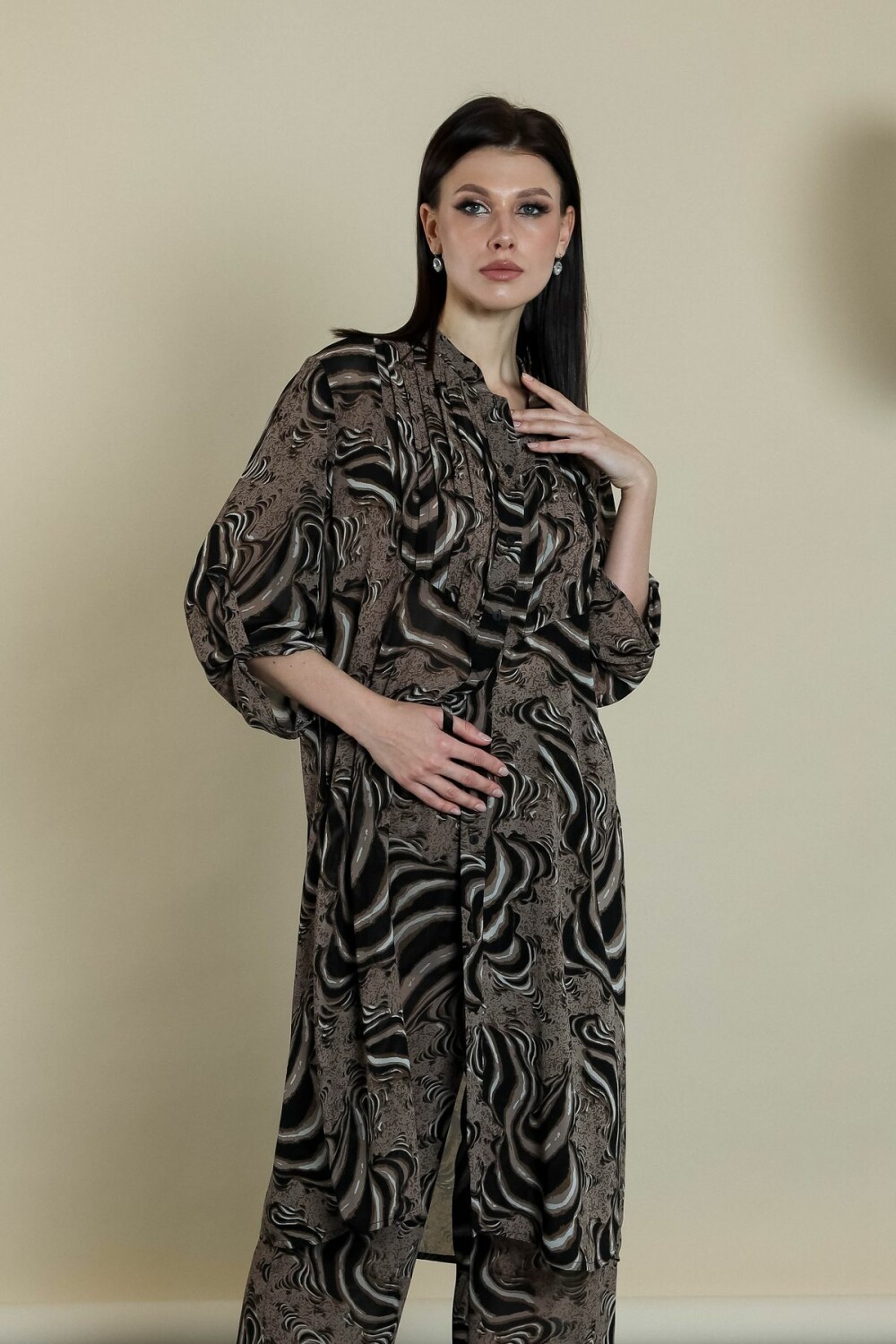 Туника из шифона свободного силуэта. Застежка на пуговицы по всей длине, боковые швы изделия обработаны разрезами.