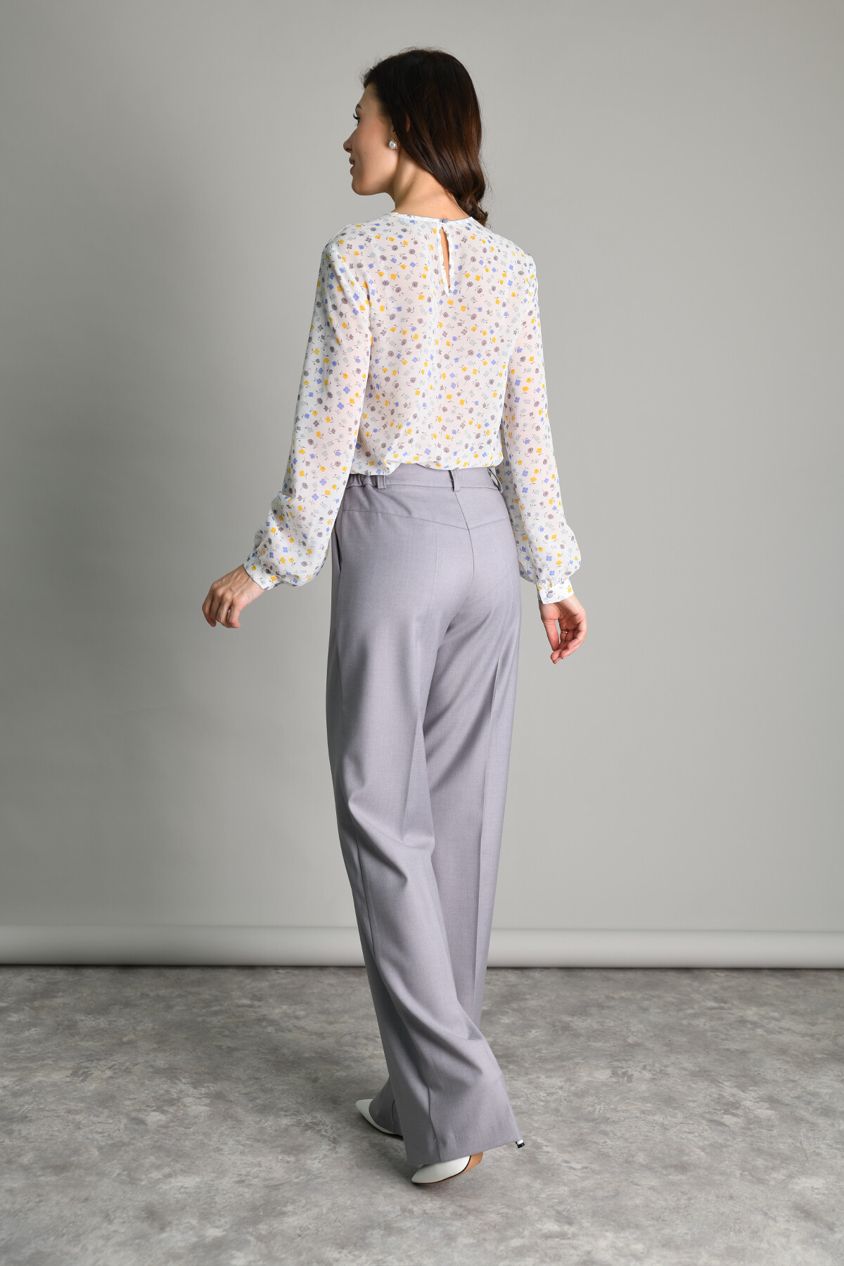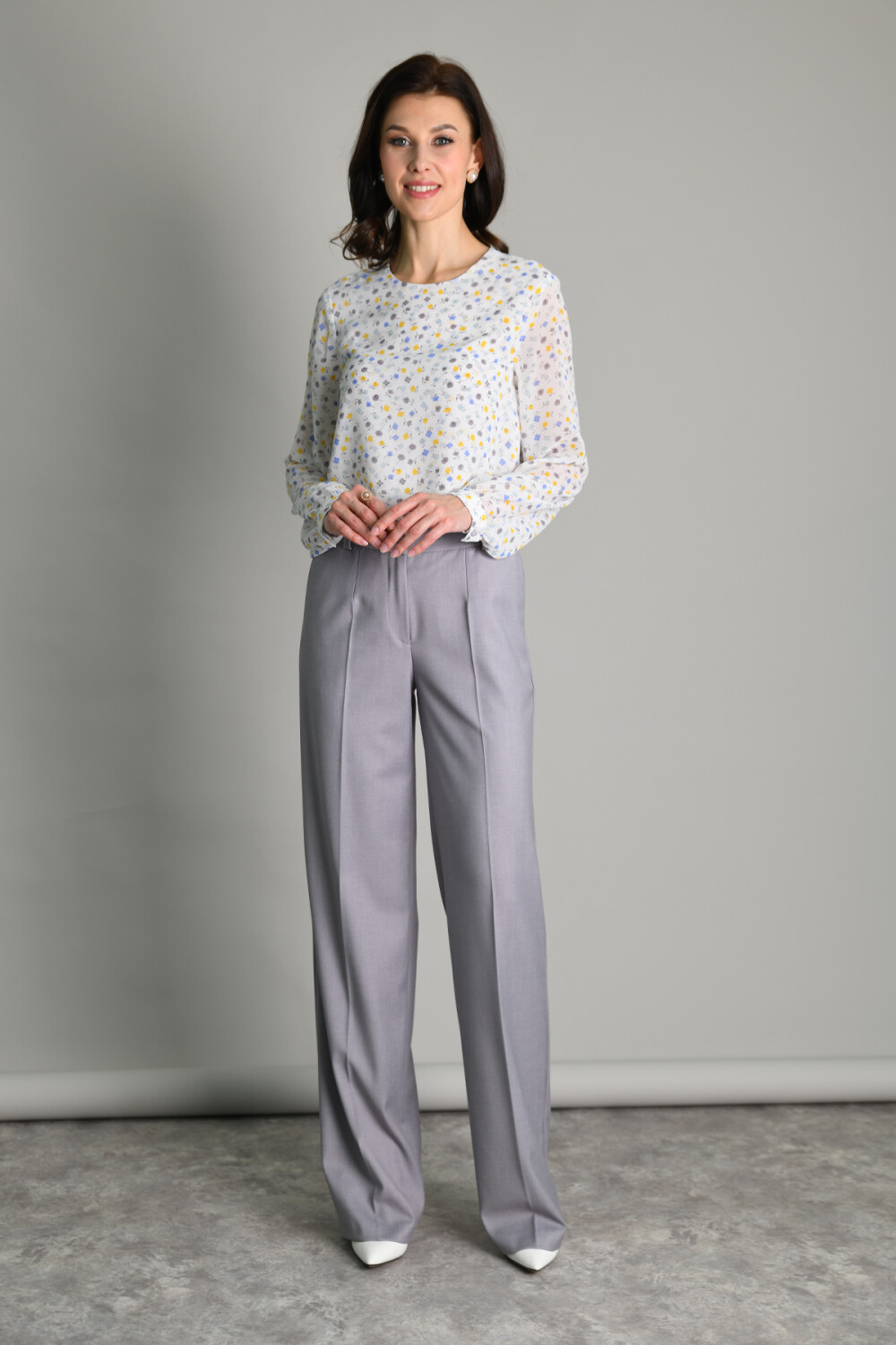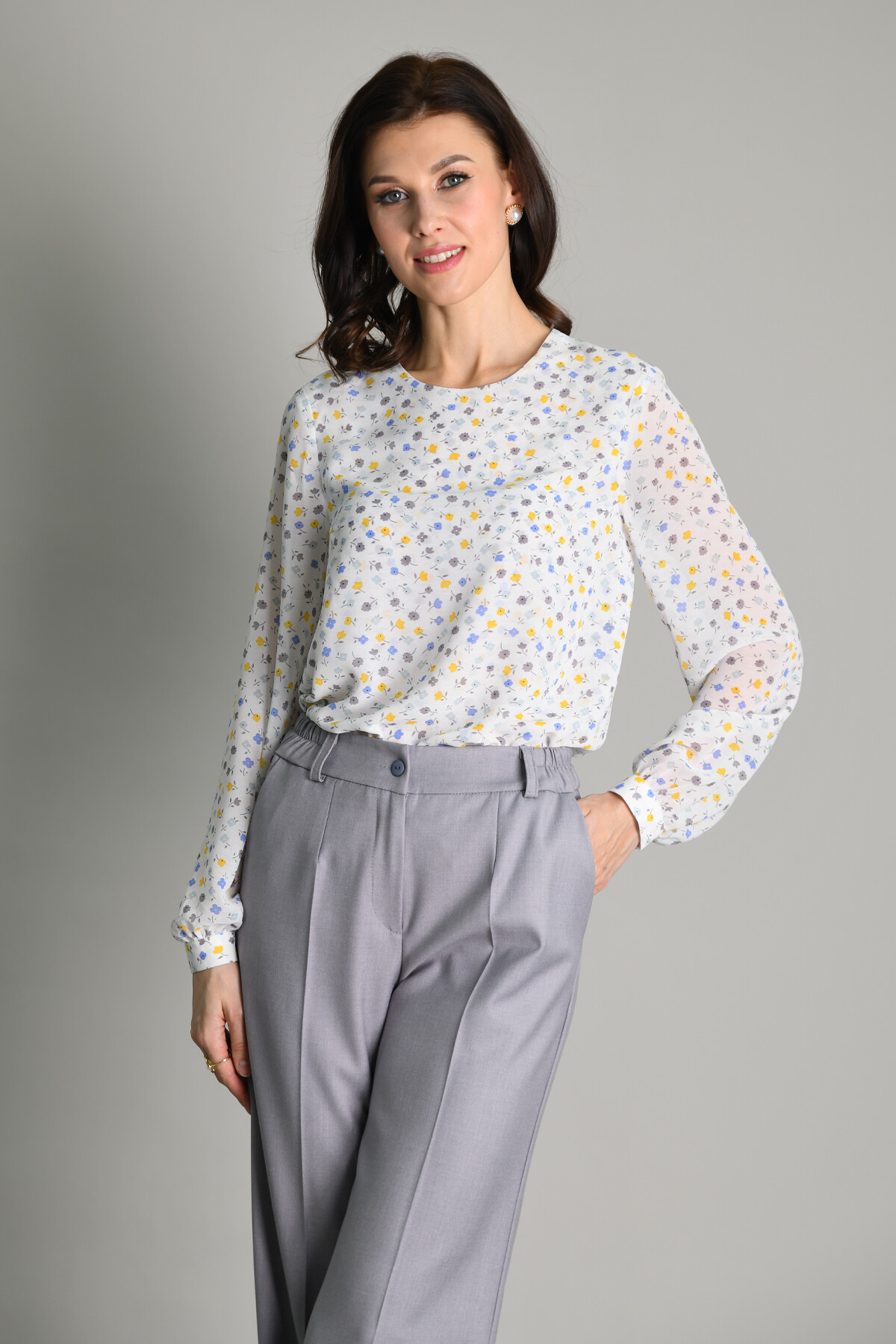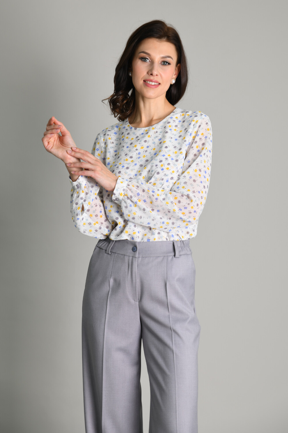 Шифоновая блузка свободного прямого силуэта. Длинный втачной рукав обработан манжетой. Полочка продублирована вторым слоем (не просвечивает). Застежка на спинке на петлю и пуговицу.