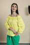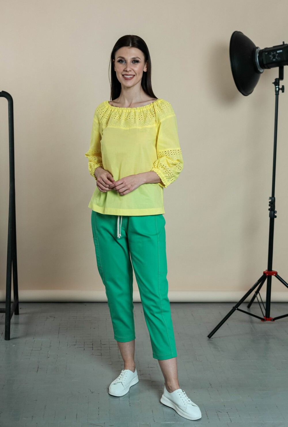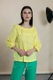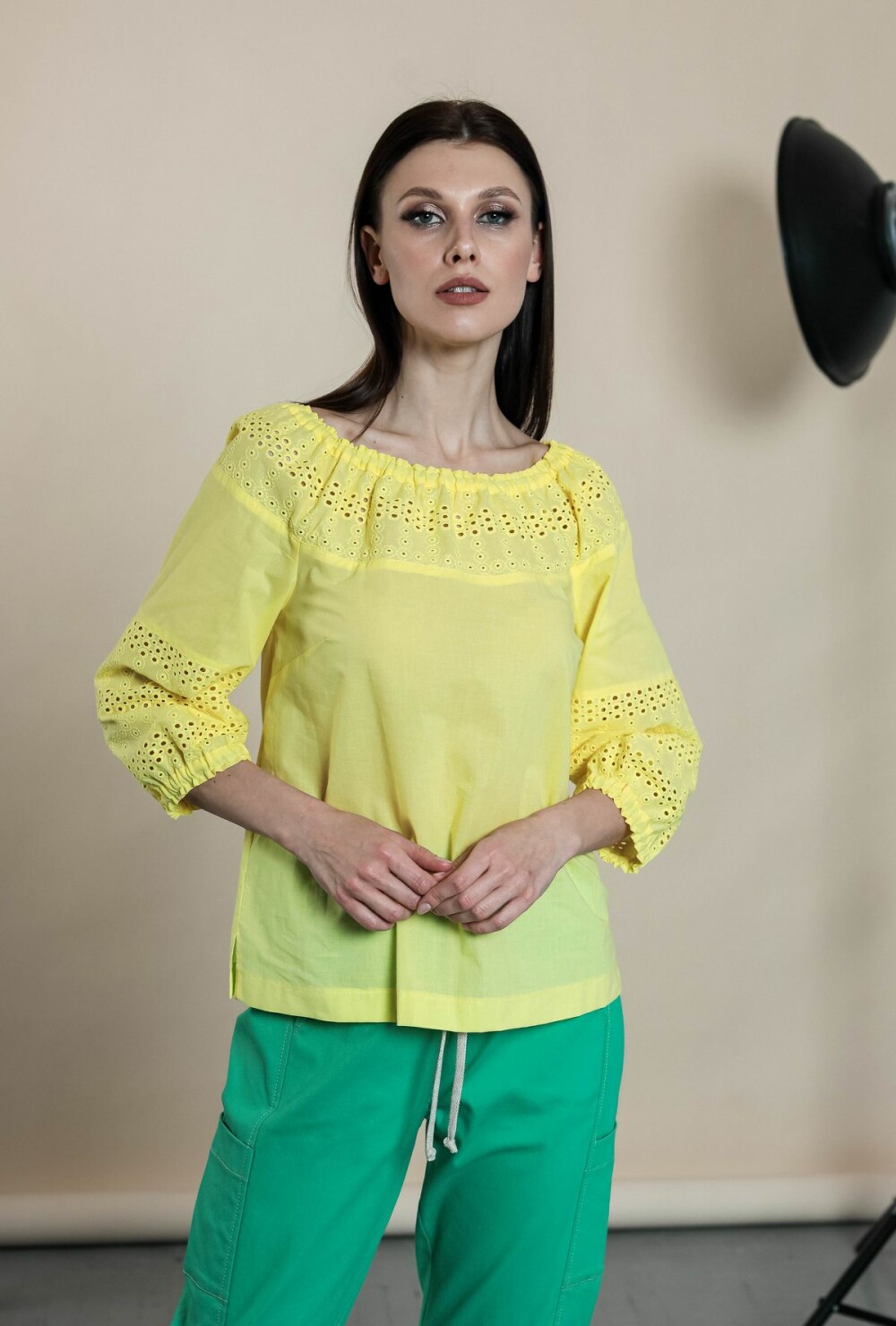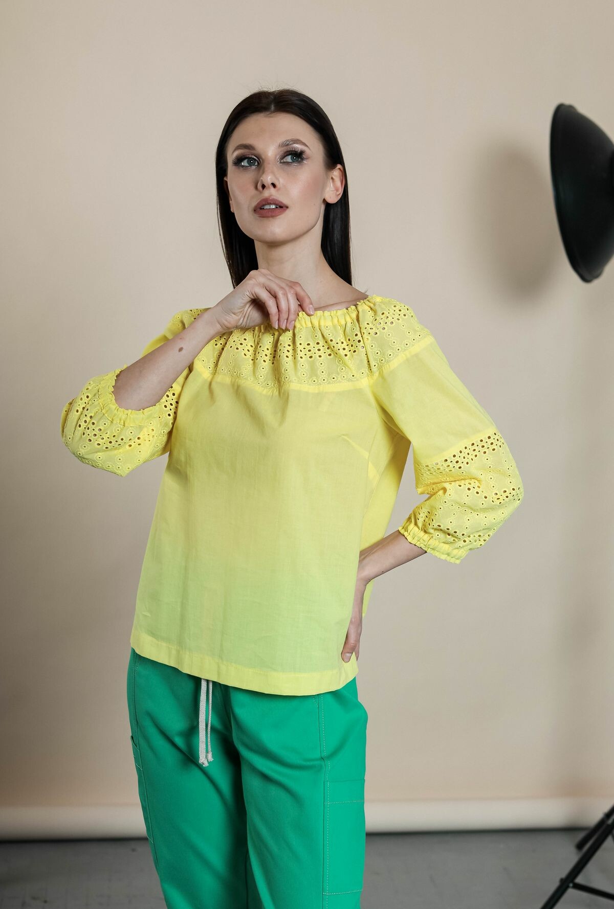 Блузка прямого силуэта. Горловина и манжеты изделия обработаны резинкой. Миниатюрные разрезы в боковых швах. Без застежки.