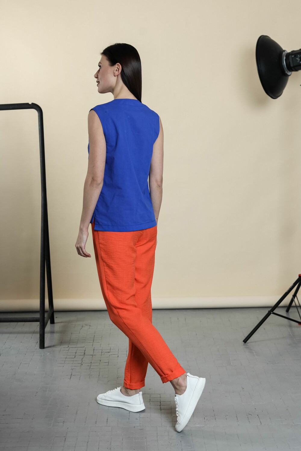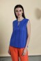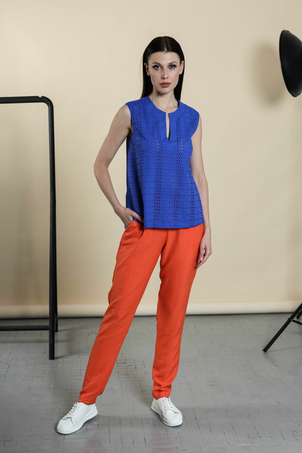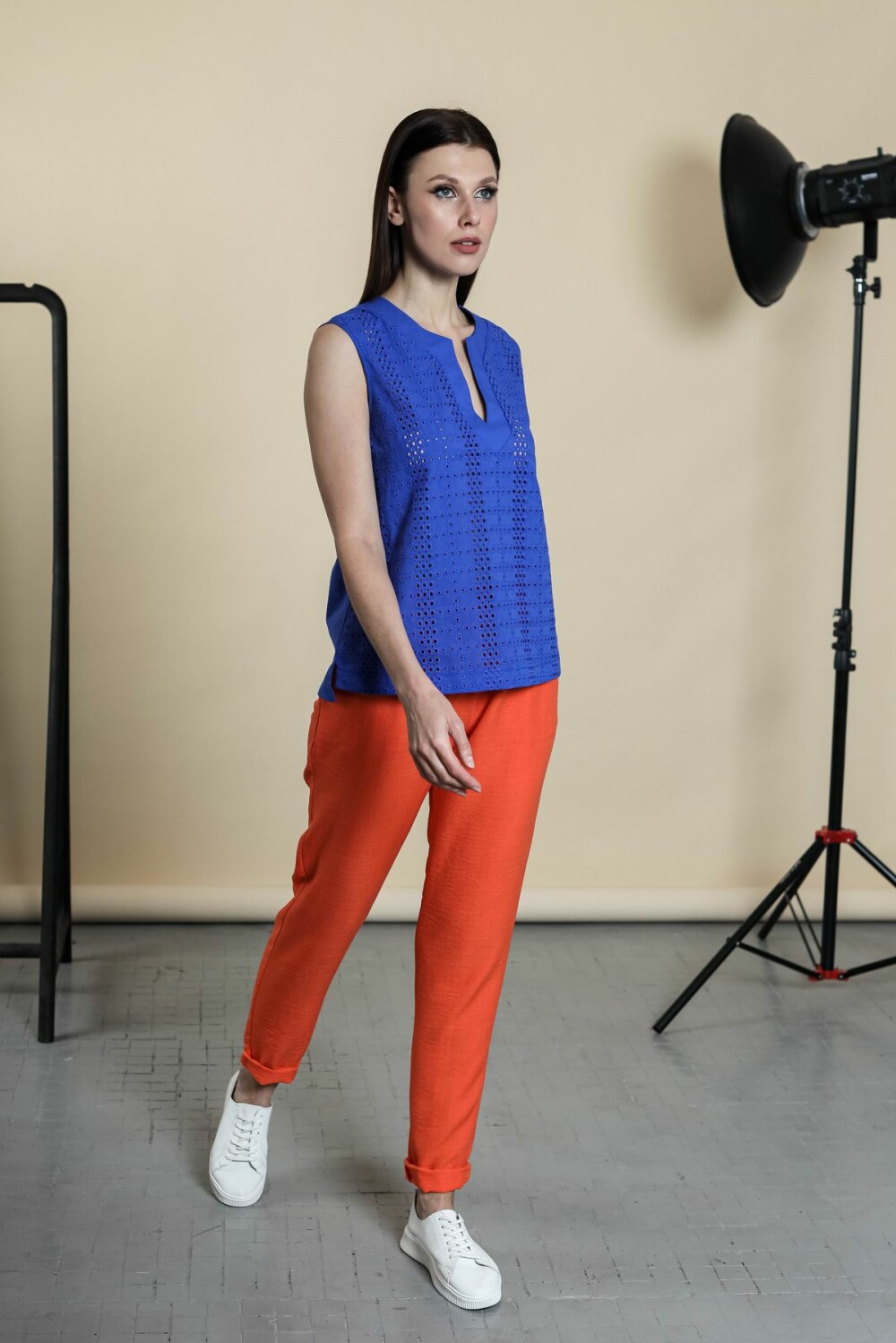 Блузка без рукавов с вырезом-галочкой. Полочка изделия выполнена из шитья, спинка - из глади в тон.