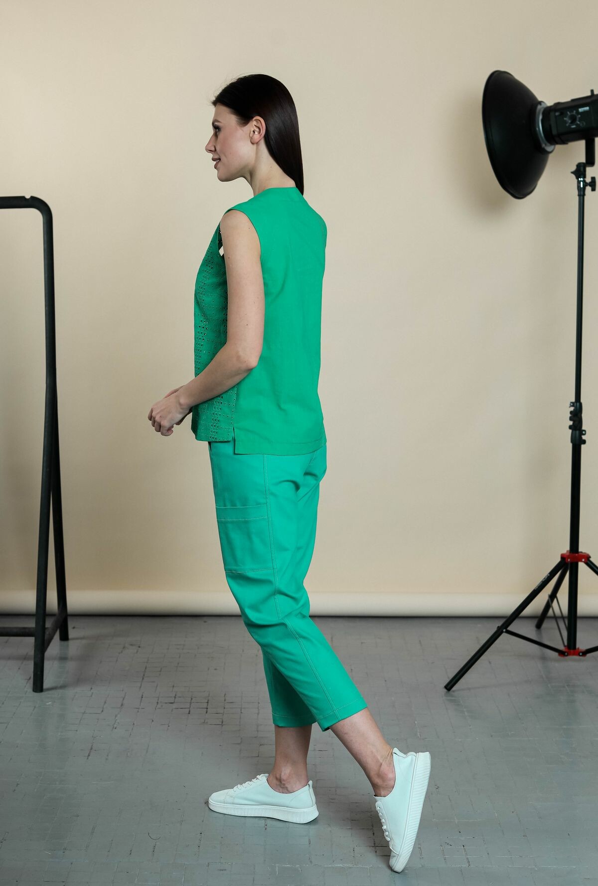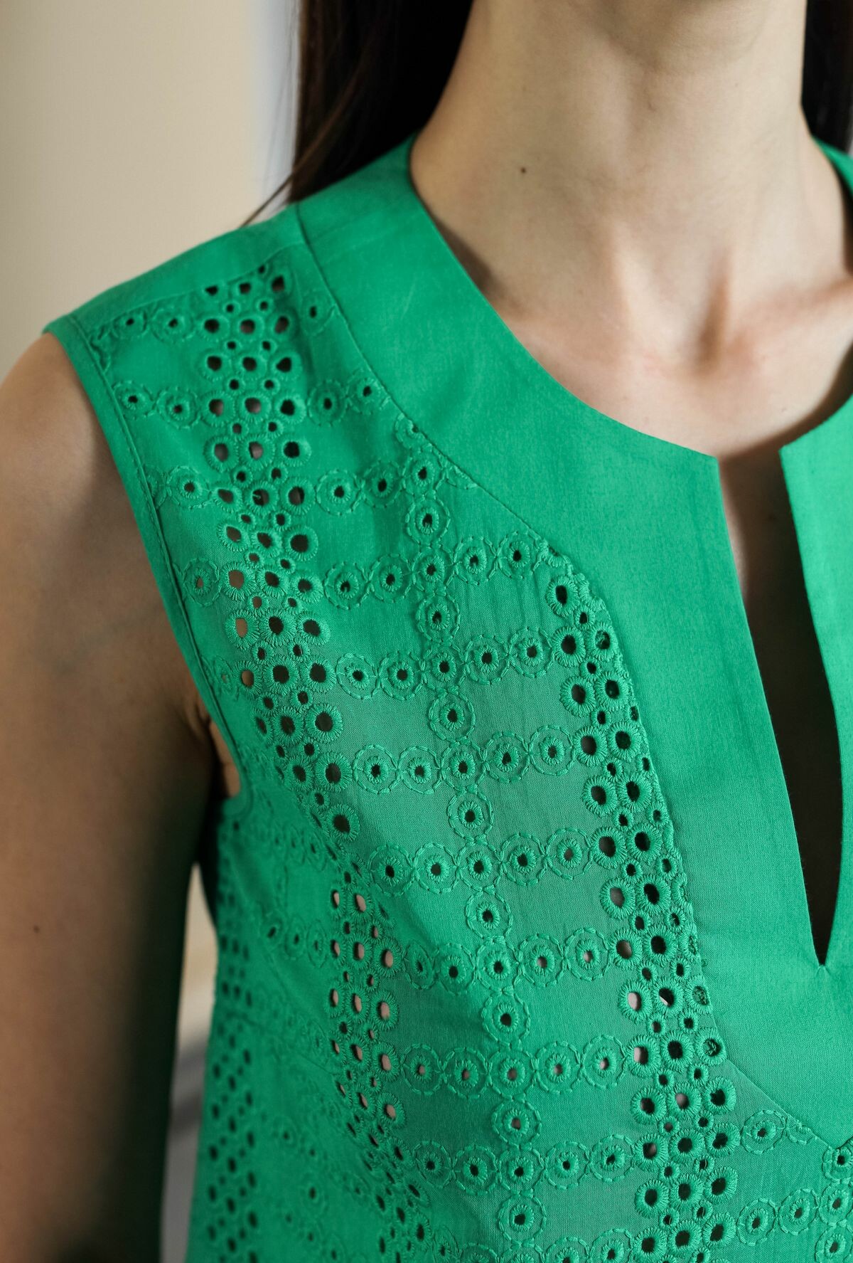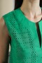 Блузка без рукавов с вырезом-галочкой. Полочка изделия выполнена из шитья, спинка - из глади в тон.