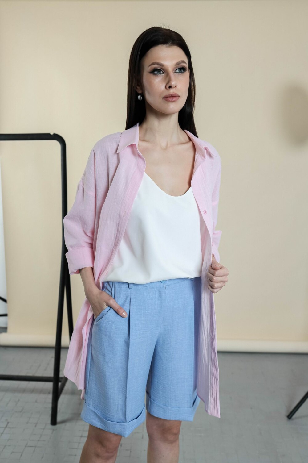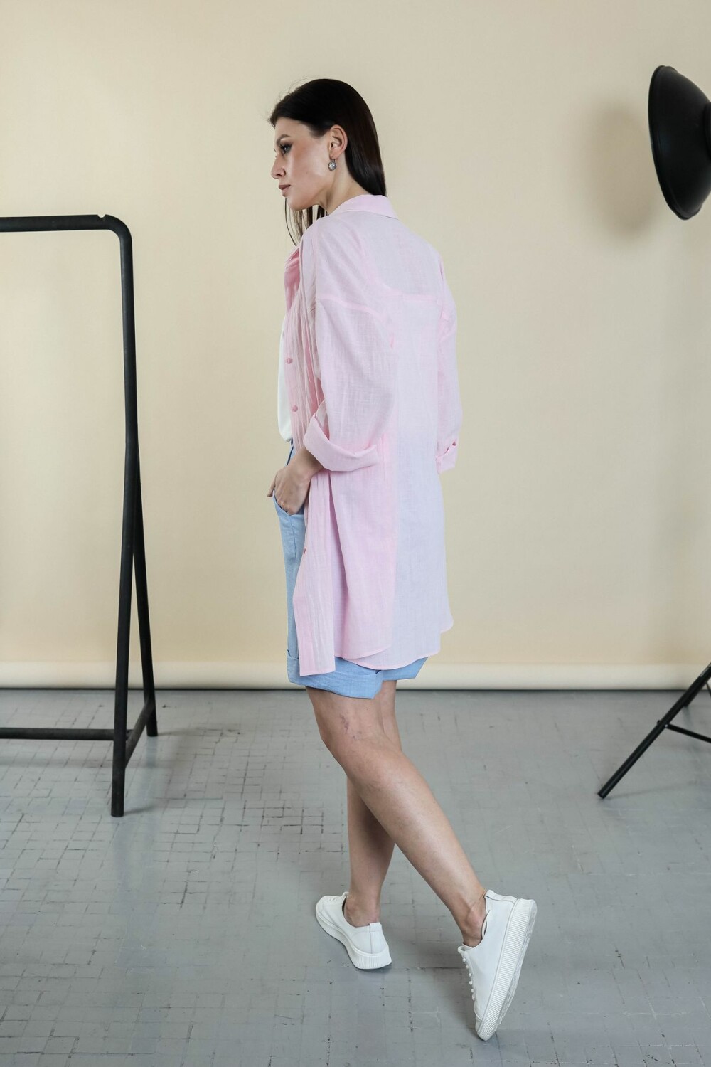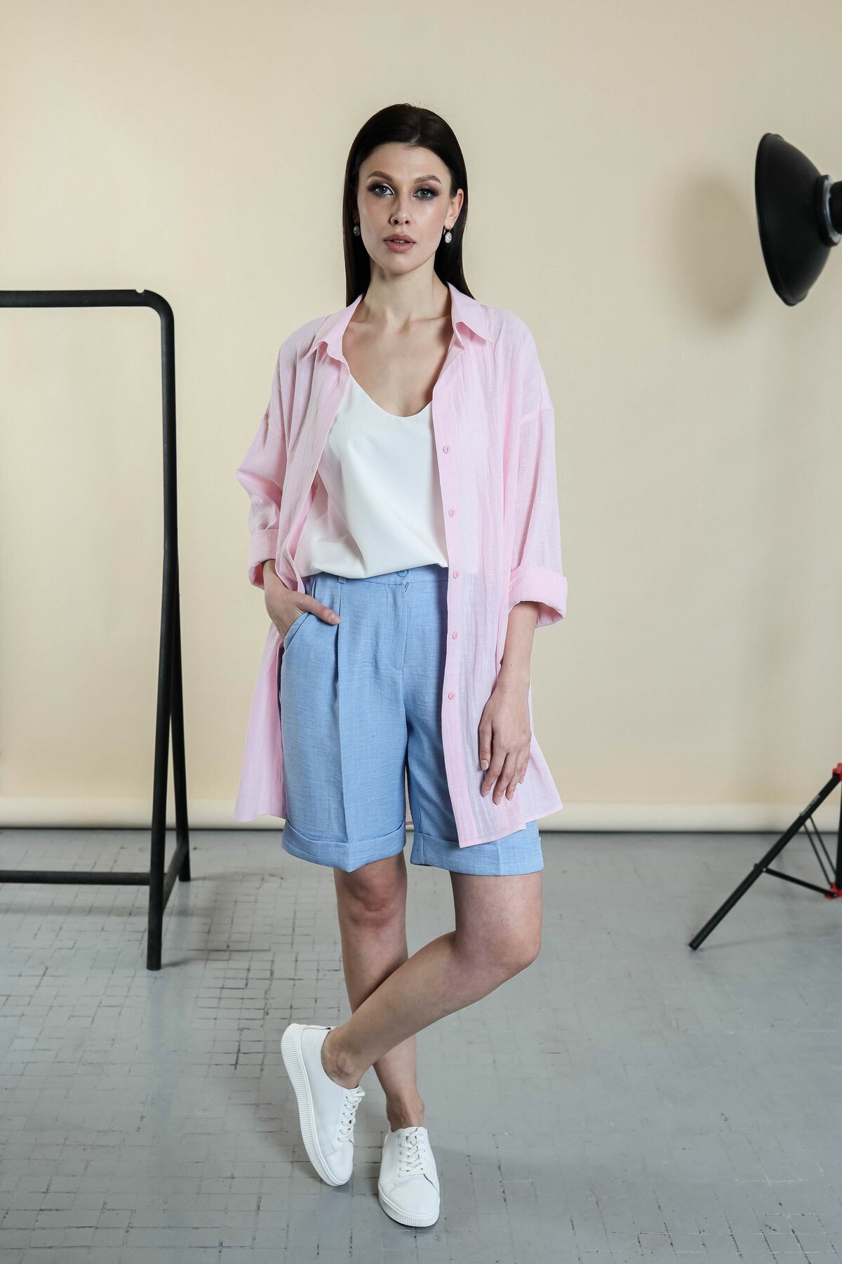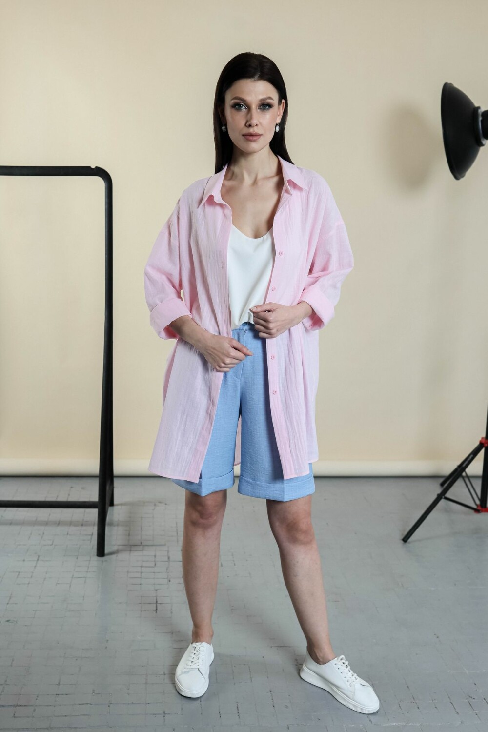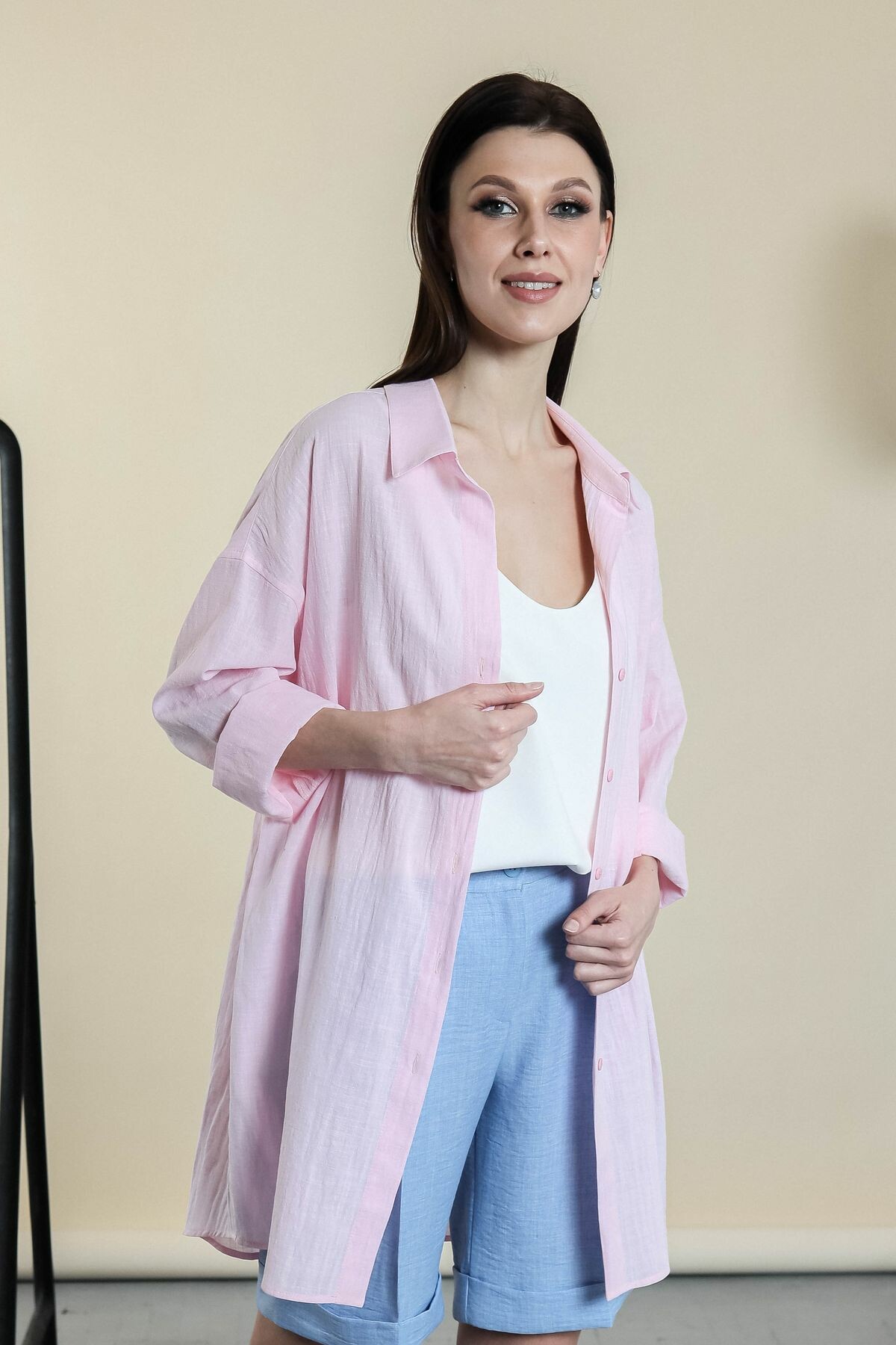 Объемная рубашка-оверсайз. Длинный рукав, отложной воротник, застежка на пуговицы по всей длине.
