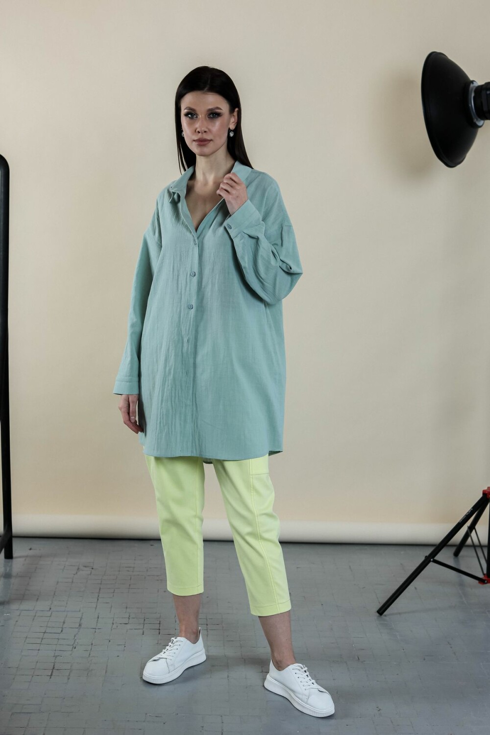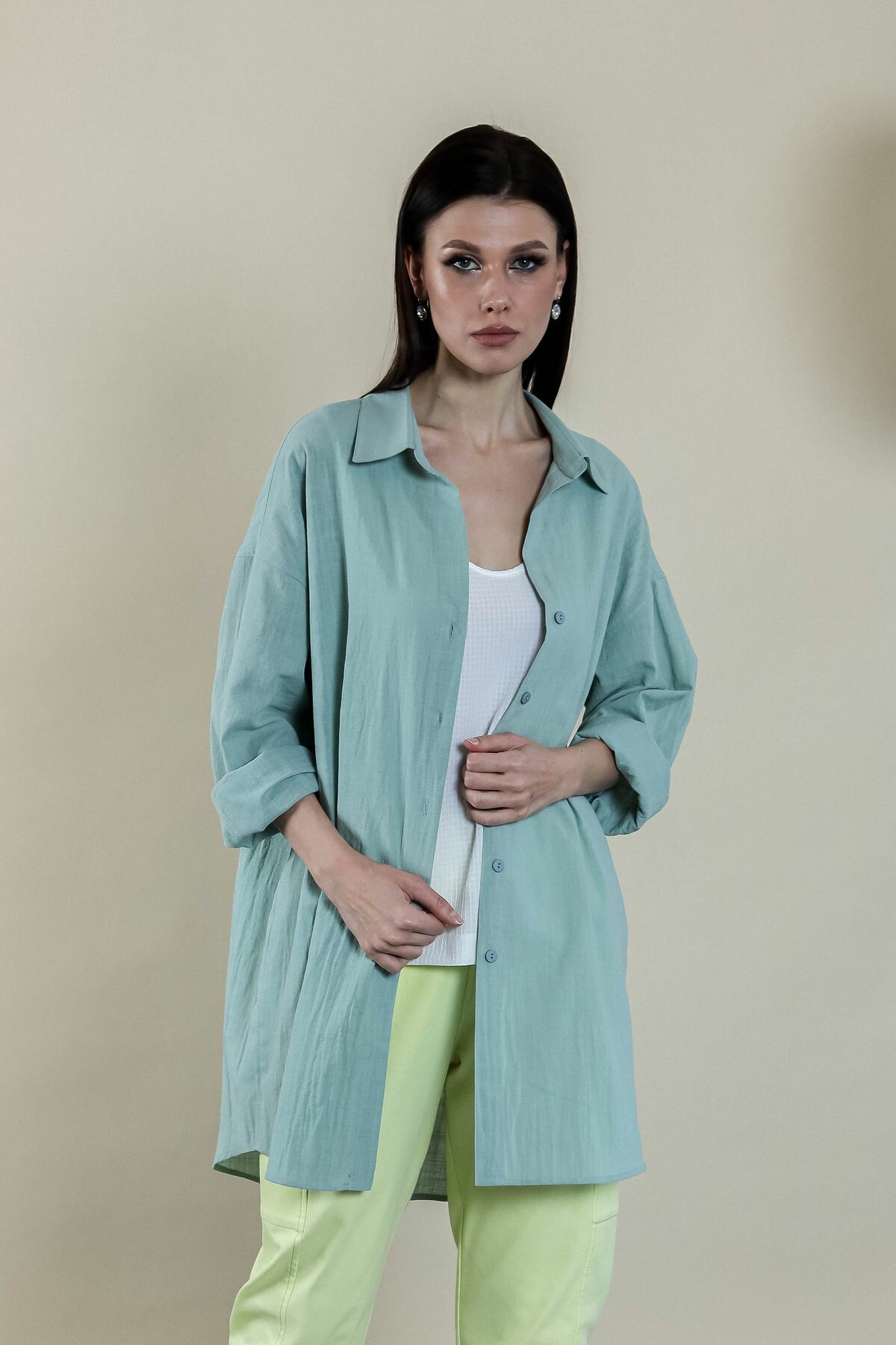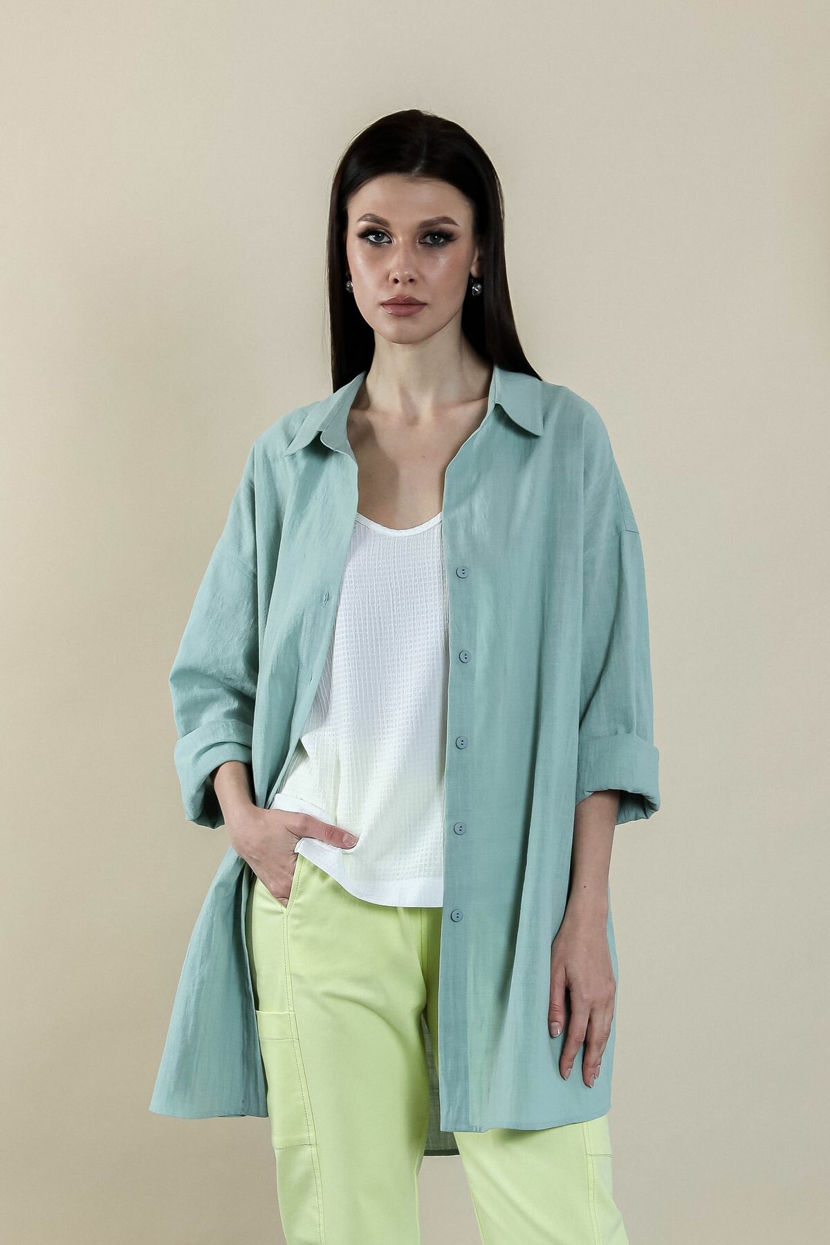 Объемная рубашка-оверсайз. Длинный рукав, отложной воротник, застежка на пуговицы по всей длине.