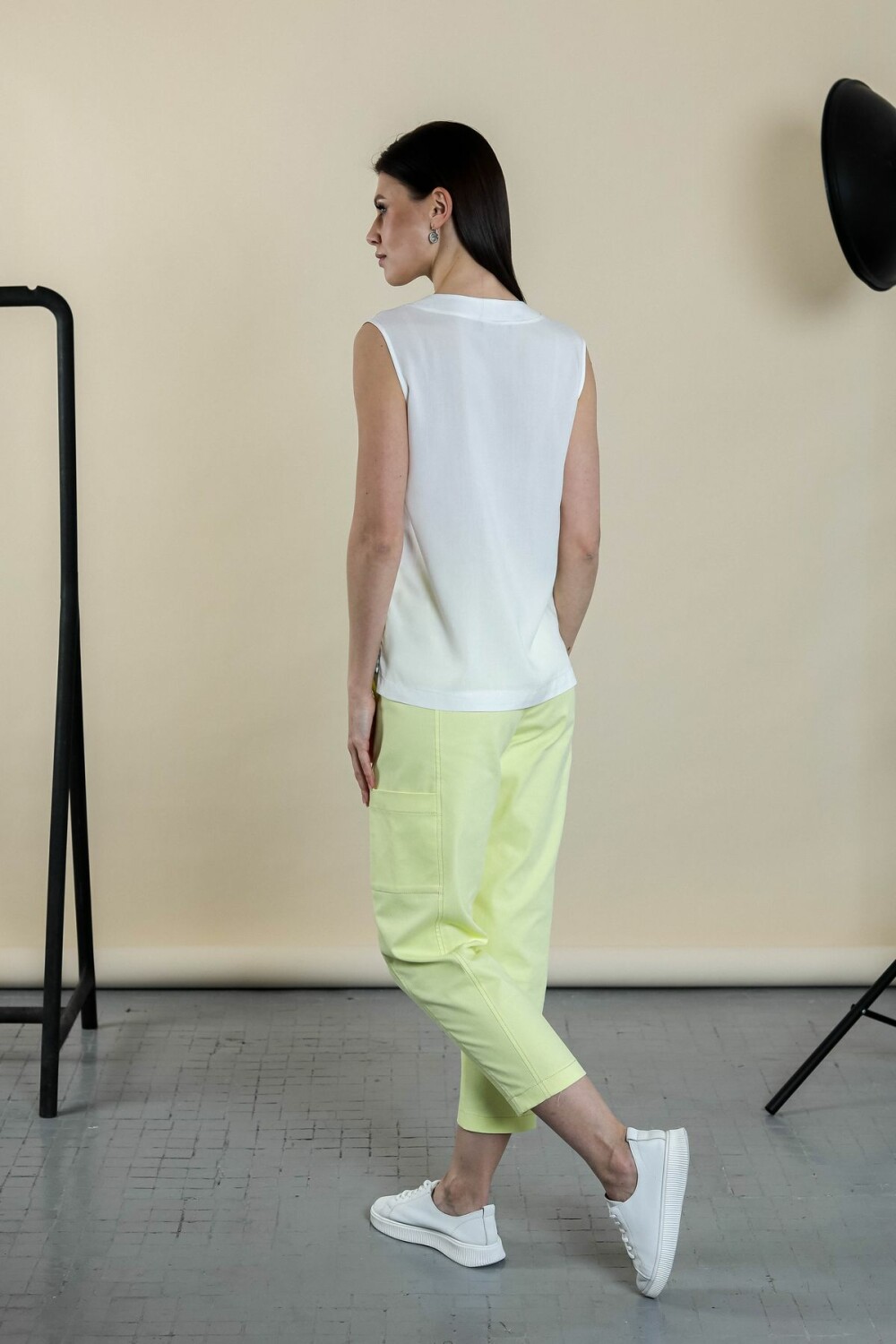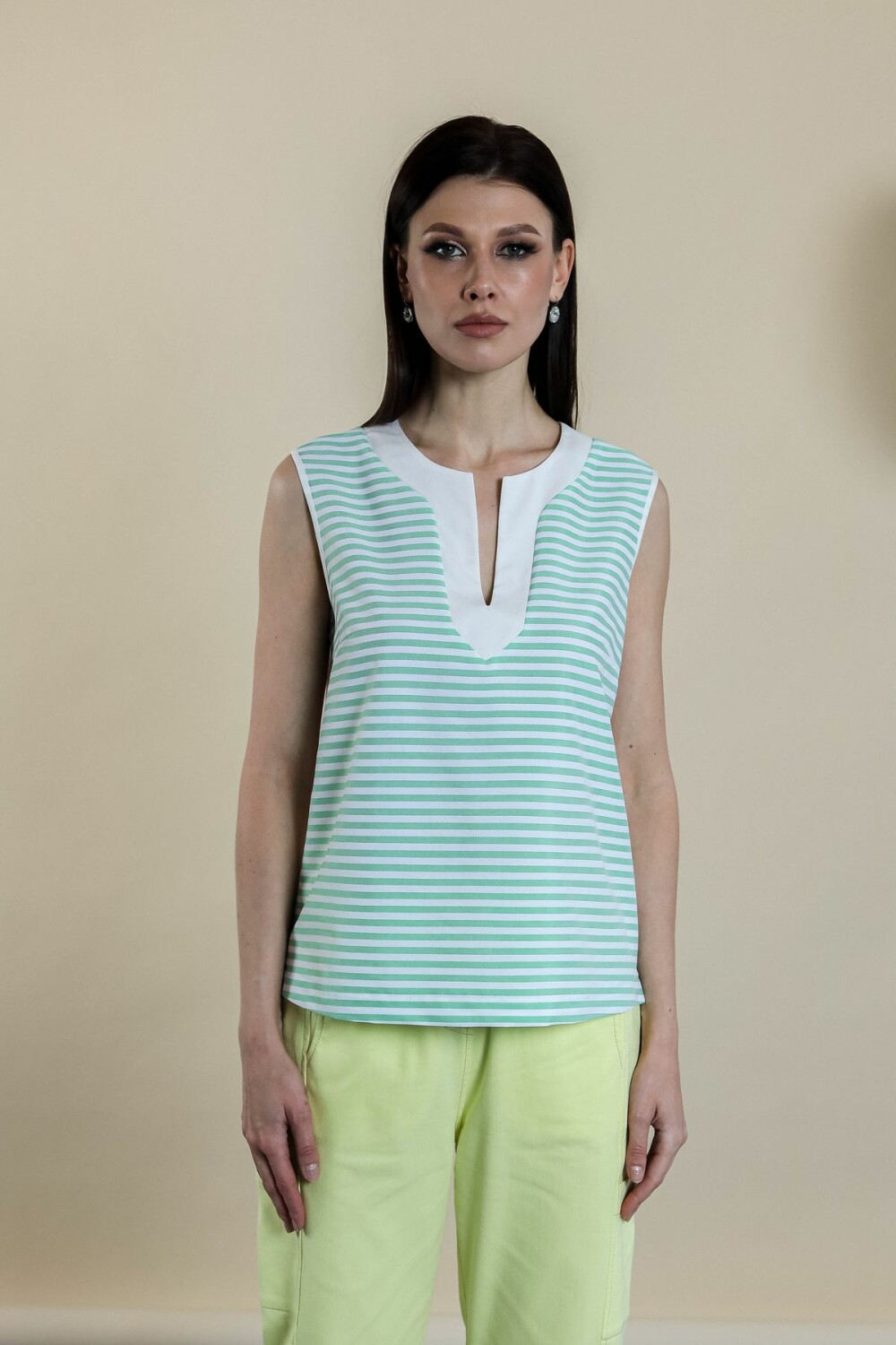 Блузка прямого силуэта. Вырез горловины-галочкой. Спинка из однотонного полотна в тон отделки.