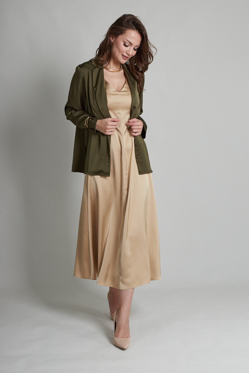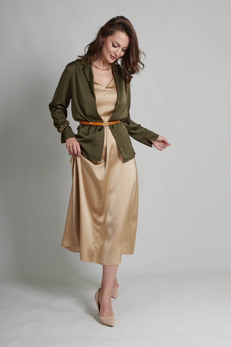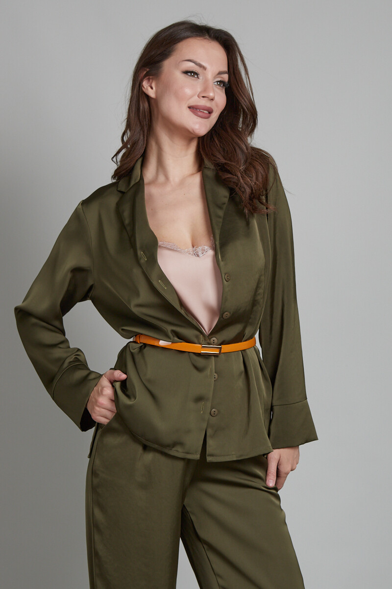 Блуза из атлас-сатина с английским воротничком. Застежка не пуговицы. Низ рукава обработан манжетом с разрезом.