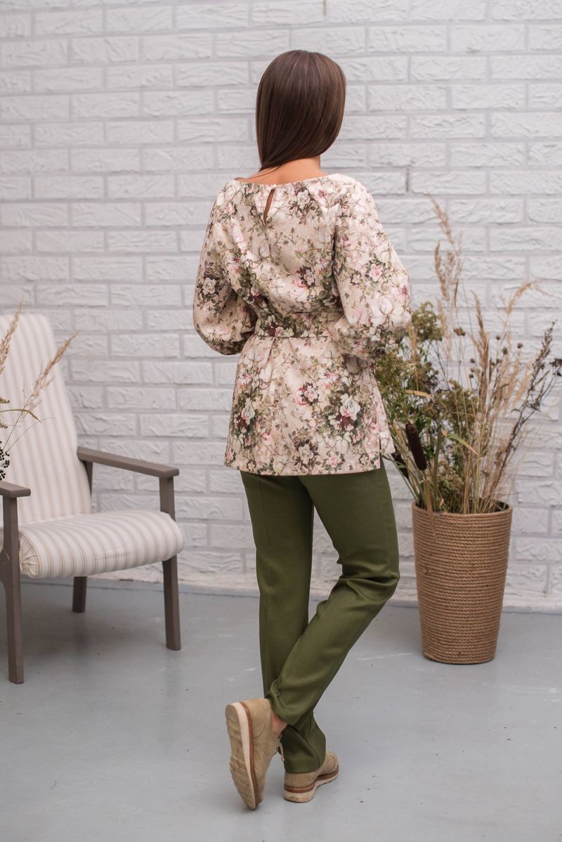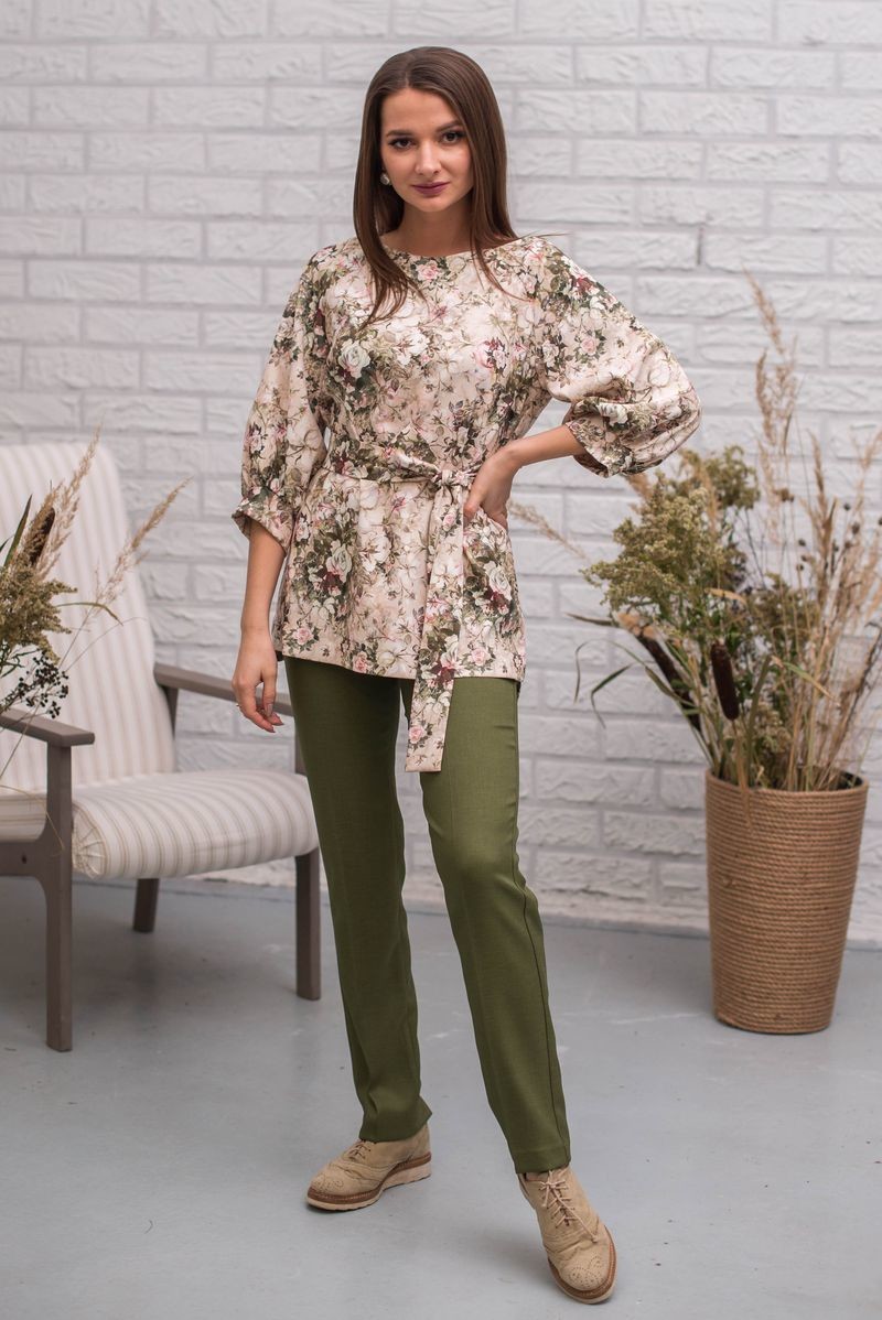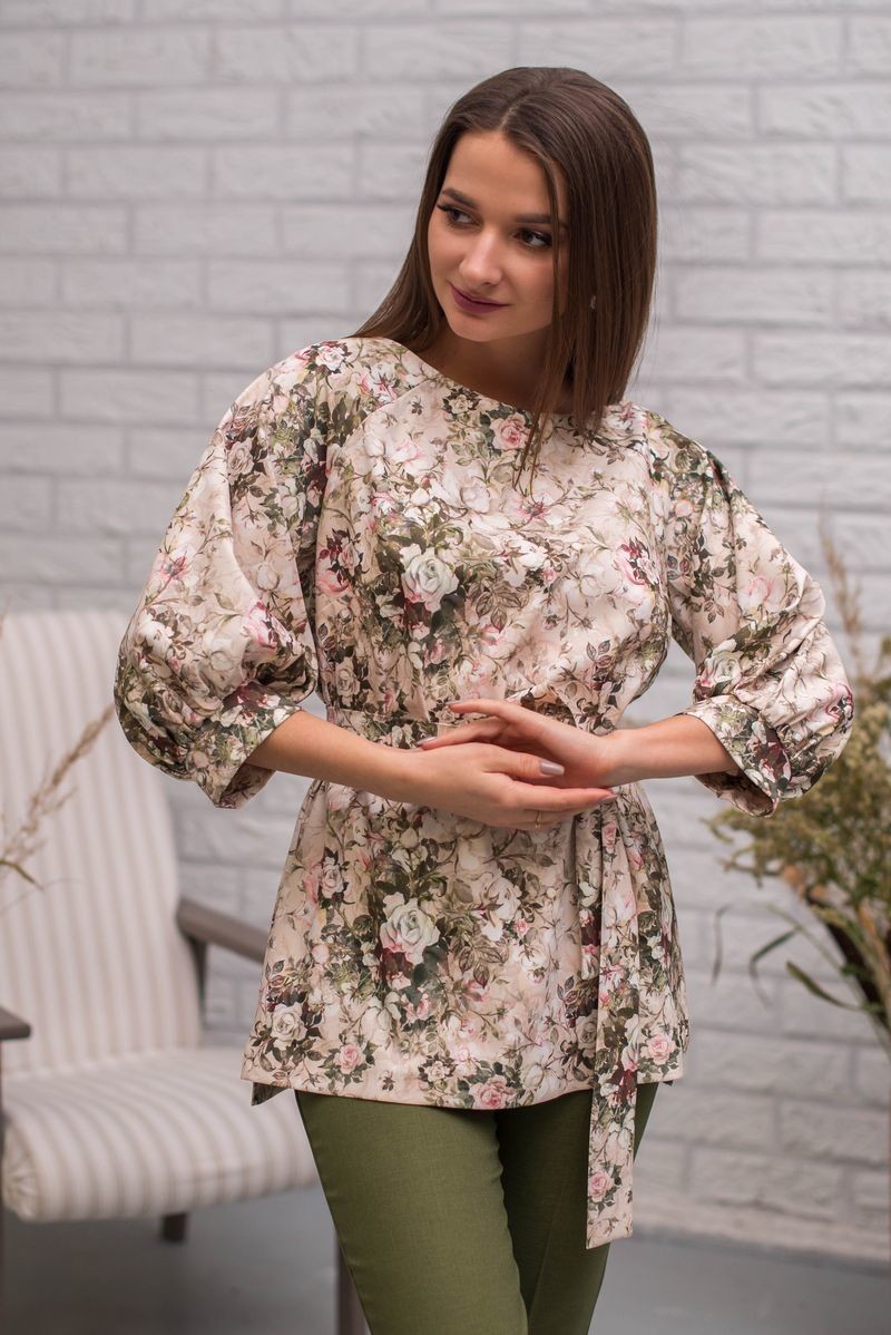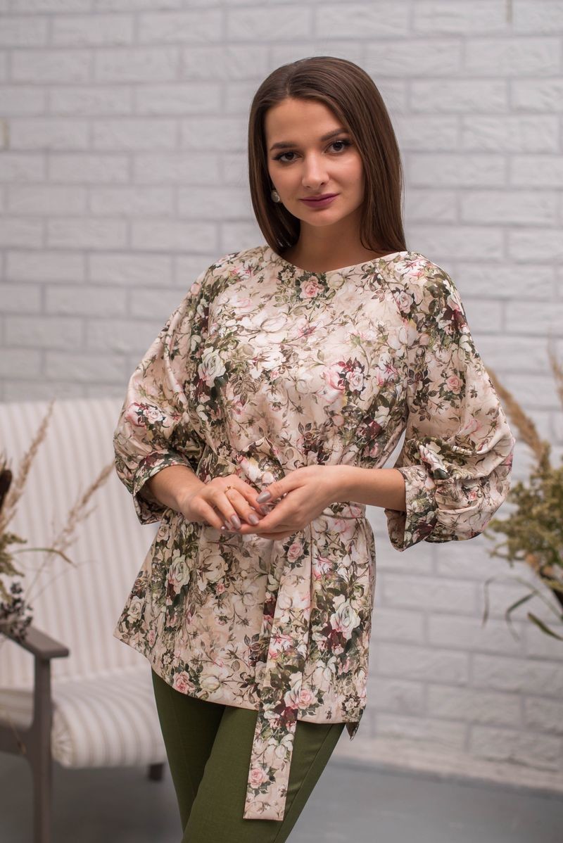 Стильная туника из смесовой ткани. Рукав-реглан, присборенный на манжету. На груди выточки. В комплекте пояс из основного полотна (можно носить и без него). Сзади застежка на потайную молнию. Перепад длины между спинкой и полочкой обработан аккуратным разрезом