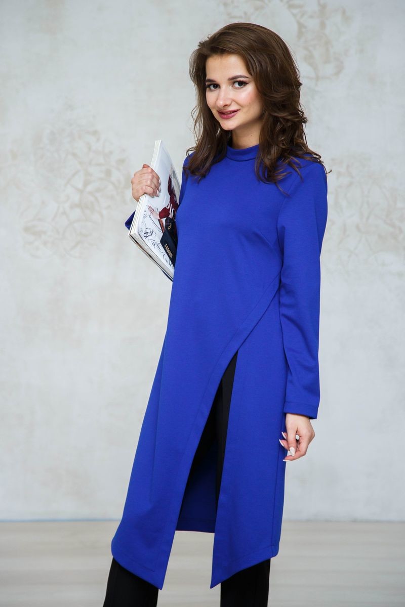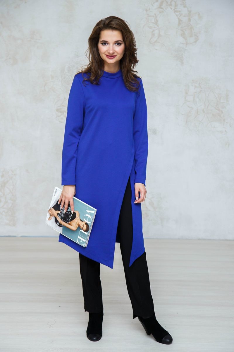 Стильная асимметричная туника из плотного джерси длиной до колена. Рост модели - 164 см. Рукав длинный, воротник-стойка, сзади застежка на потайную молнию. С левой стороны эффектный асимметричный разрез.Туника выглядит очень оригинально и поможет создать самые неожиданные фантазийные образы!