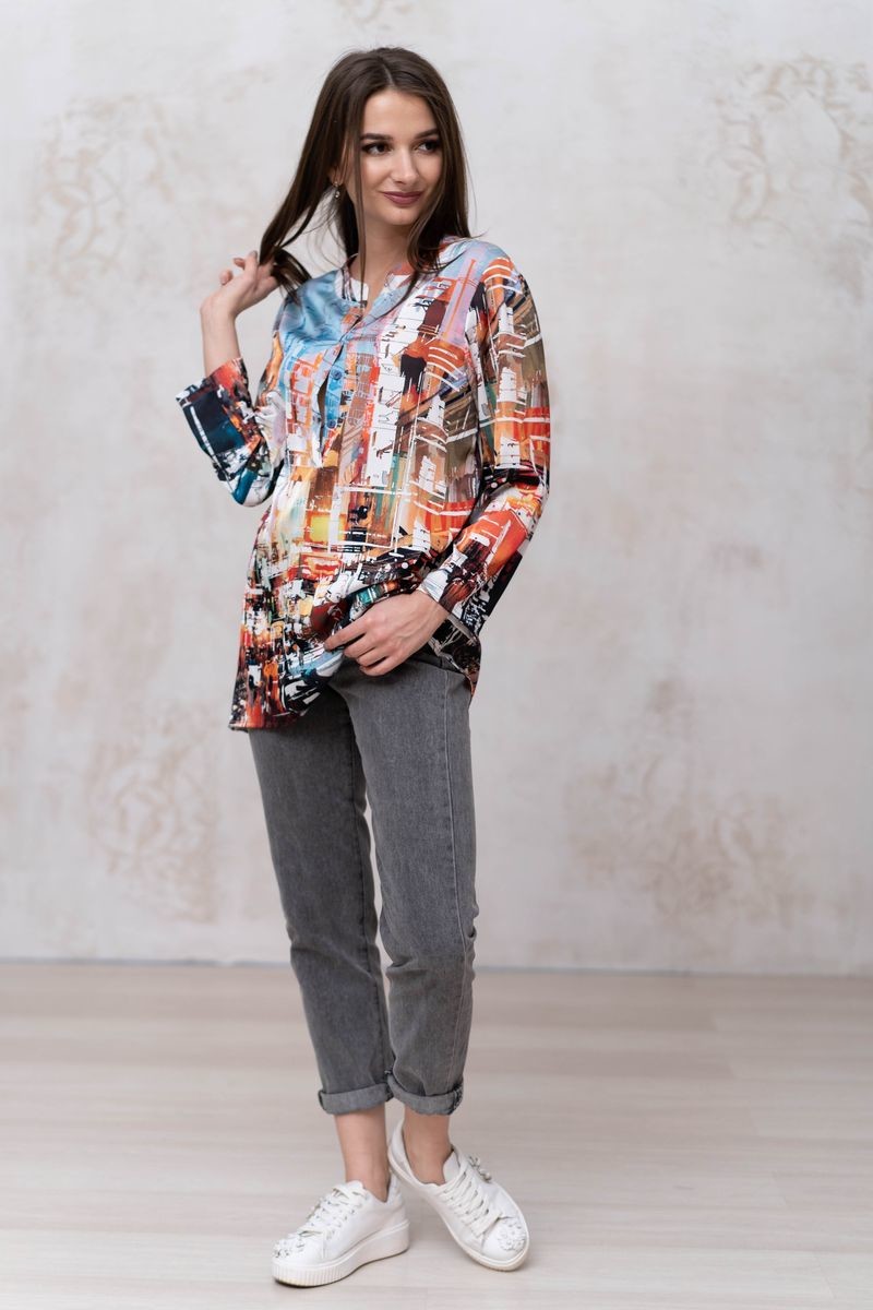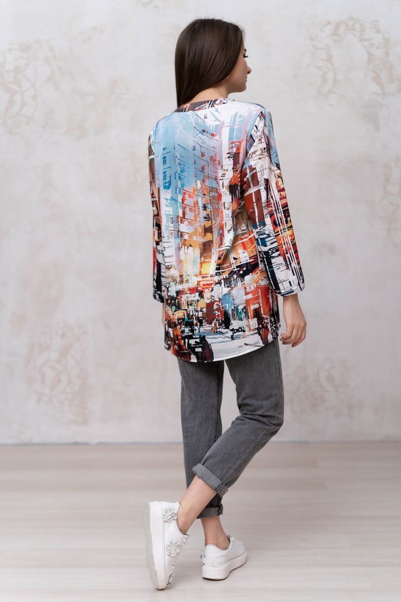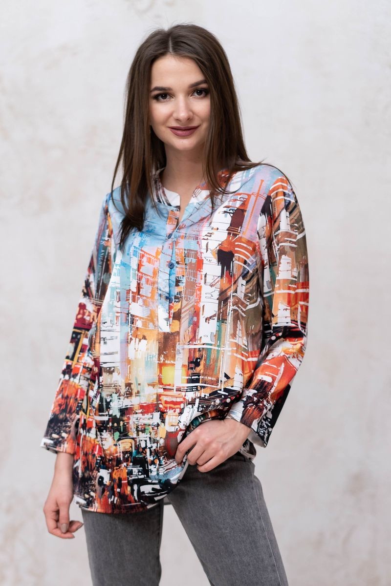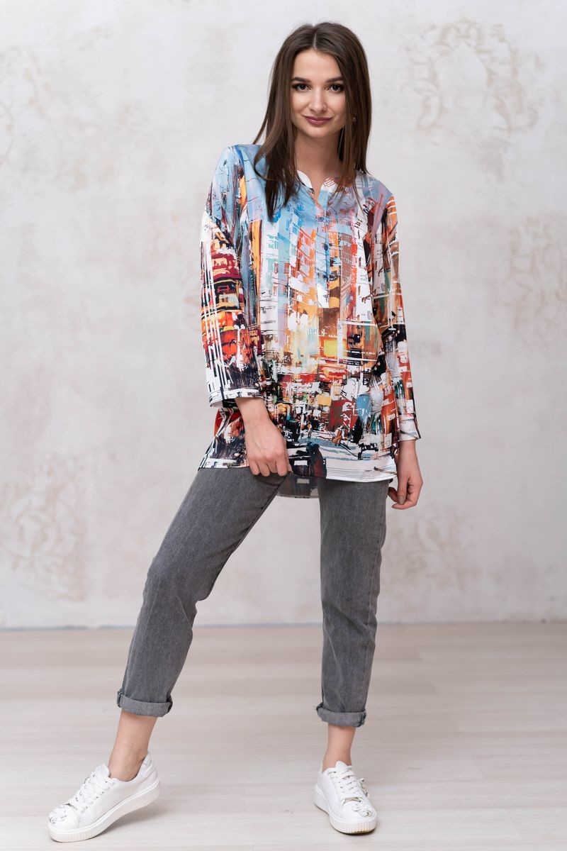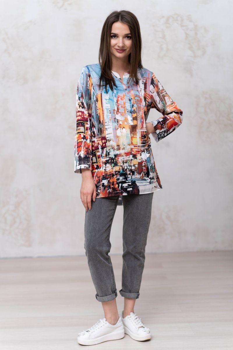 Туника свободного прямого силуэта. Застежка-поло, воротник-стойка, втачной рукав. Боковые швы изделия обработаны разрезами.