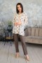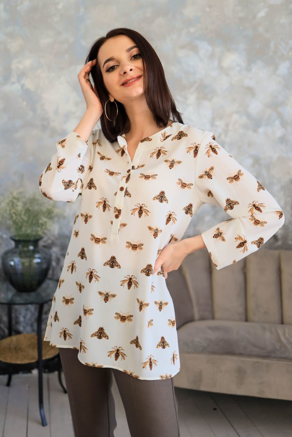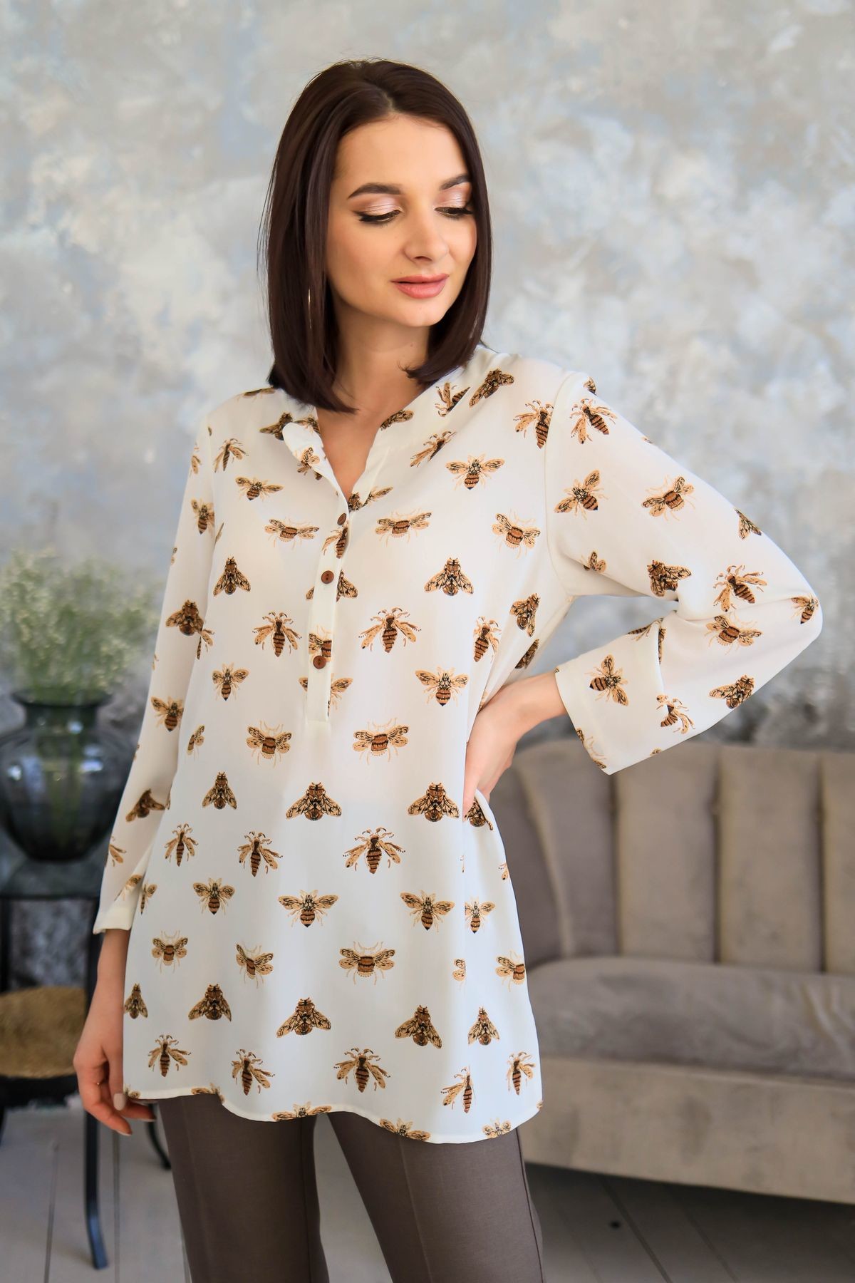 Туника свободного прямого силуэта. Застежка-поло, воротник-стойка, втачной рукав. Боковые швы изделия обработаны разрезами.