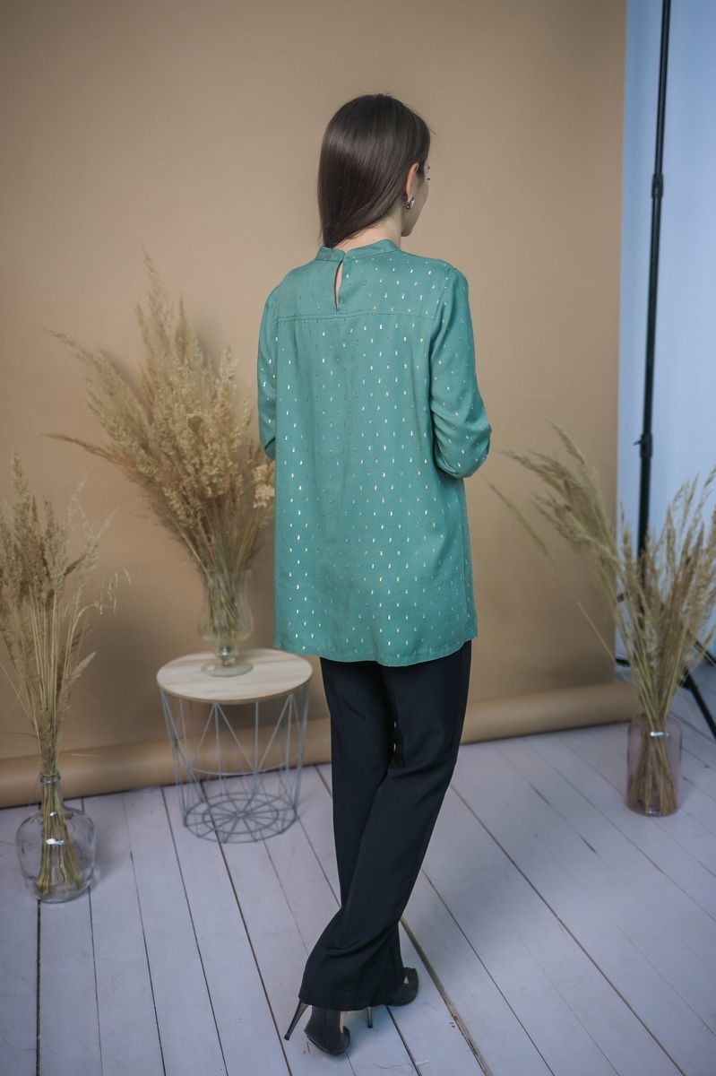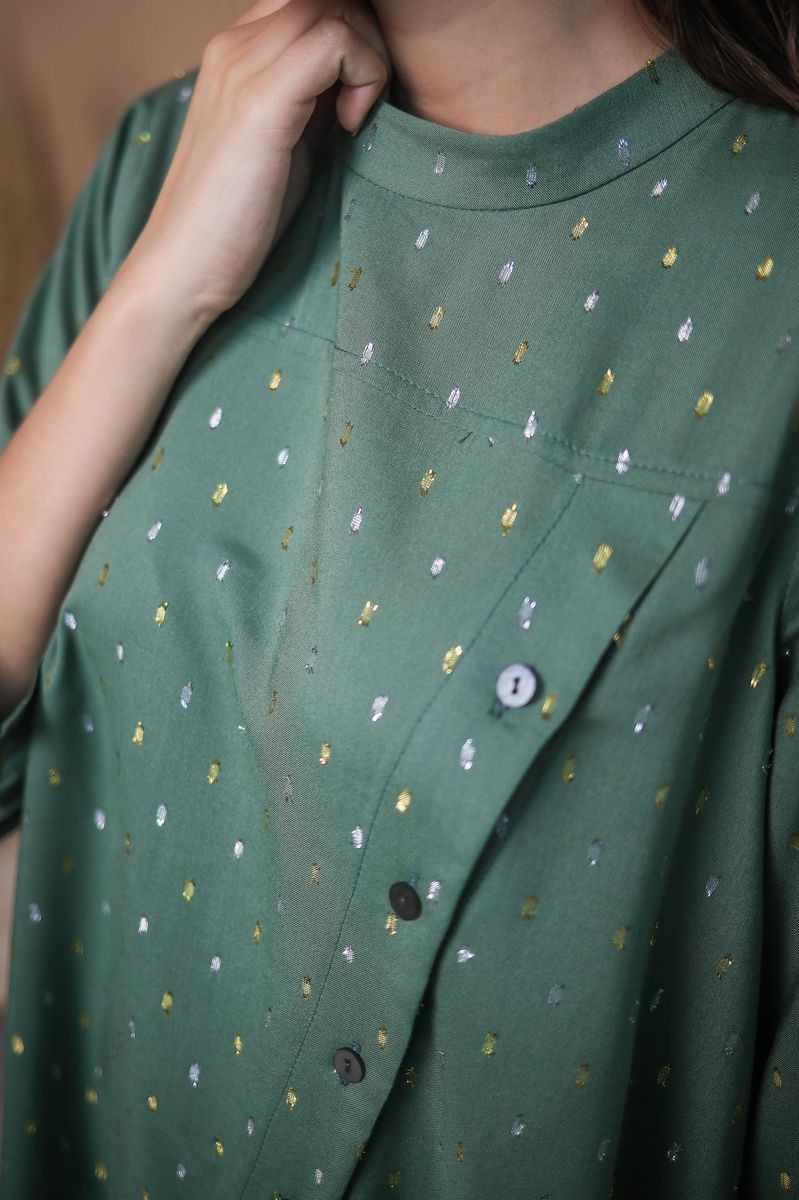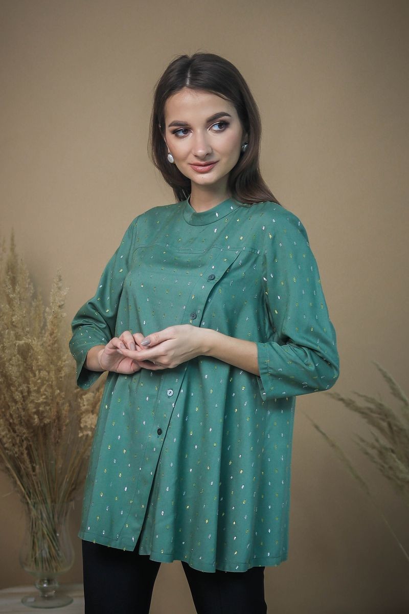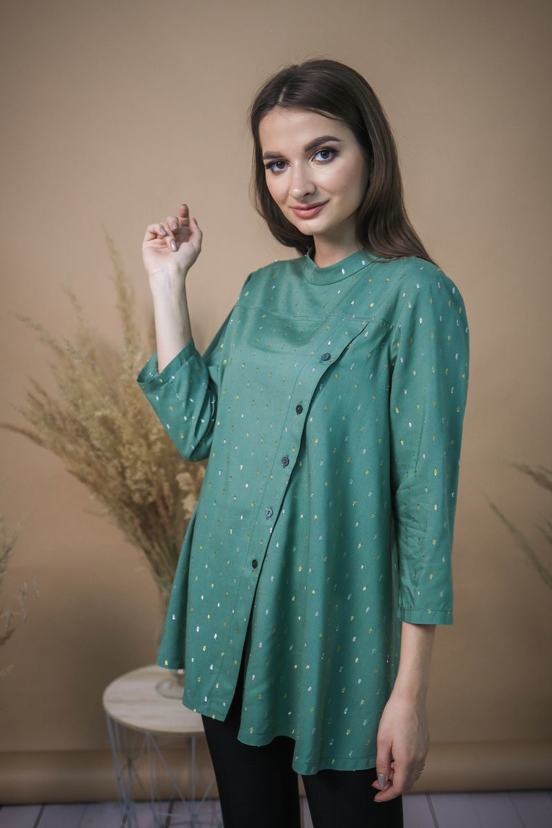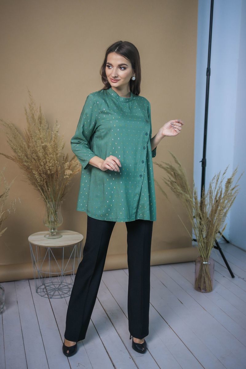 Туника с ассиметричной застежкой на пуговицы свсободного силуэта. Втачной рукав, воротник-стойка.