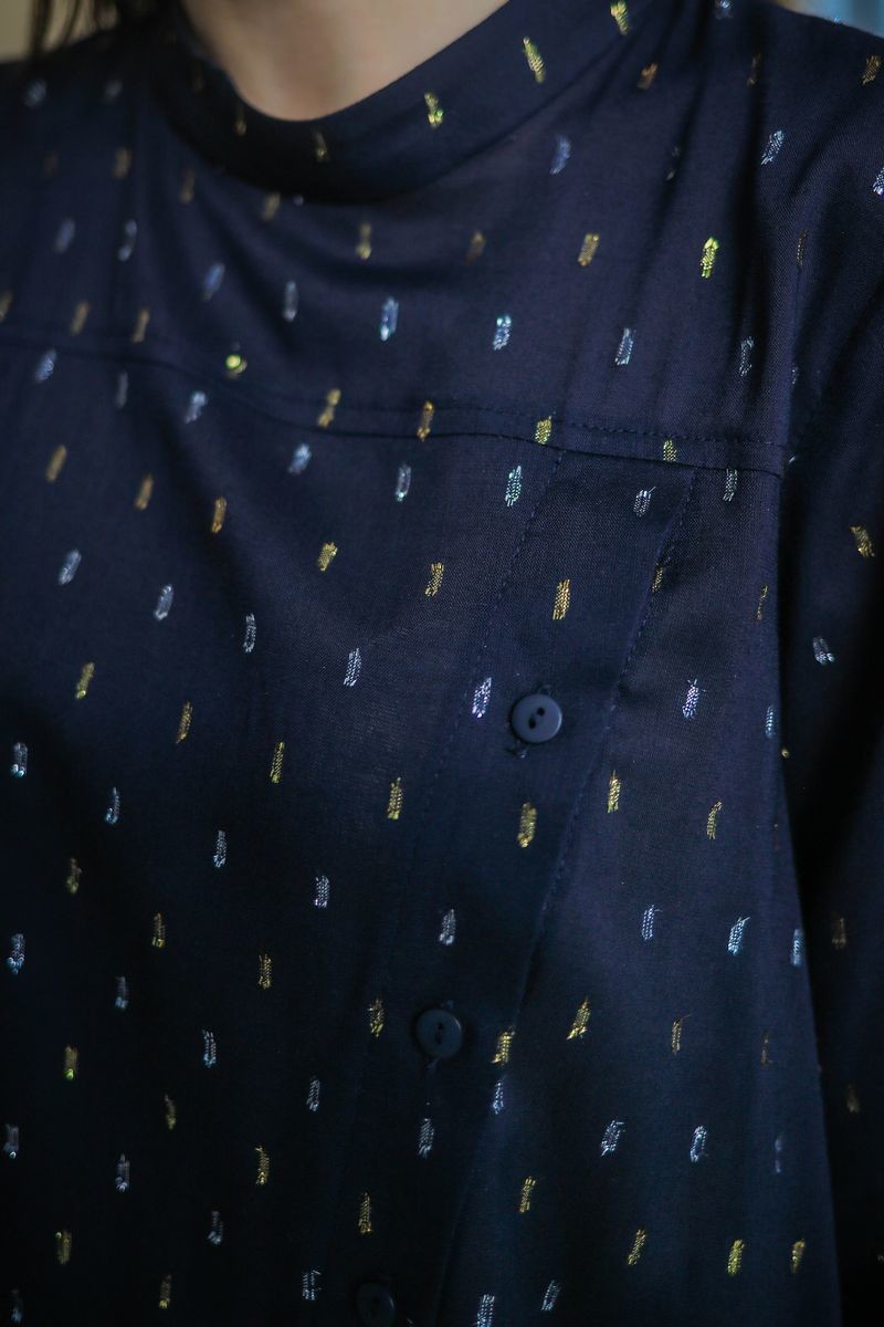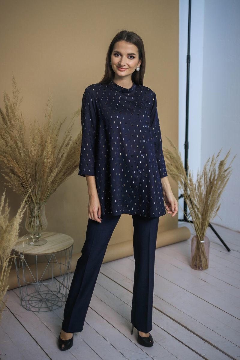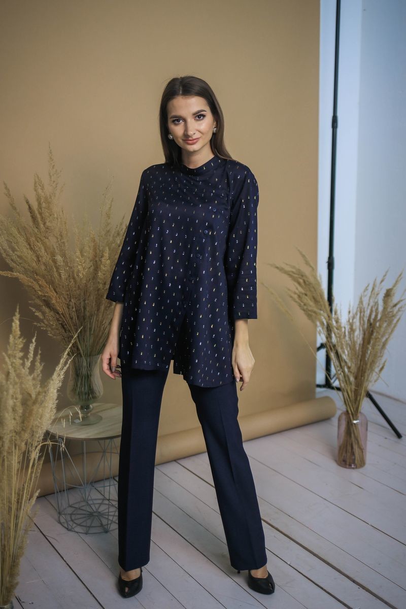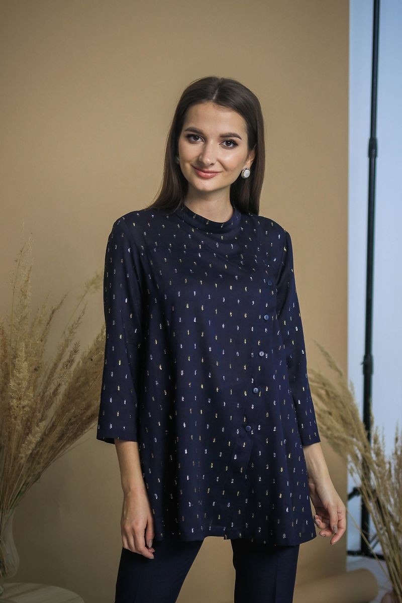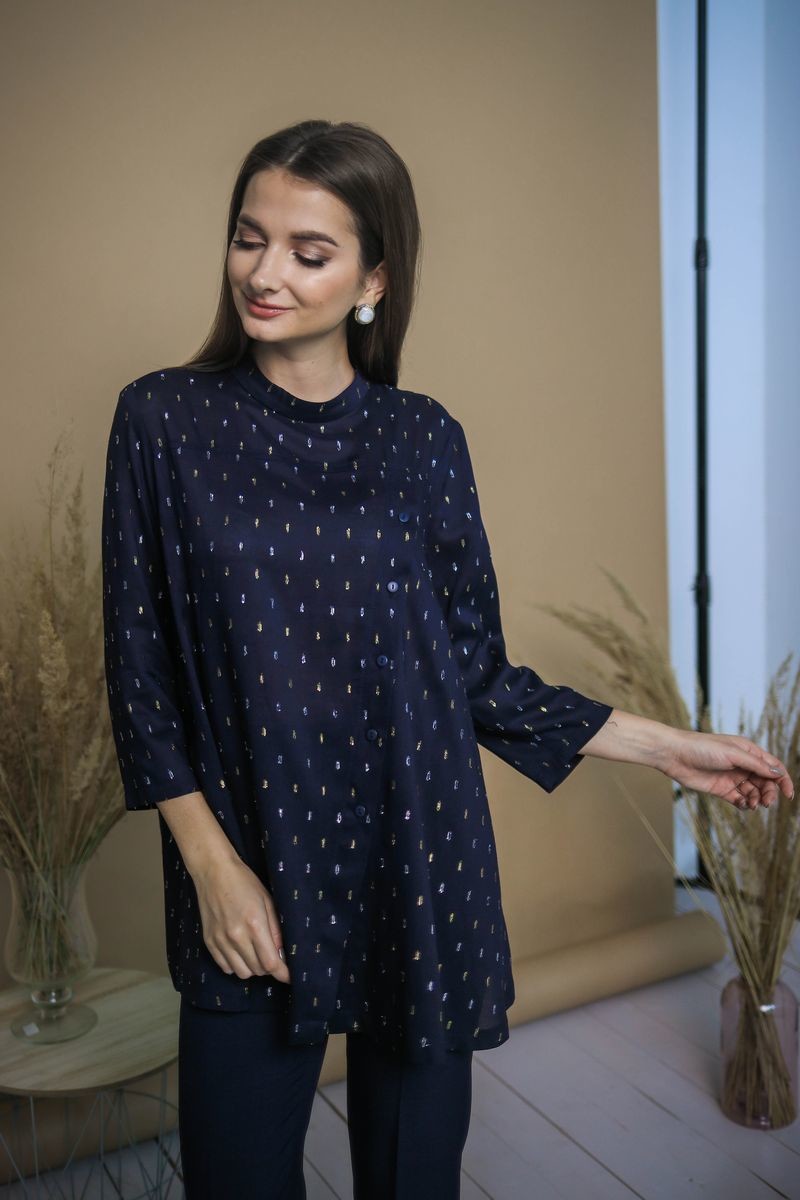 Туника с ассиметричной застежкой на пуговицы свсободного силуэта. Втачной рукав, воротник-стойка.