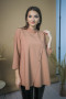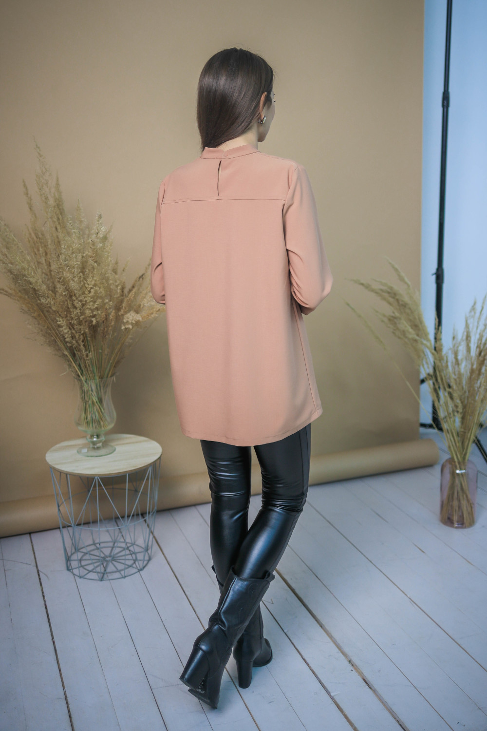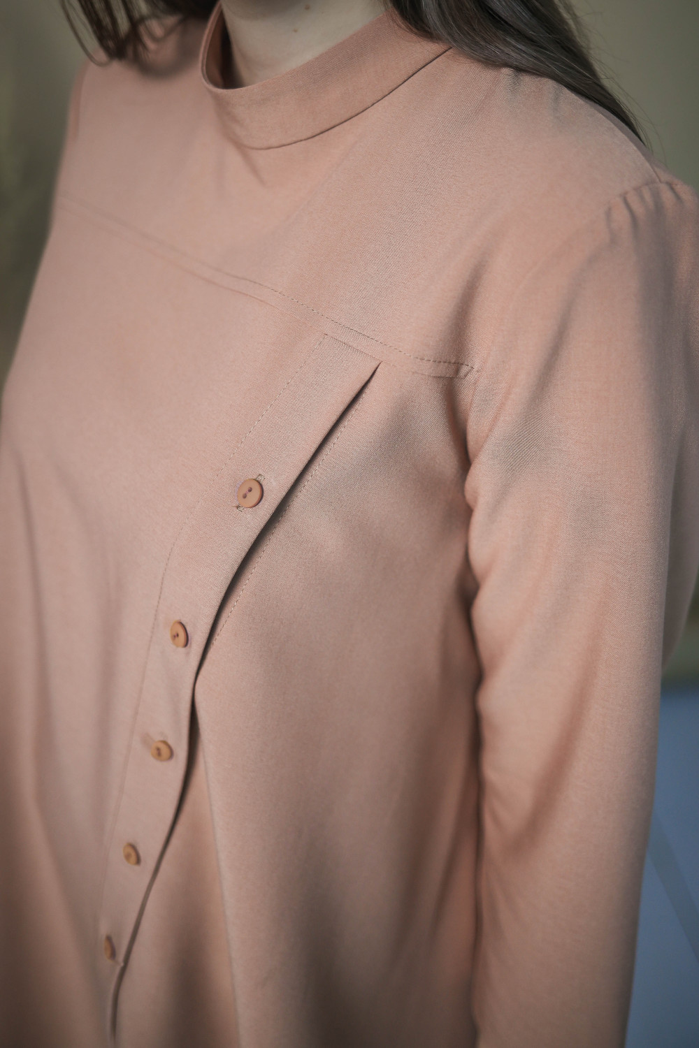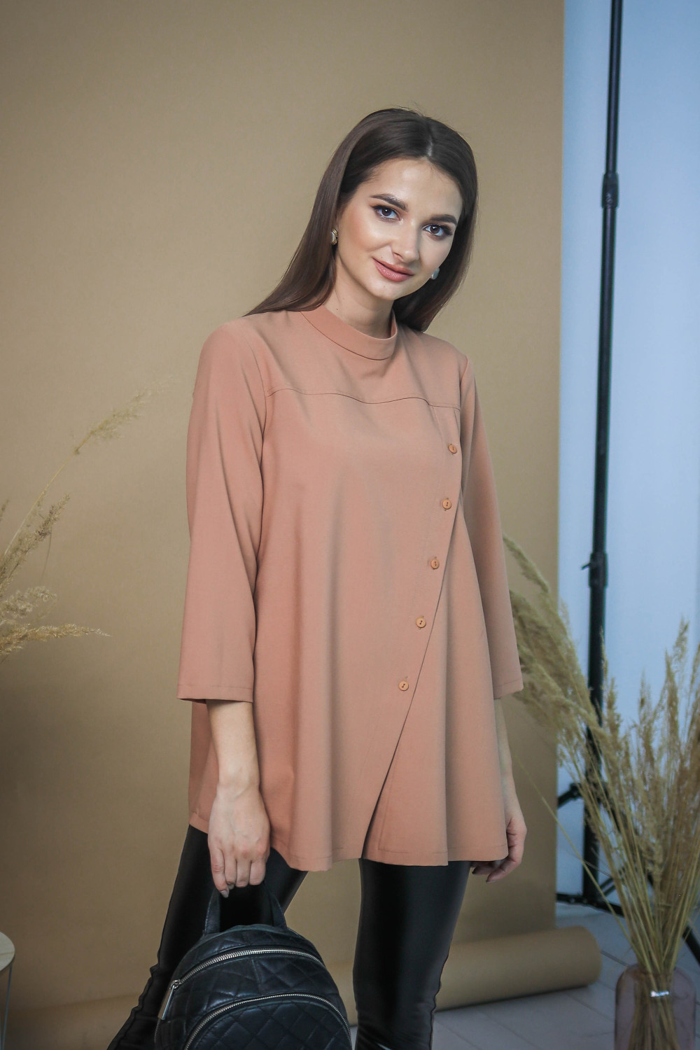 Туника с ассиметричной застежкой на пуговицы свсободного силуэта. Втачной рукав, воротник-стойка.
