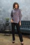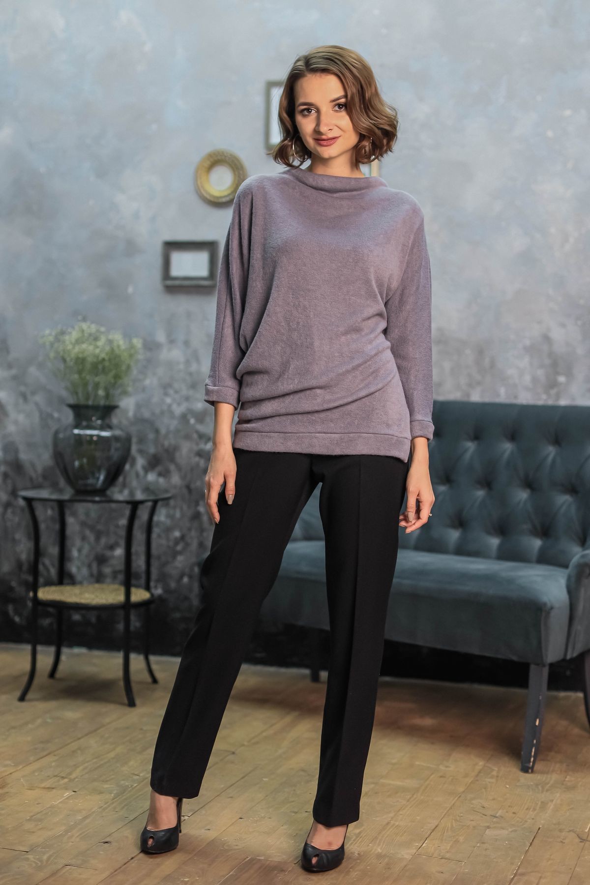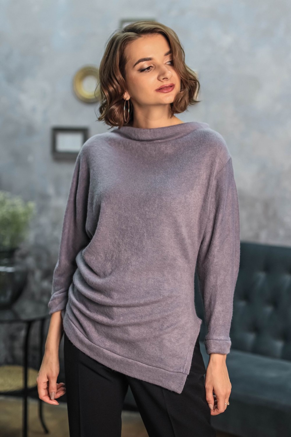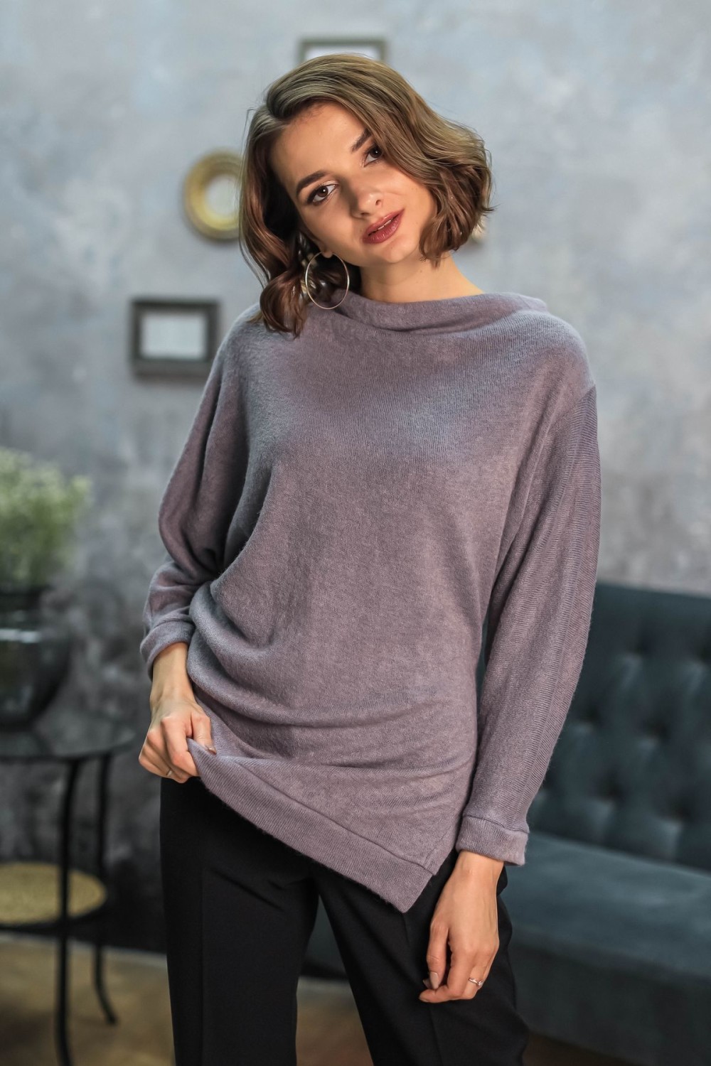 Асимметричная туника из мягкого трикотажа. Воротник-стойка, рукав и низ изделия обработаны широкими манжетами из основного полотна. По правому боковому шву драпировка, по левому - разрез.