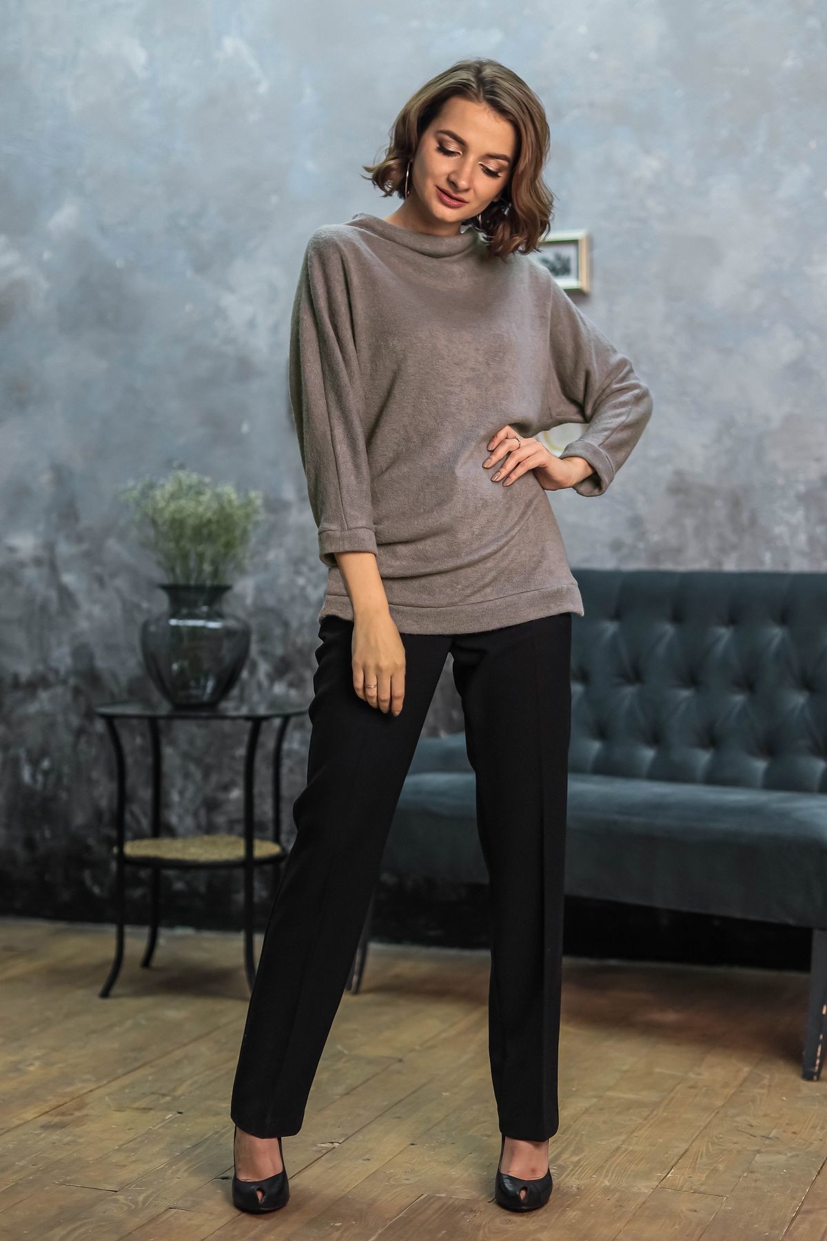 Асимметричная туника из мягкого трикотажа. Воротник-стойка, рукав и низ изделия обработаны широкими манжетами из основного полотна. По правому боковому шву драпировка, по левому - разрез.