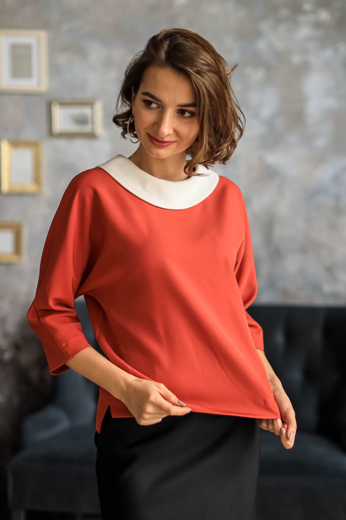 Туника прямого силуэта с воротником-шалька. Цельнокроенный рукав, застежка на спинке. Модель с перепадом длины - заднее полотно чуть длиннее.
