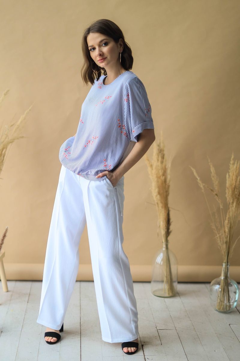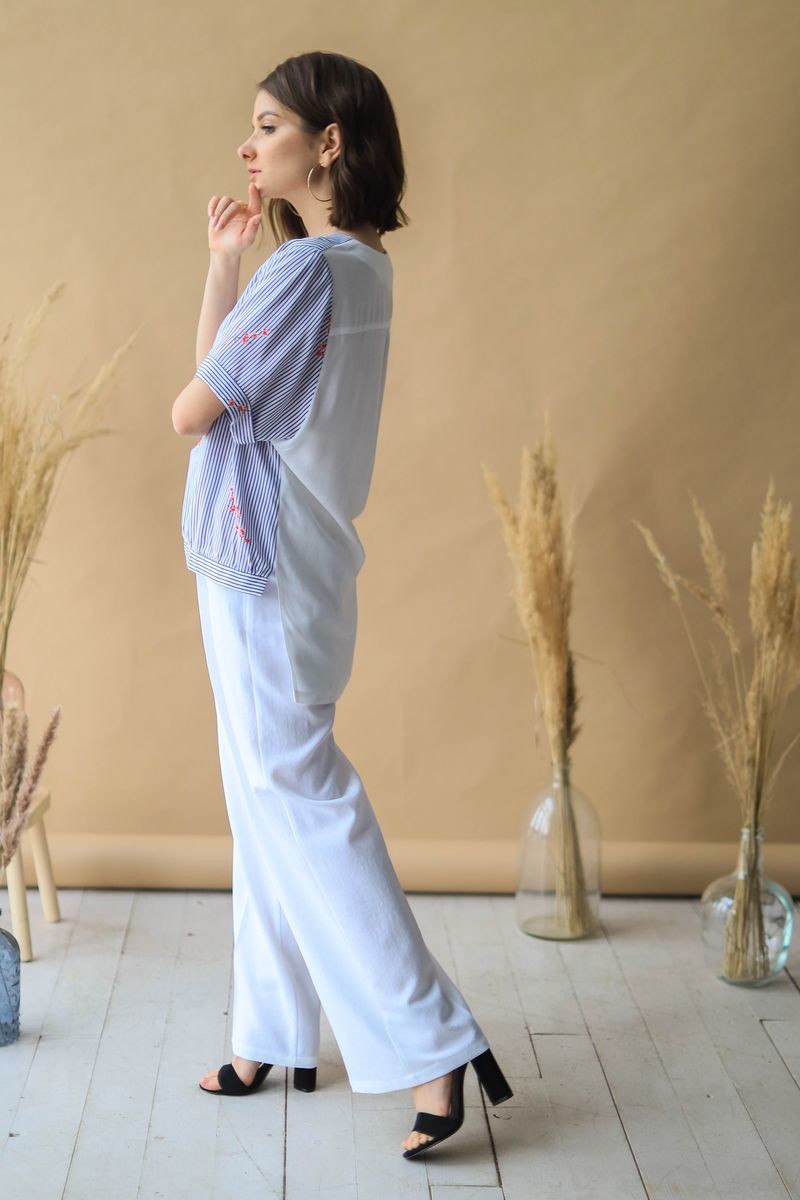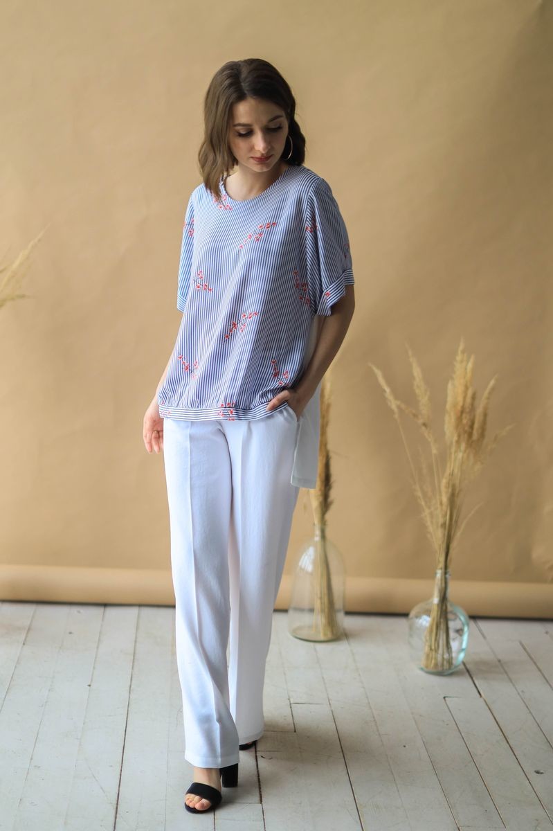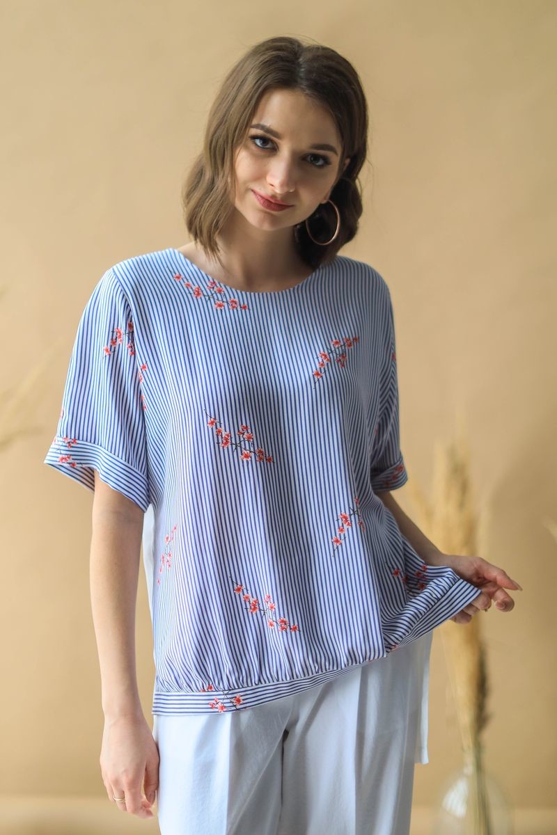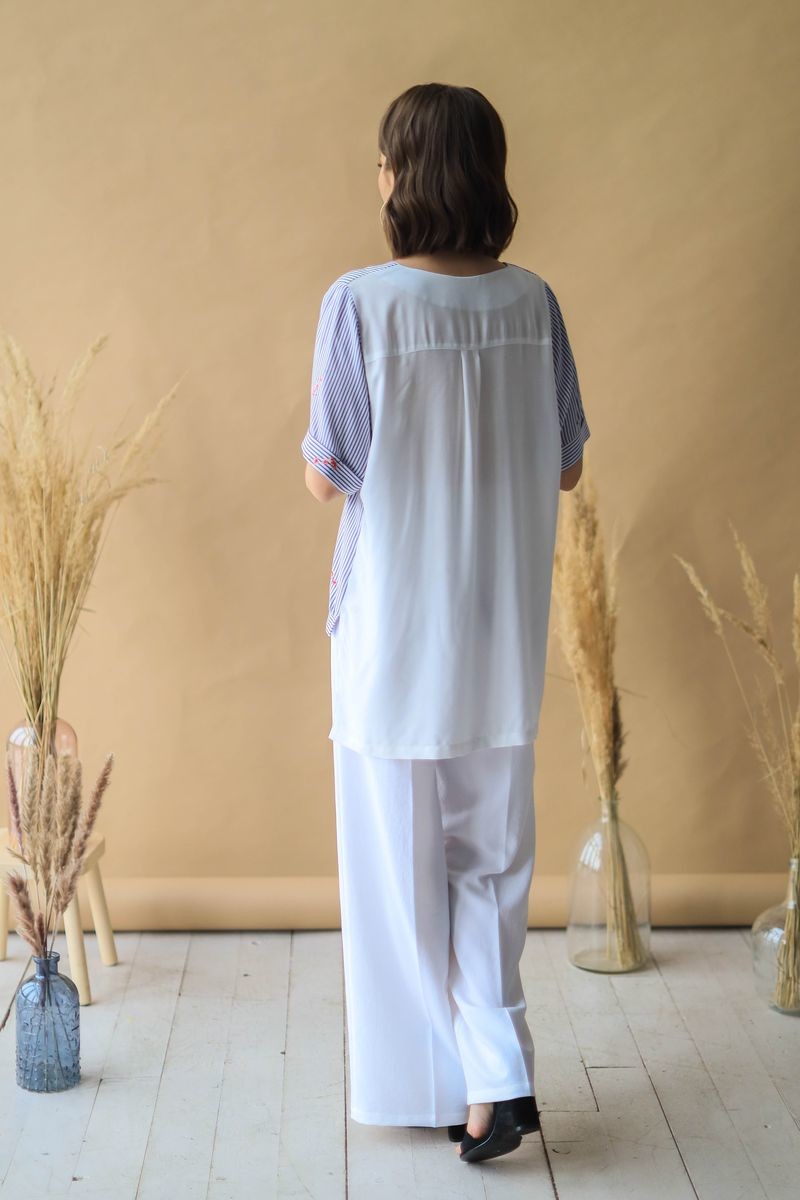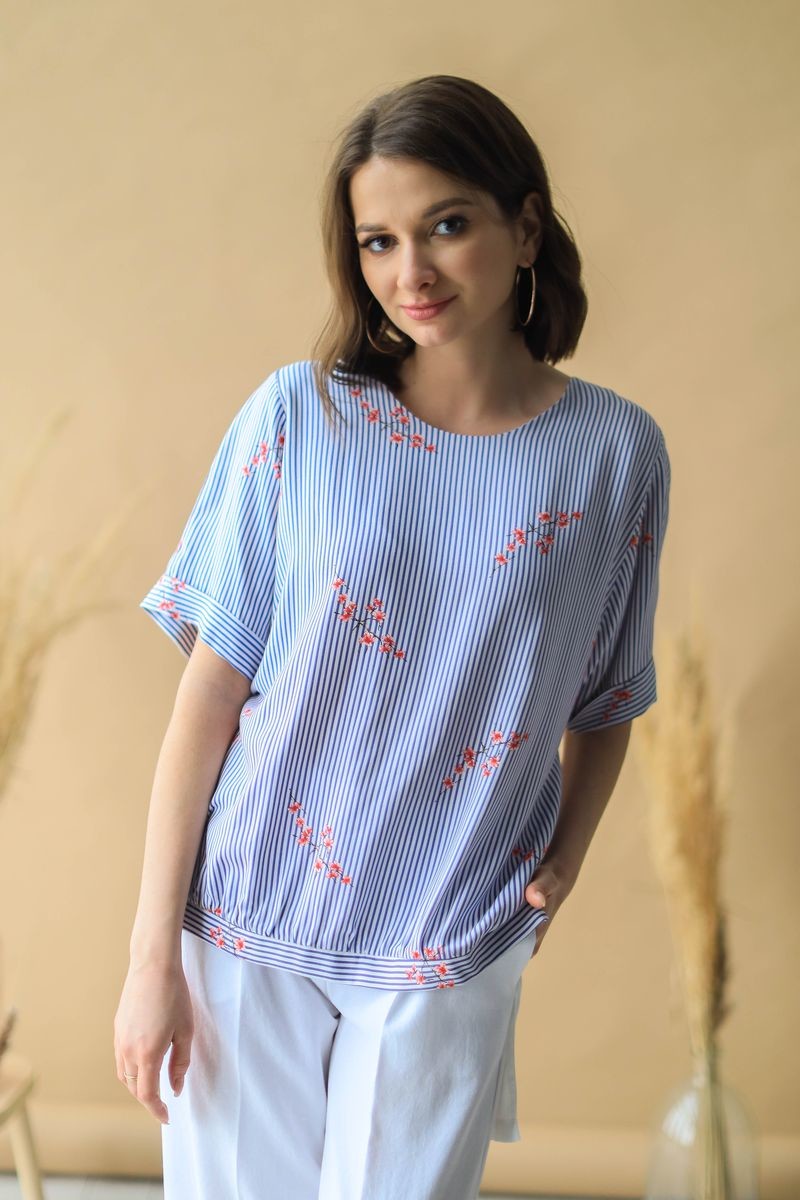 Туника свободного силуэта. Короткий рукав обработан отворотом, низ изделия на манжете. Блузка с перепадом длины, спинка выполнена из вискозы в однотоне.
