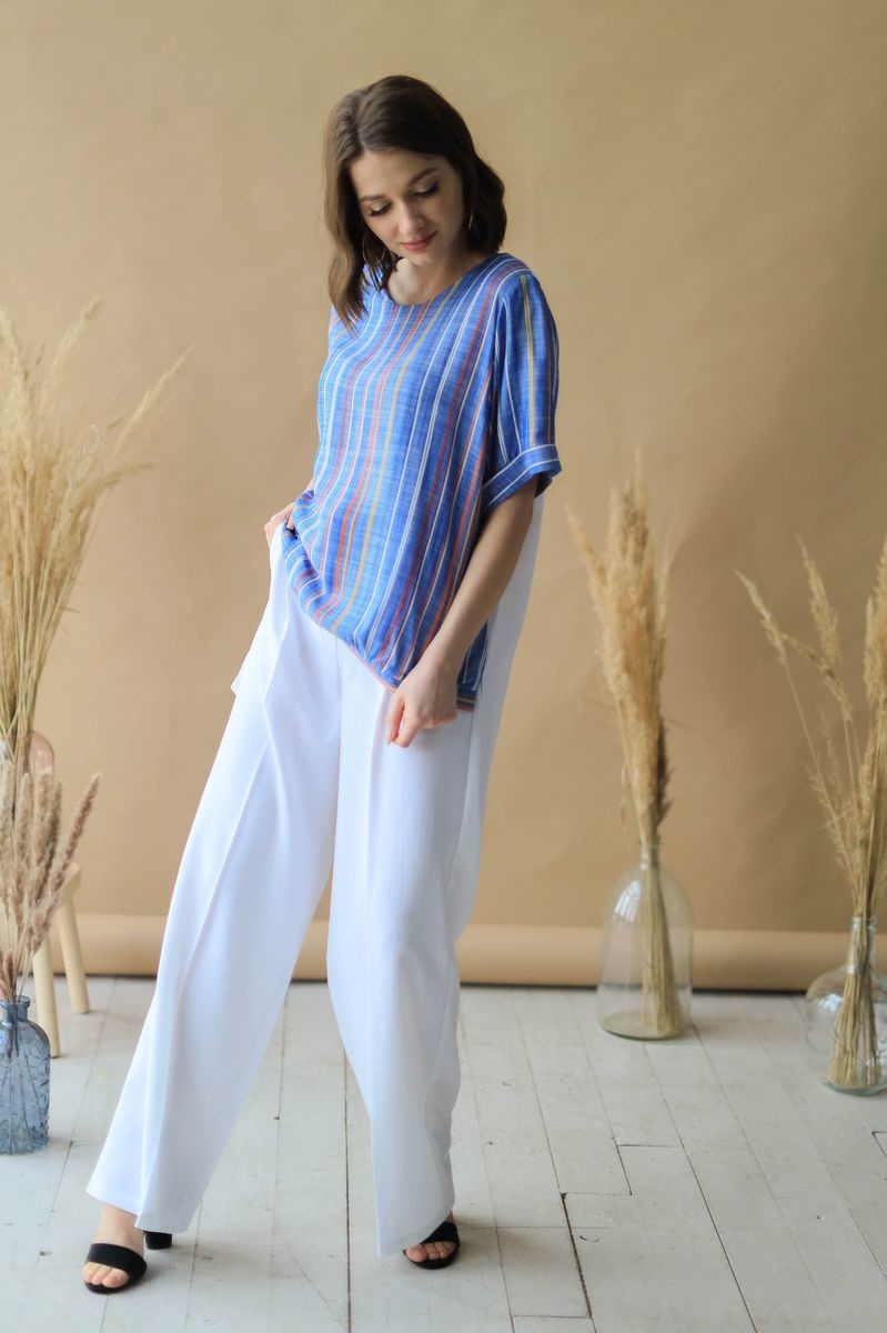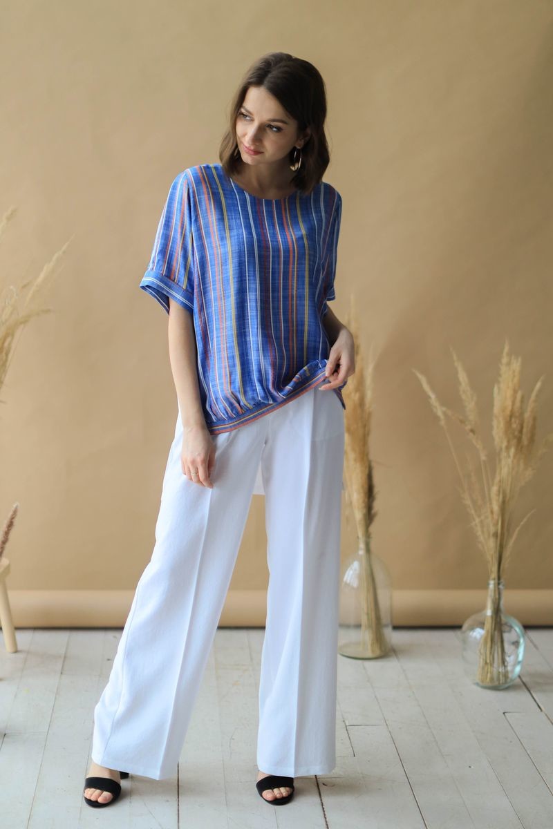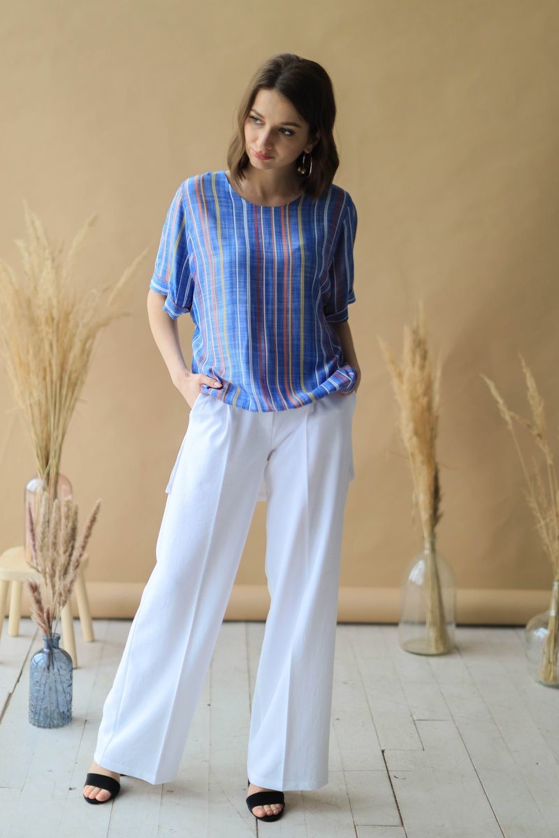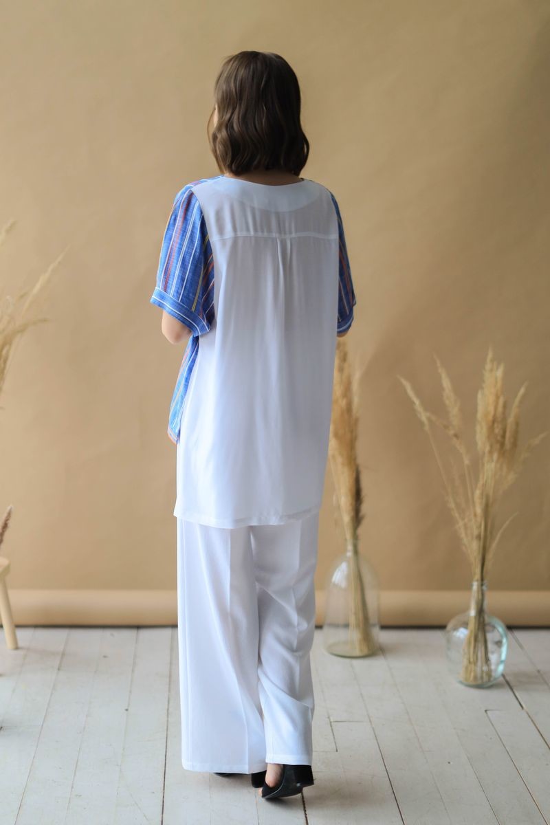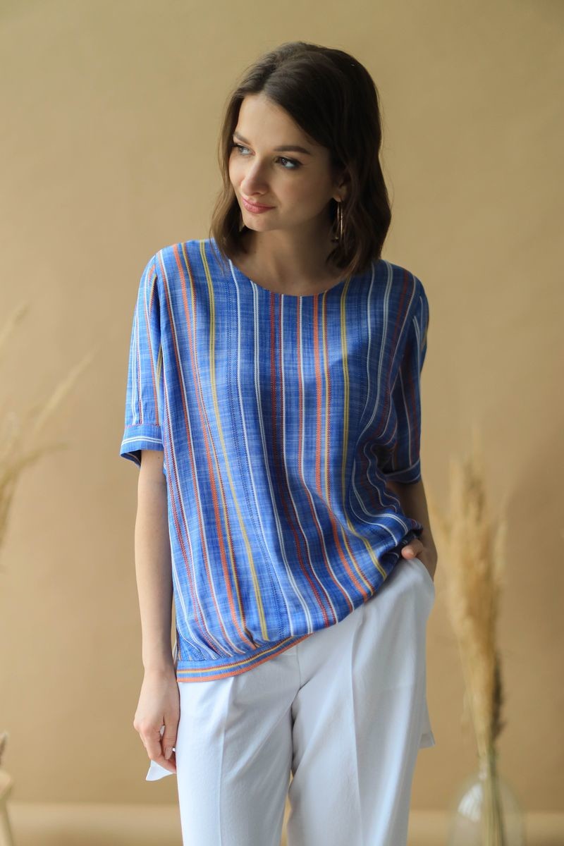 Туника свободного силуэта. Короткий рукав обработан отворотом, низ изделия на манжете. Блузка с перепадом длины, спинка выполнена из вискозы в однотоне.