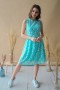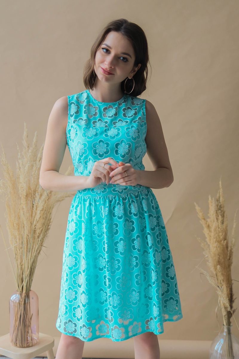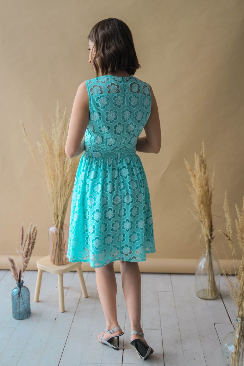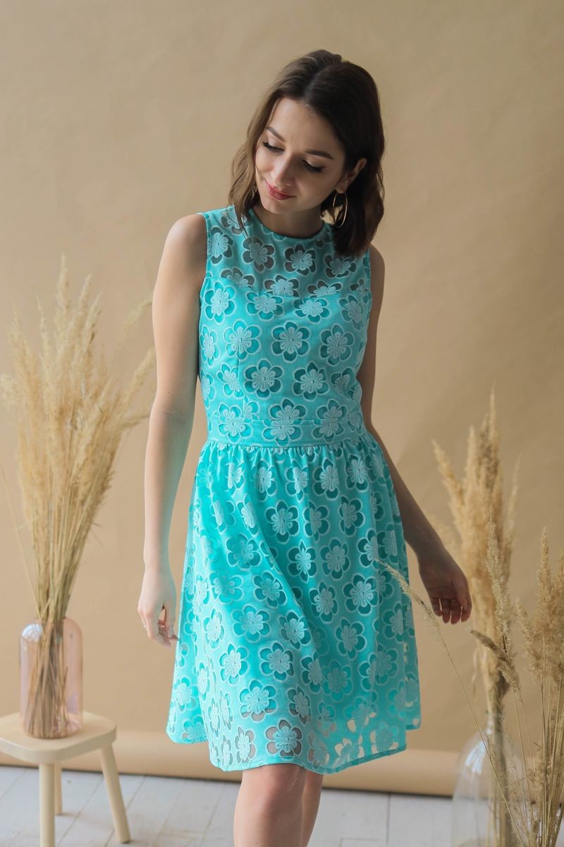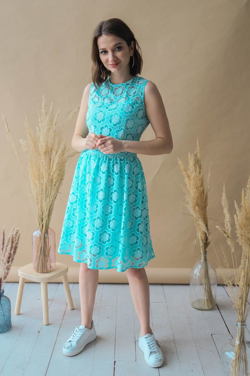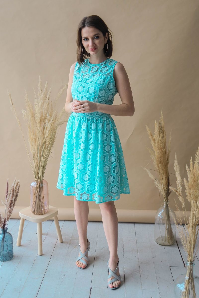 Платье из кружевного полотна. Полочка, спинка и юбка модели продублированы подкладкой из тонкой вискозы. Застежка на потайную молнию на спинке.