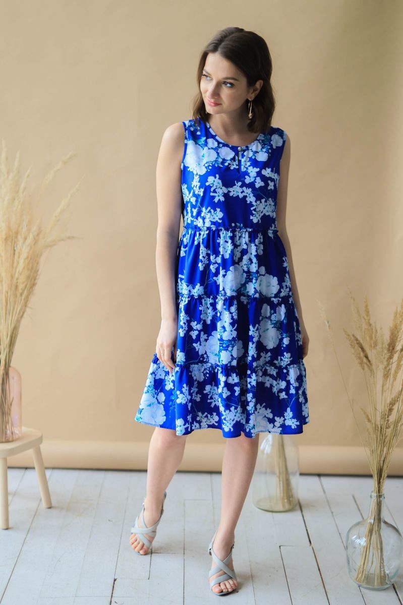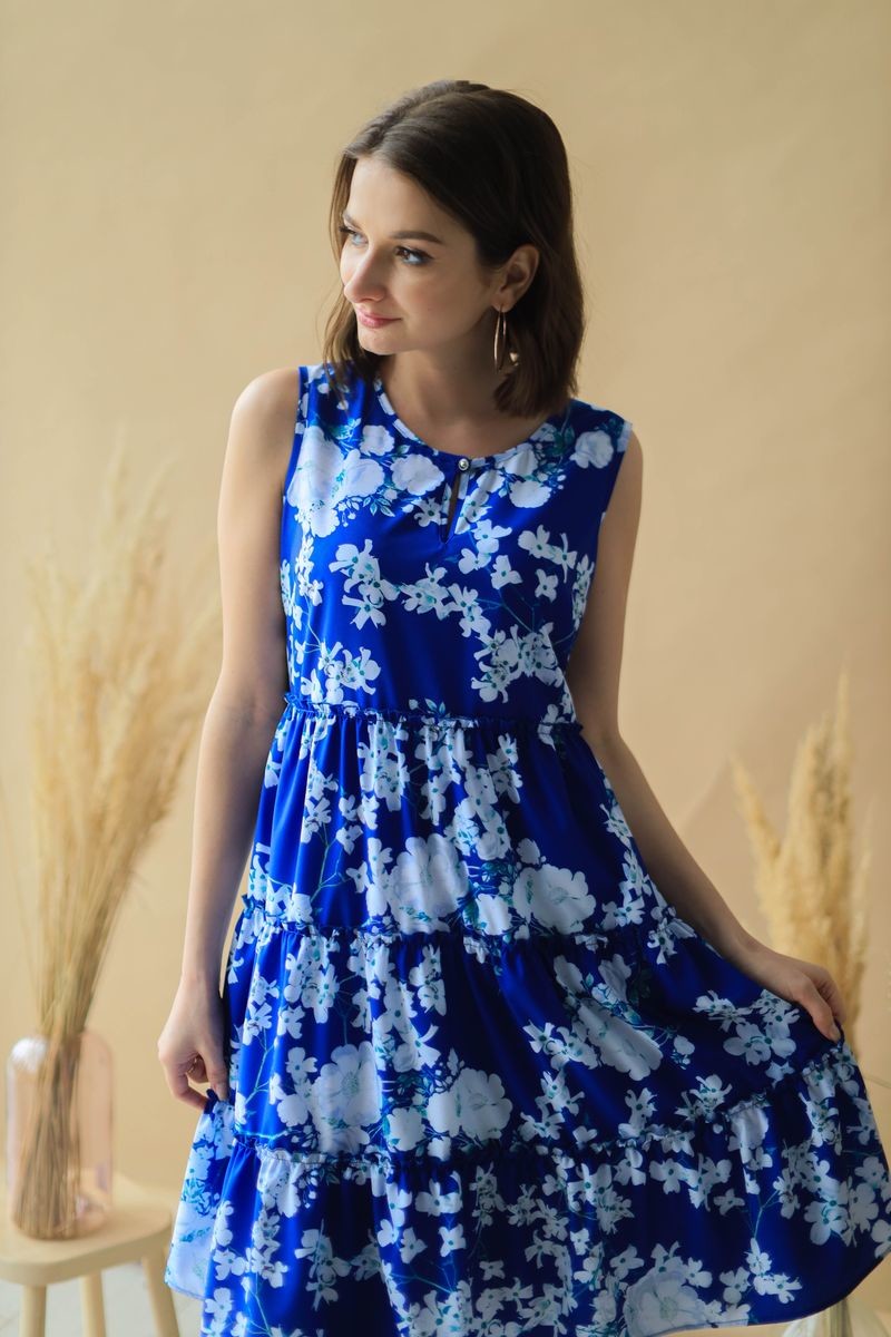 Платье А-силуэта, юбка из воланов, присобранных по шву, на подкладке из мягкой сетки. Застежка спереди на пуговицу.