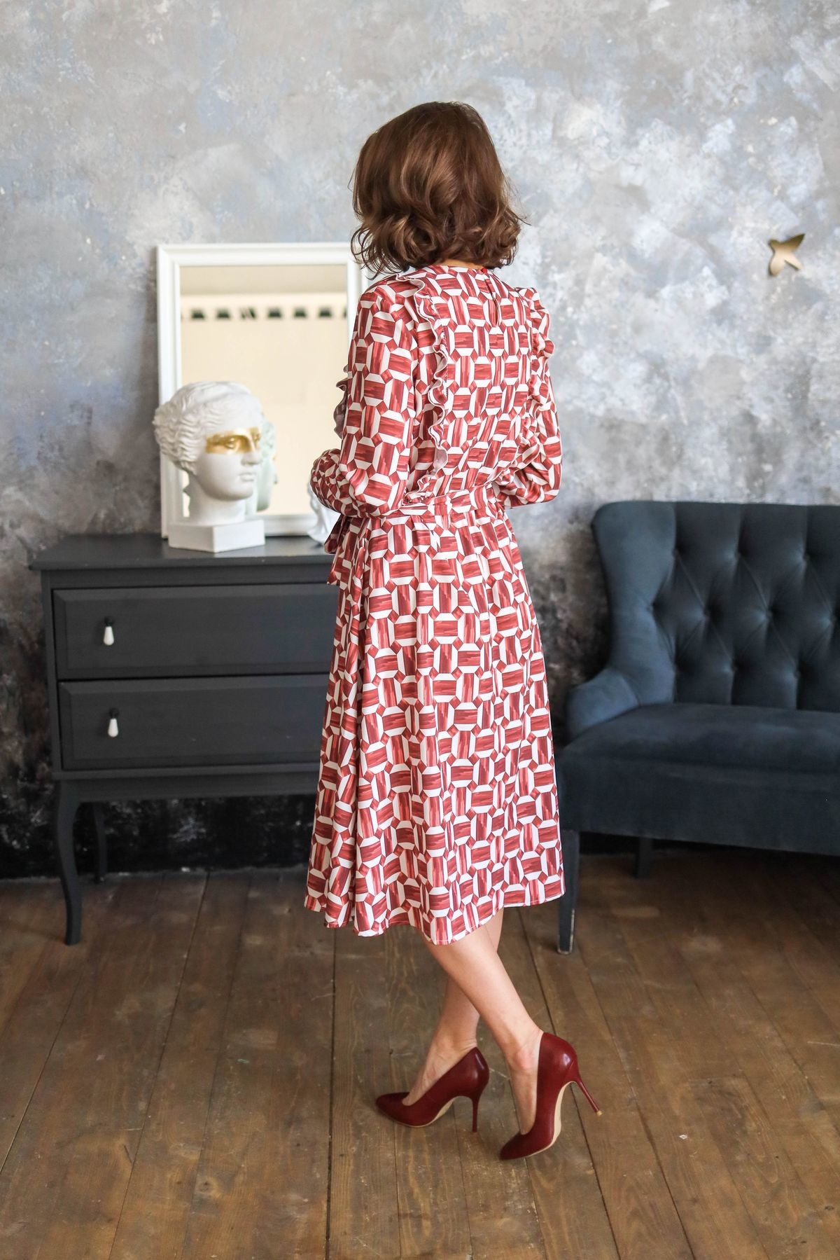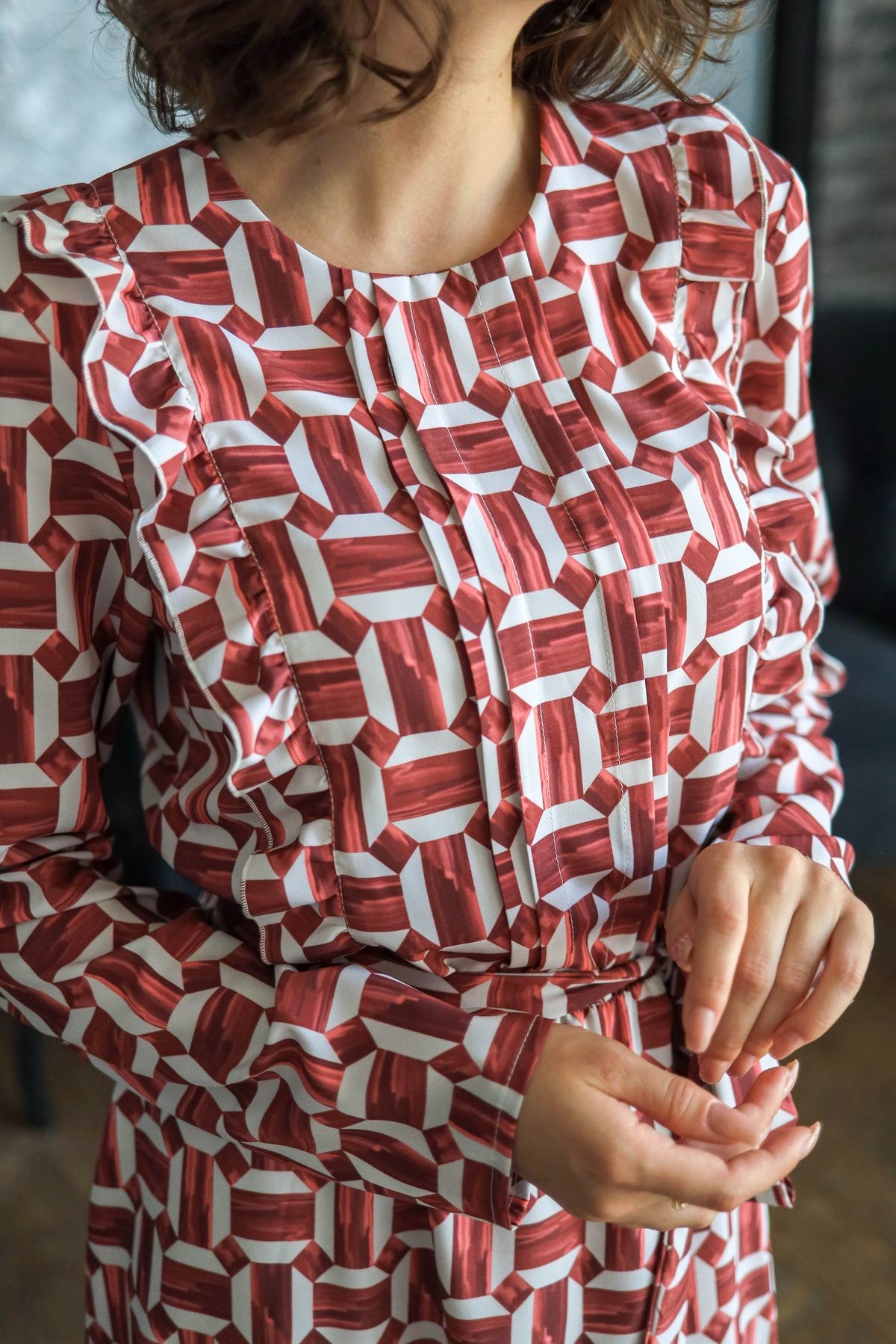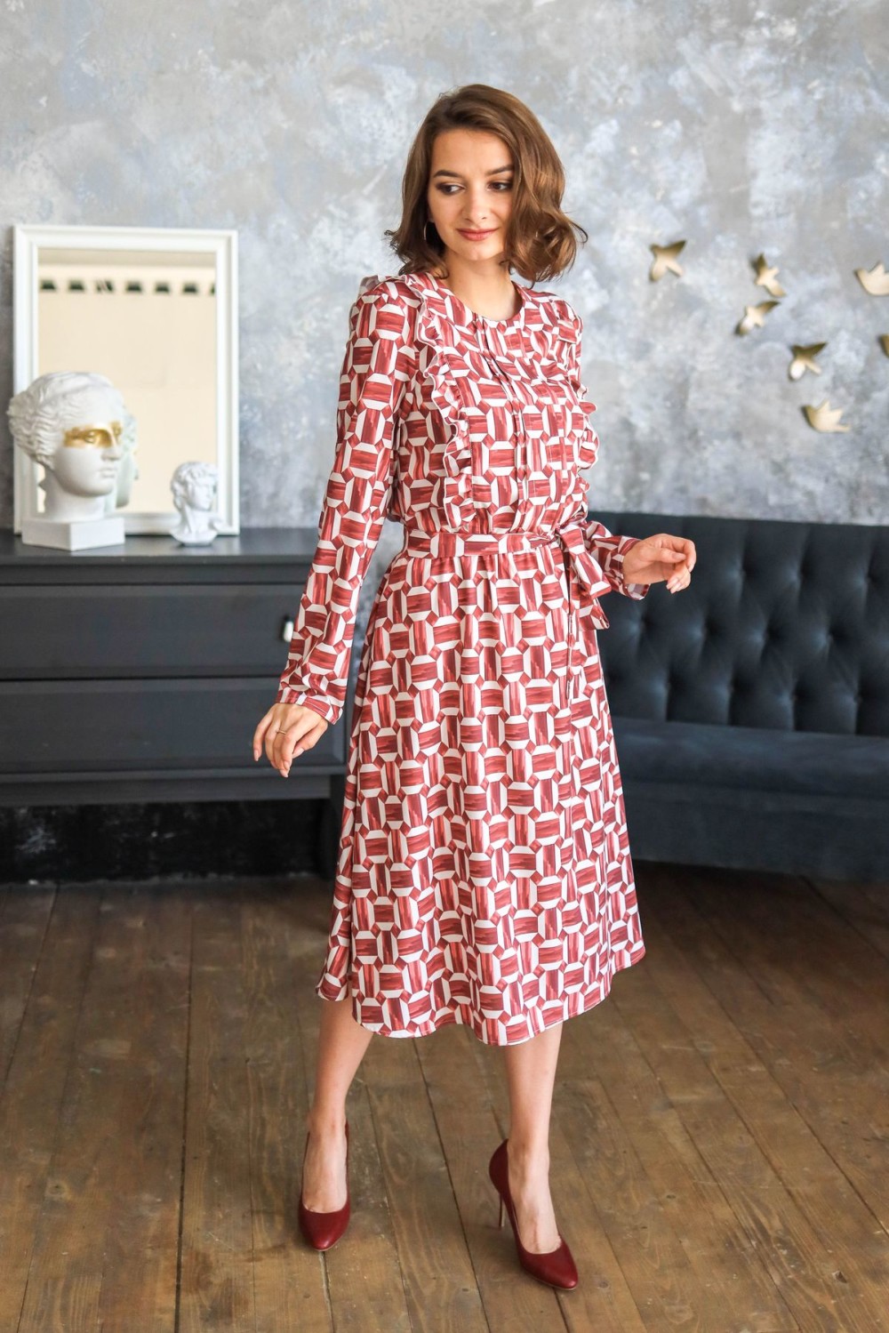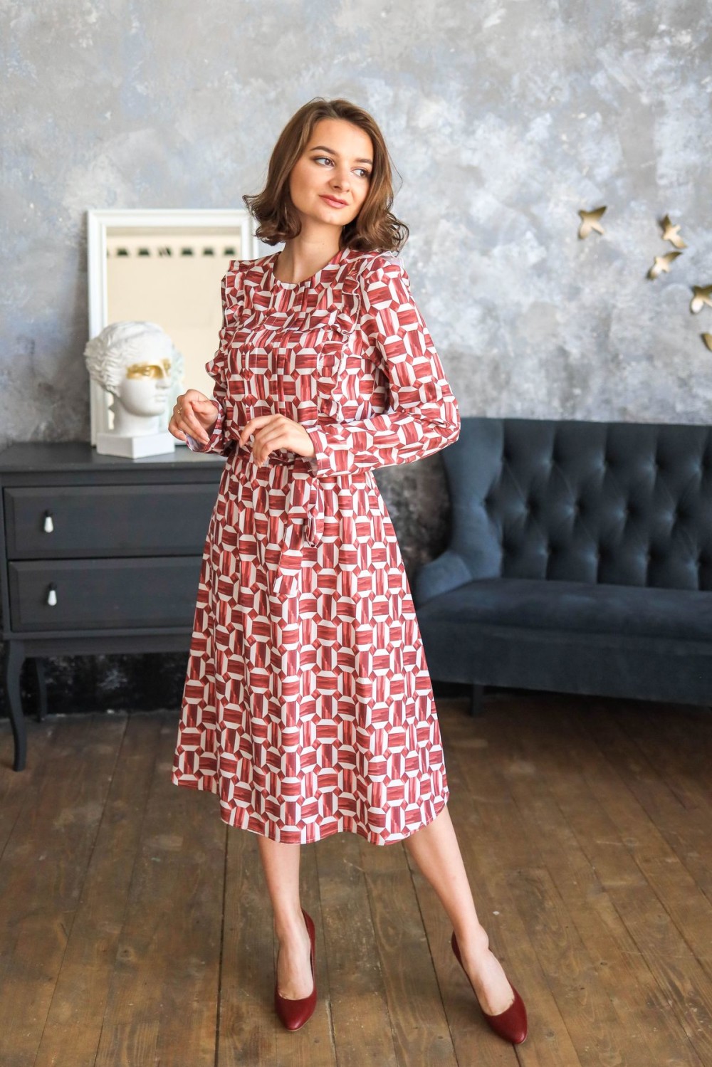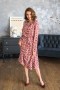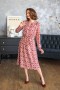 Платье длины миди. По лифу изделия рюши. Длинный втачной рукав, отрезная юбка чуть присобрана по шву. Есть карманы в боковых швах. В комплекте пояс из основного полотна.