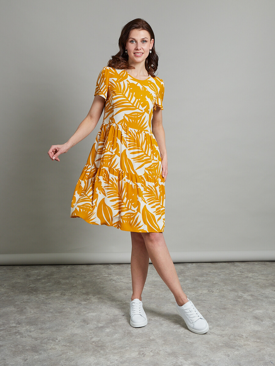 Платье свободного трапецевидного силуэта. Юбка отрезная по талии, выполнена из двух широких воланов, чуть присобраных по шву. Короткий втачной рукав. Застежка сзади на петлю и пуговицу.