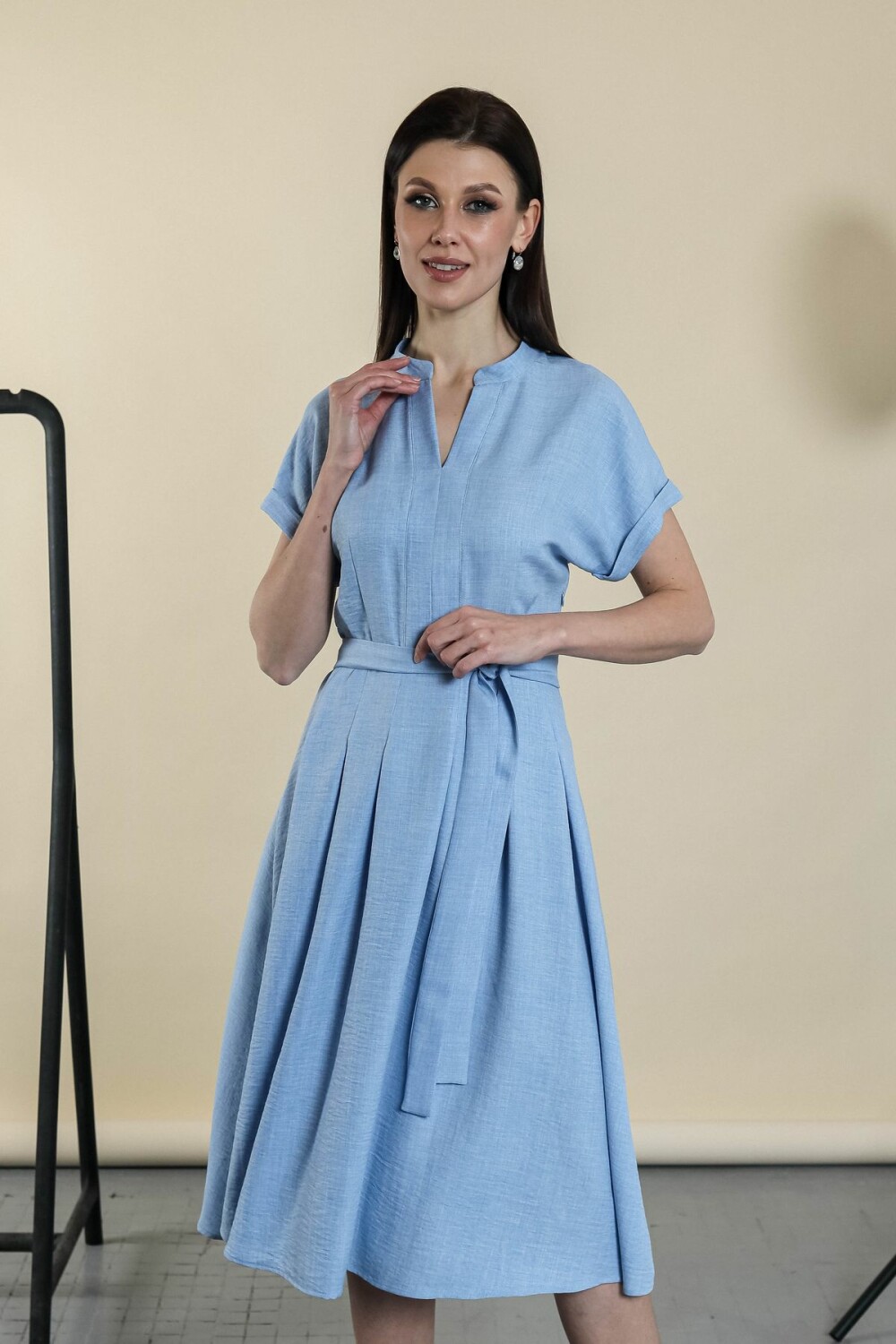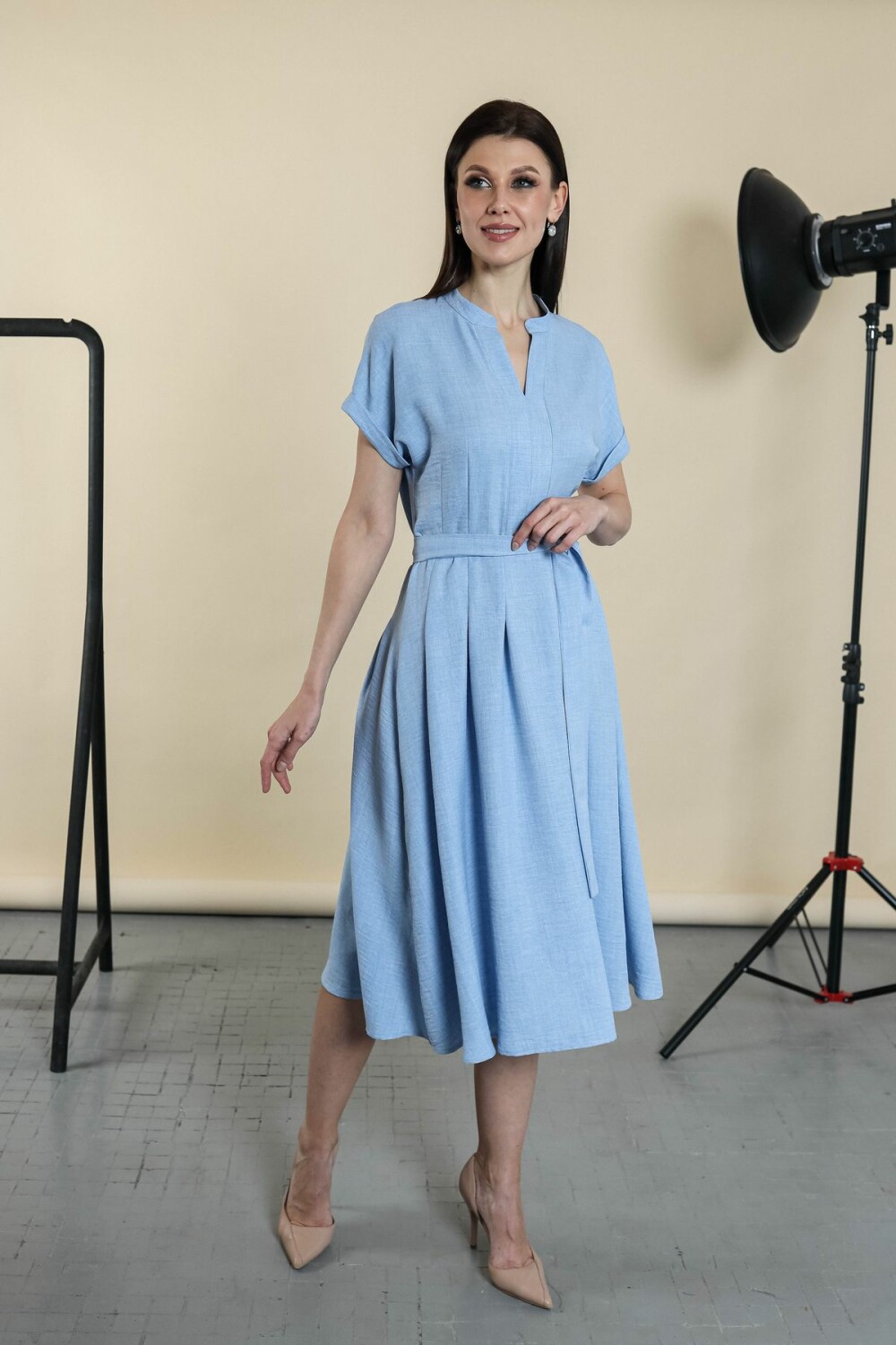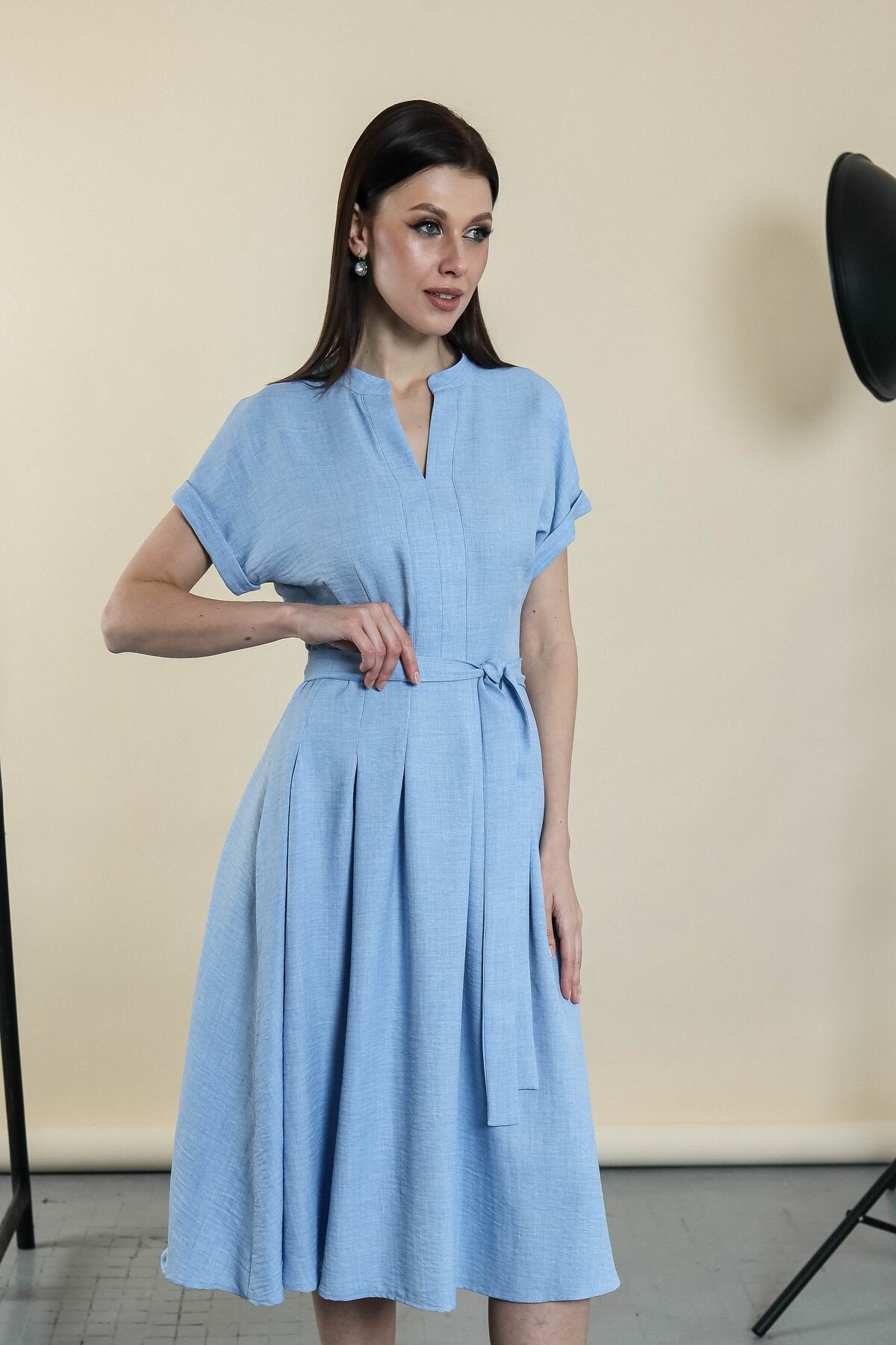 Элегантное платье с поясом в комплекте. Цельнокроенный рукав обработан отворотом, вырез-галочка, юбка изделия в складку.