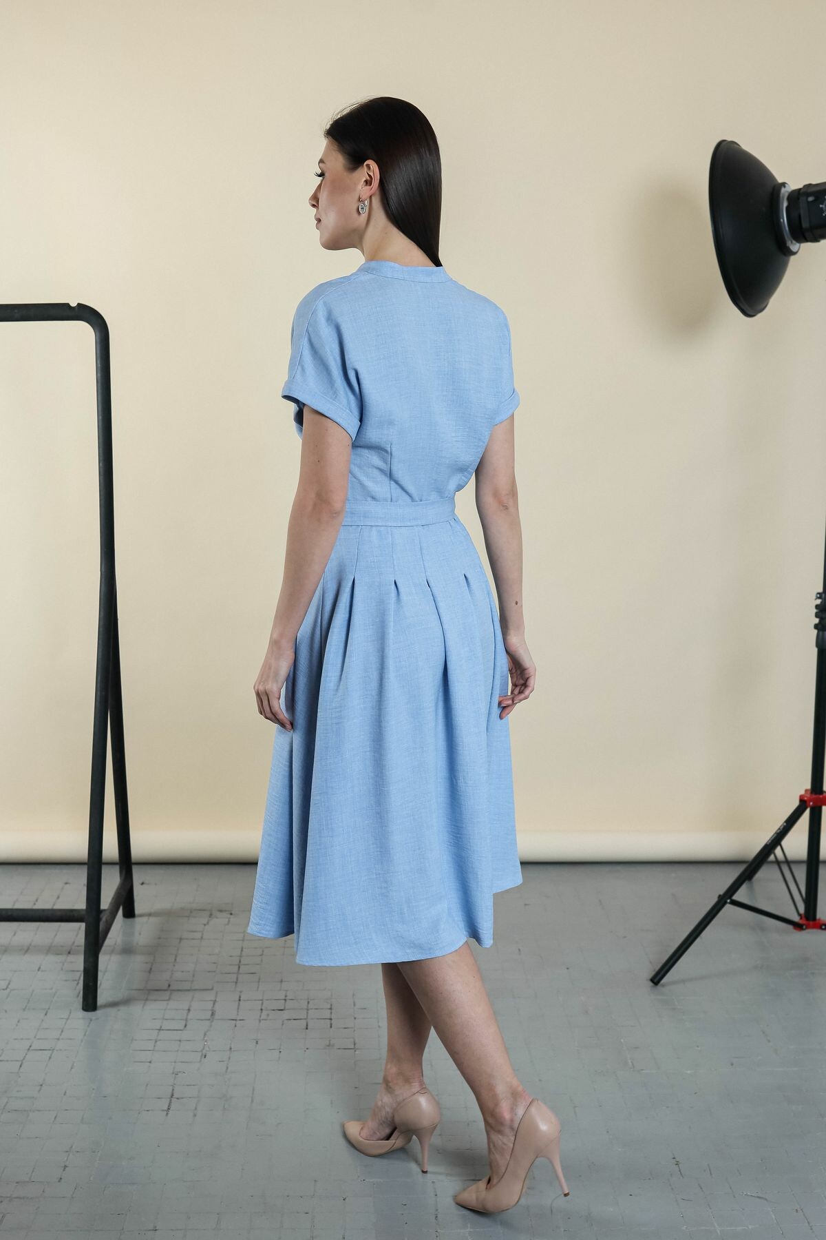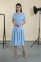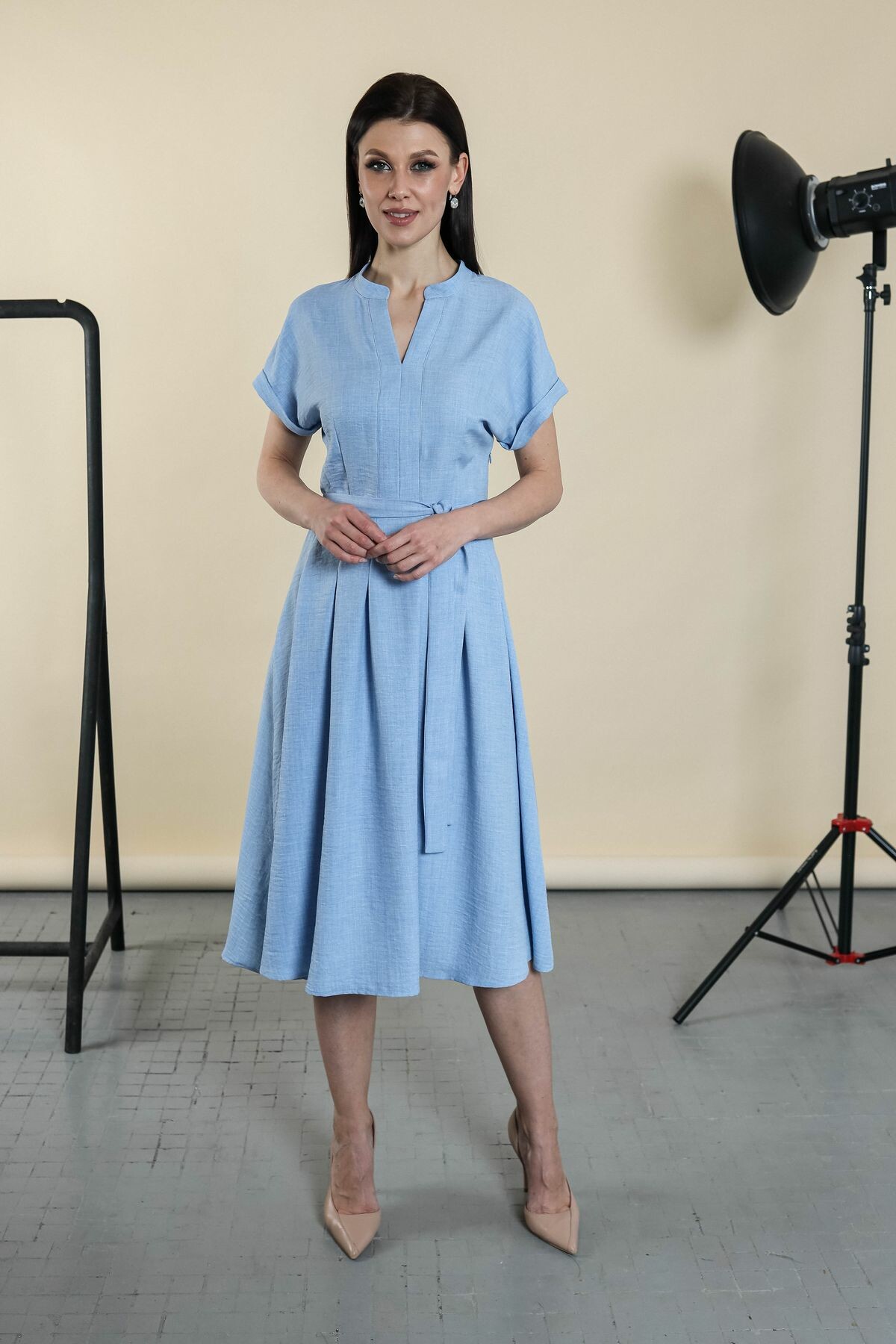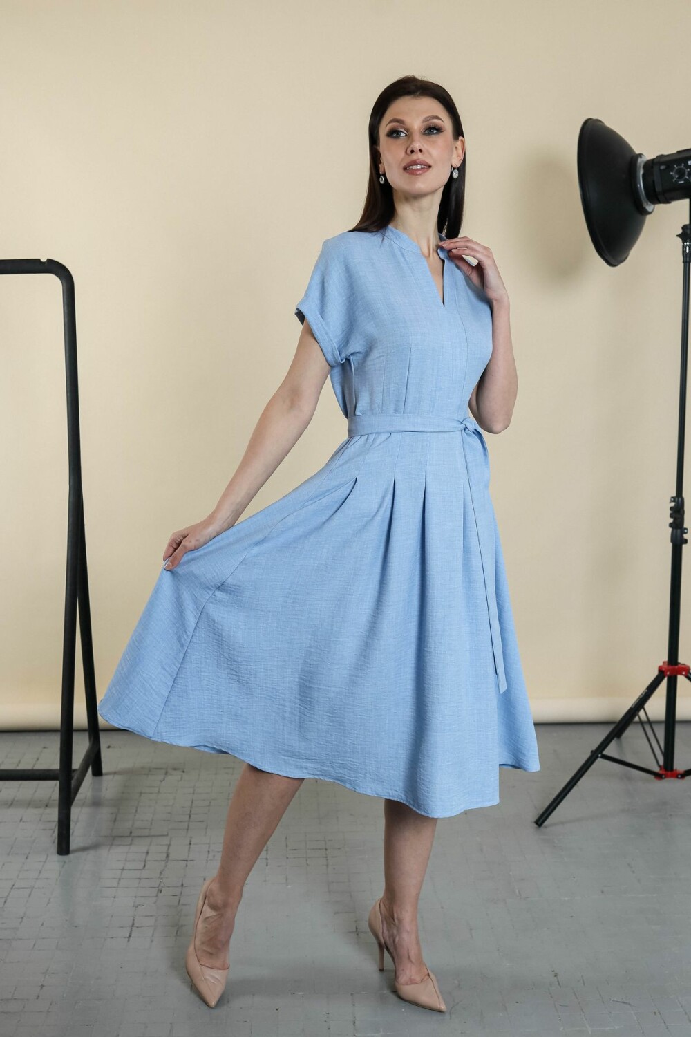 Элегантное платье с поясом в комплекте. Цельнокроенный рукав обработан отворотом, вырез-галочка, юбка изделия в складку.