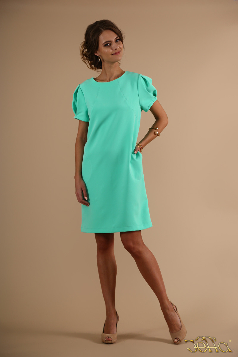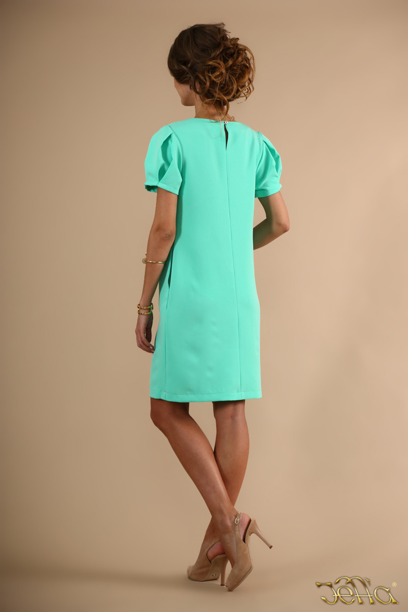 Рукав втачной, короткий, с двумя декоративными складочками. Платье с карманами в боковых швах.