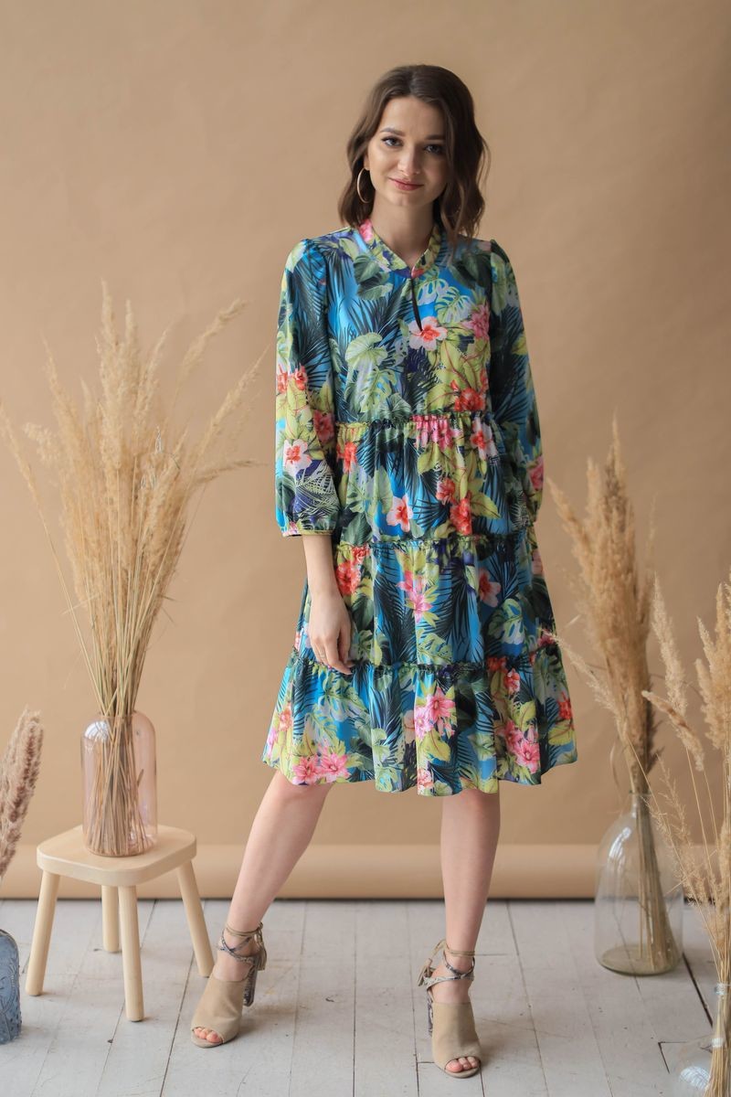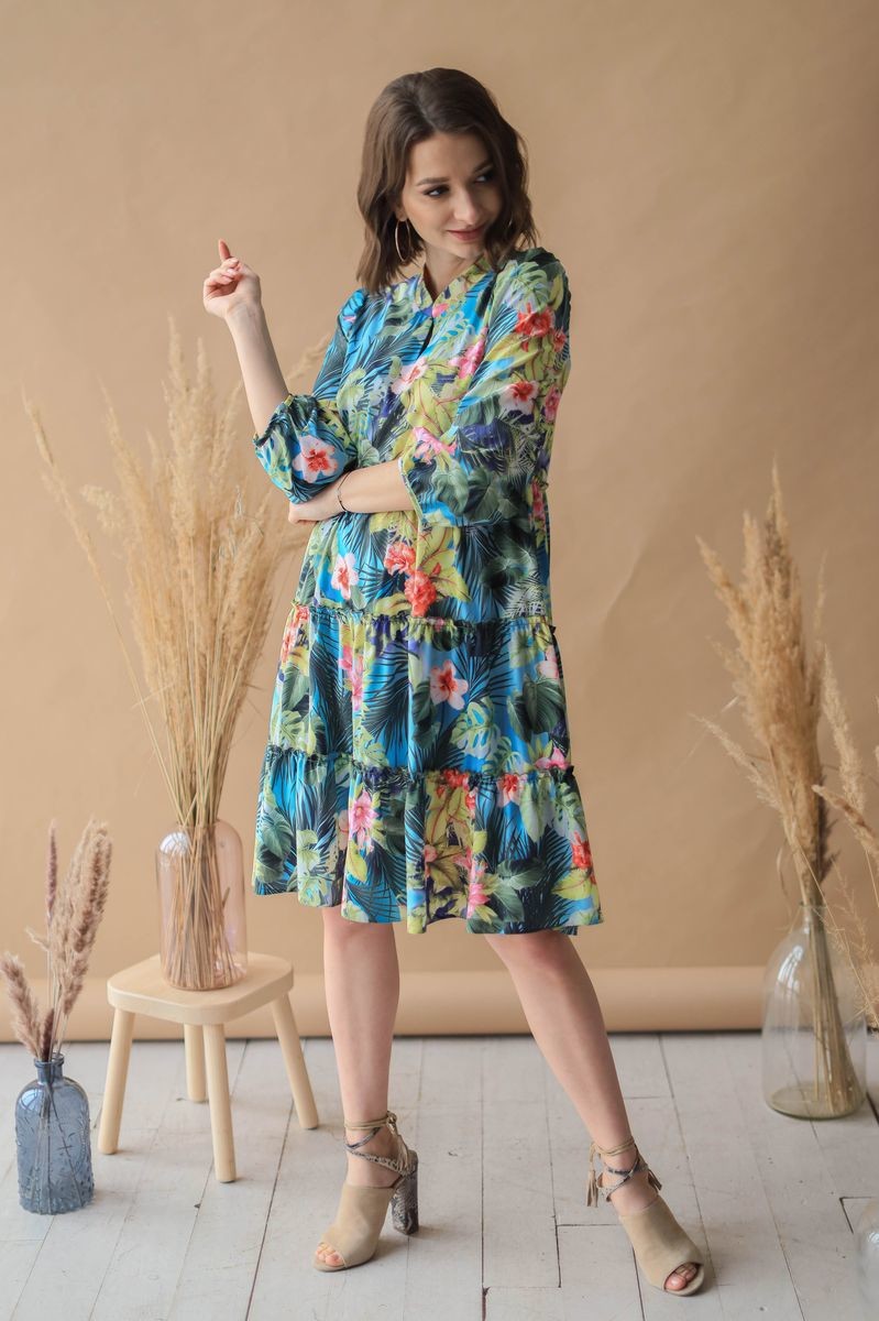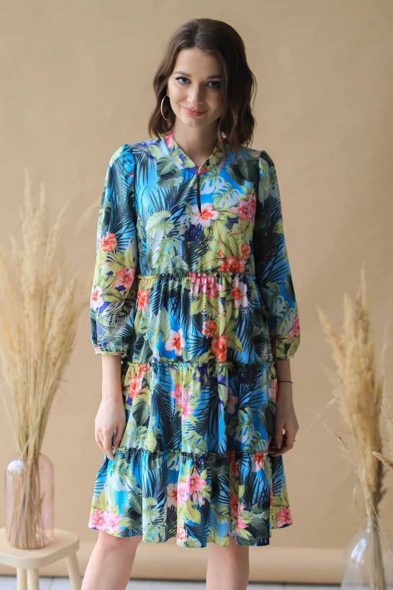 Платье свободного силуэта, отрезное по талии. Юбка из трех воланов, на подкладке.