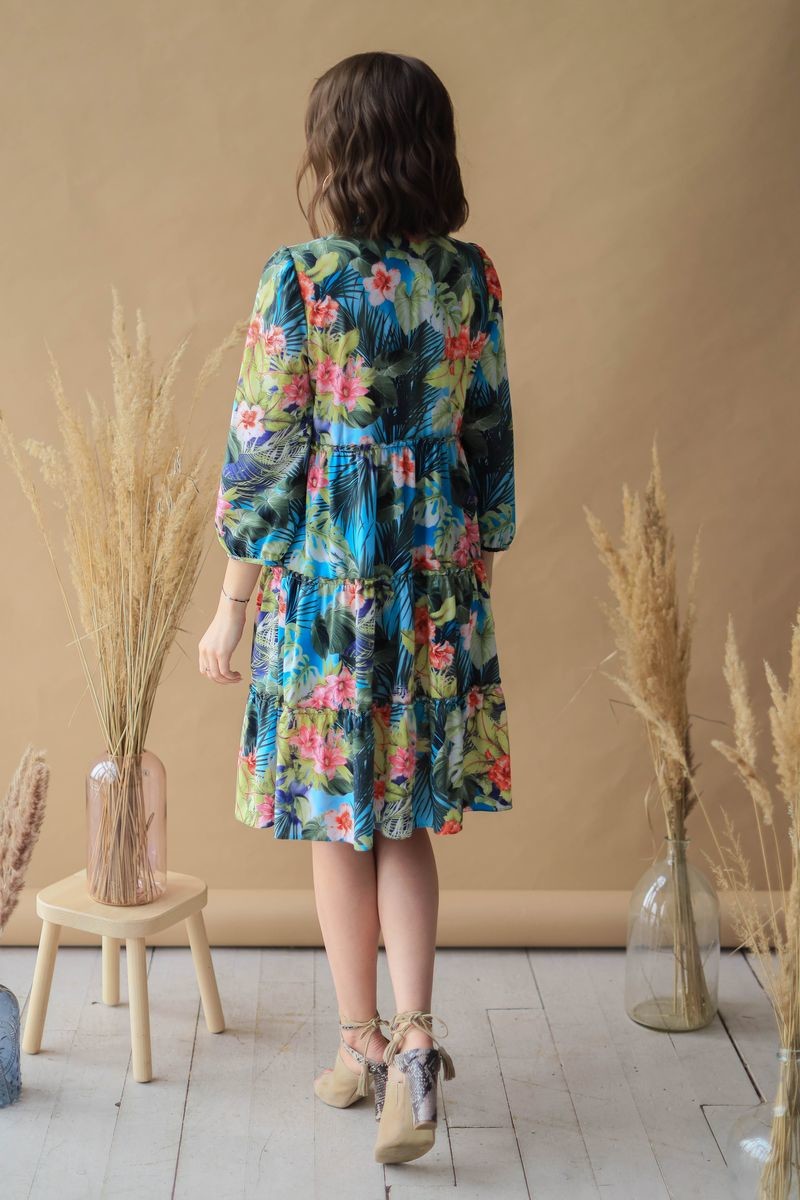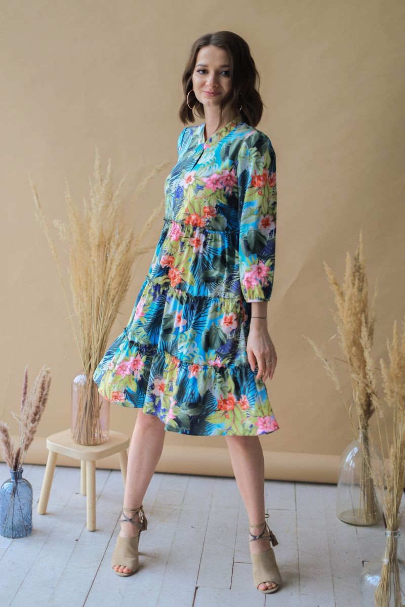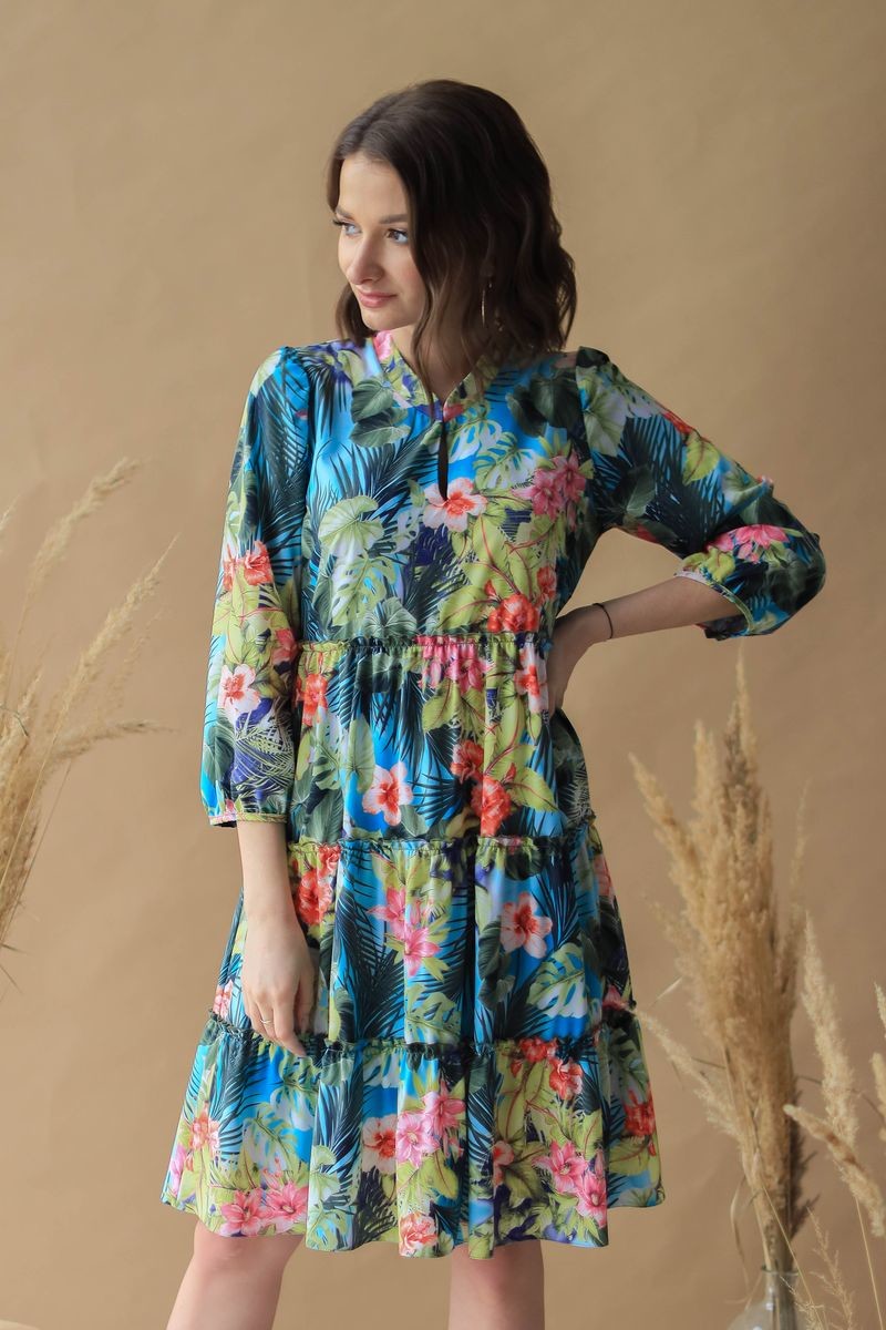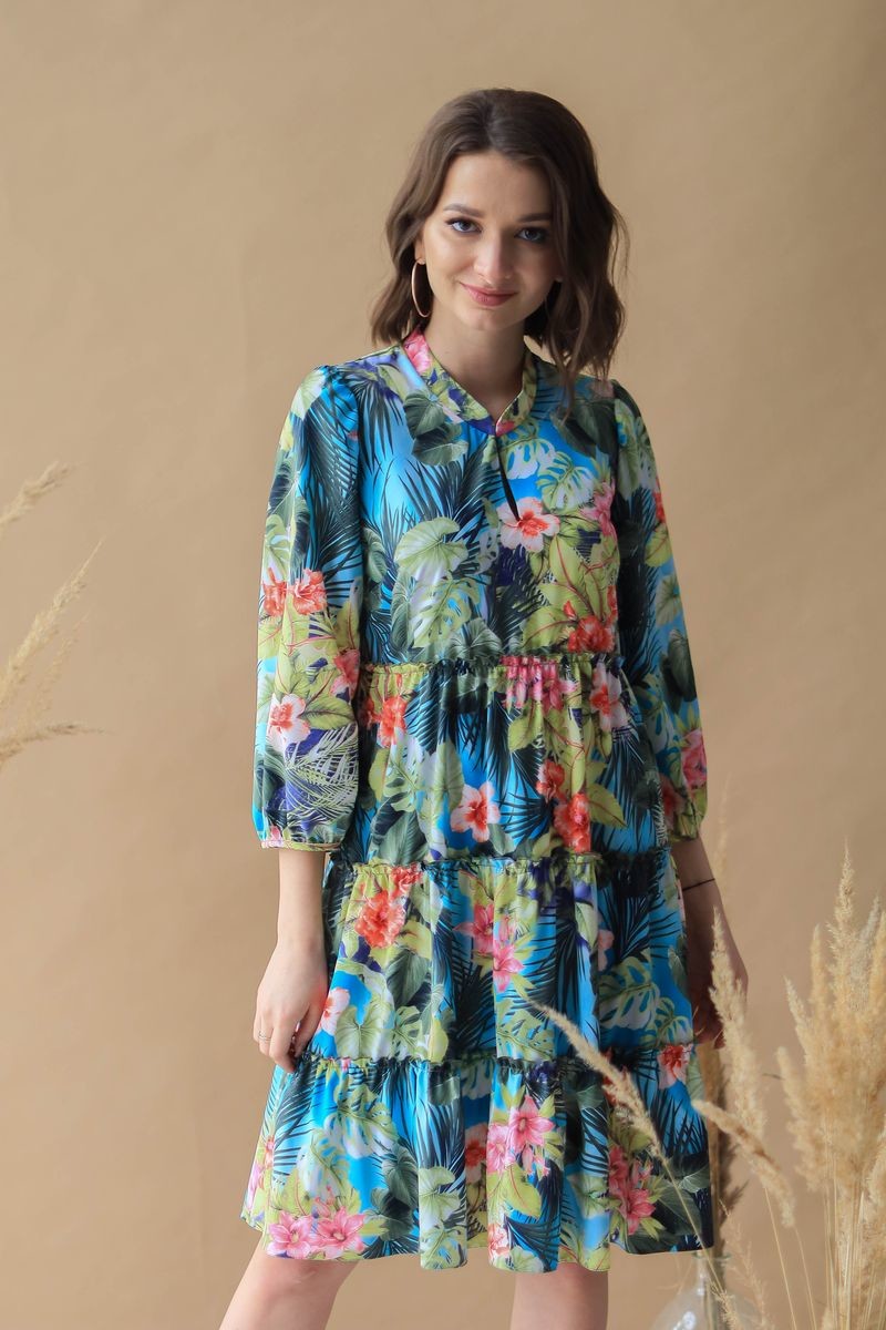Платье свободного силуэта, отрезное по талии. Юбка из трех воланов, на подкладке.