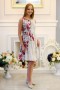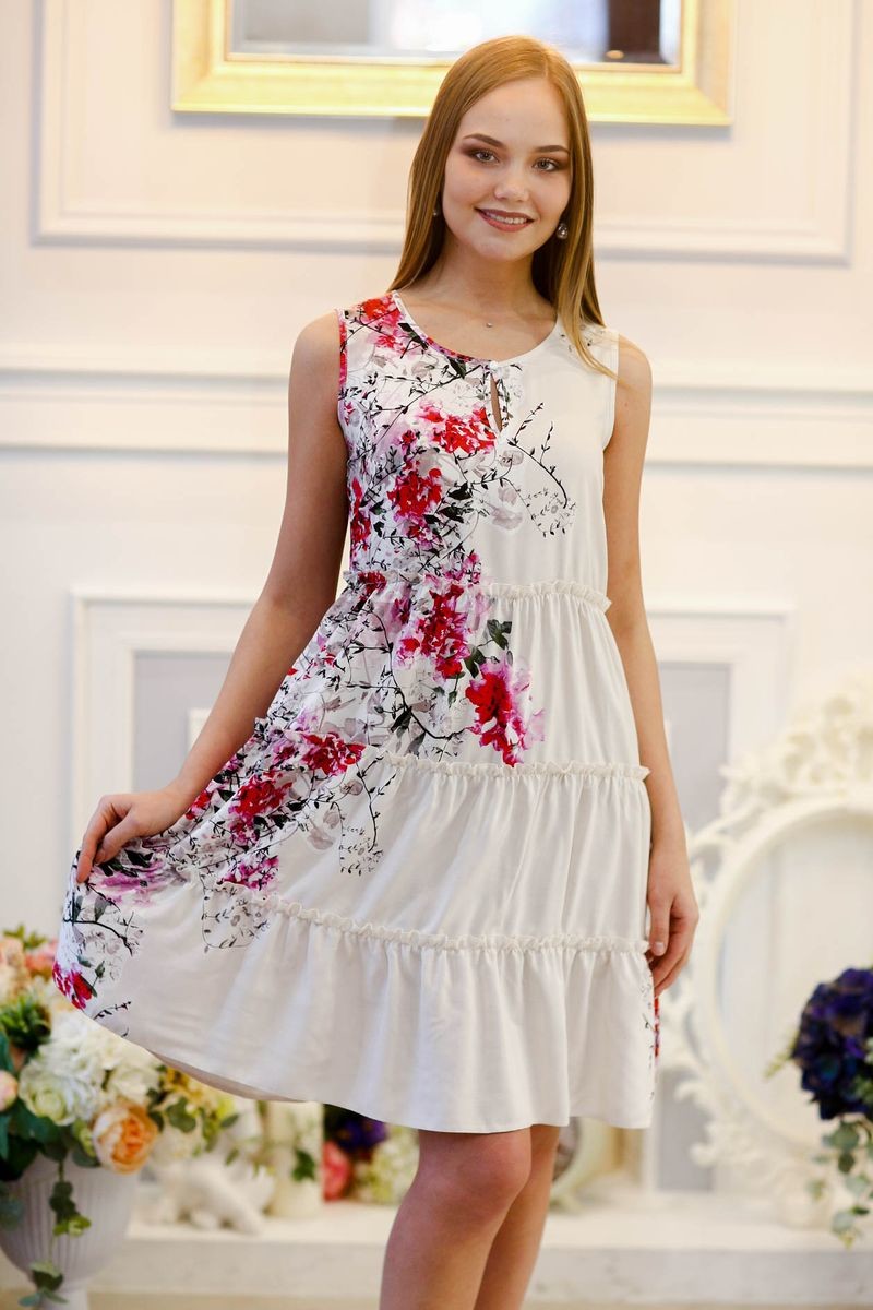 Легкое платье из 100% вискозы (штапель). Отрезное по талии, юбка расклешенная, из трех воланов. Застежка спереди на пуговку. Свободный силуэт скроет небольшие недостатки фигуры и подарит комфорт знойным днем.