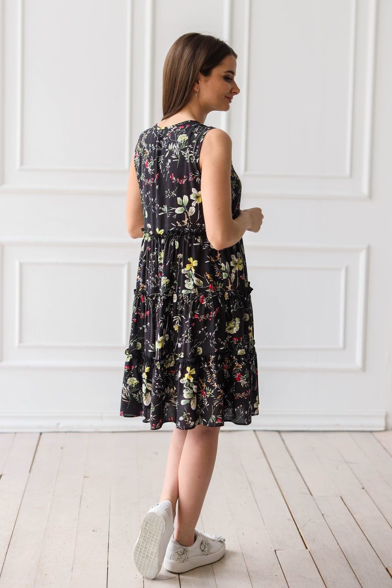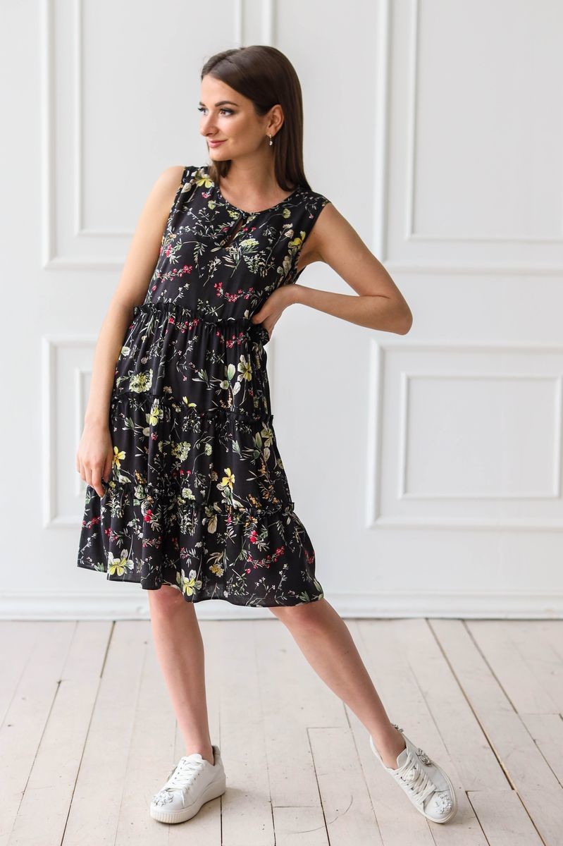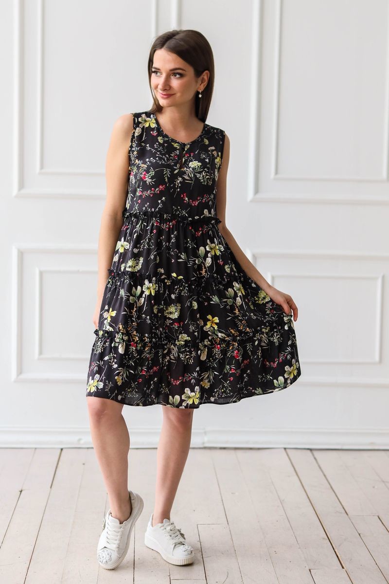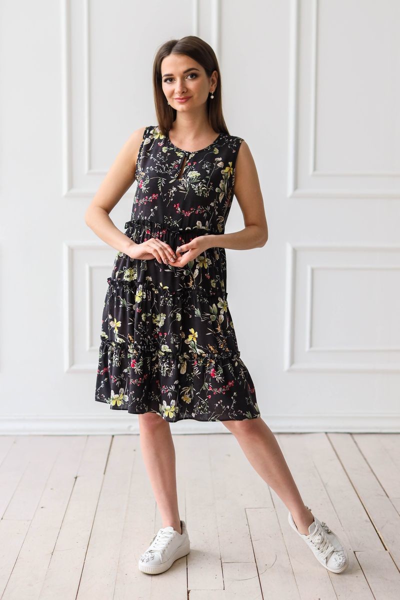 Легкое платье из 100% вискозы (штапель). Отрезное по талии, юбка расклешенная, из трех воланов. Застежка спереди на пуговку. Свободный силуэт скроет небольшие недостатки фигуры и подарит комфорт знойным днем.