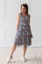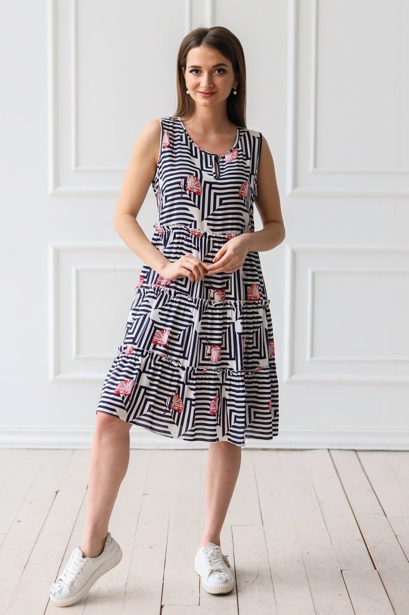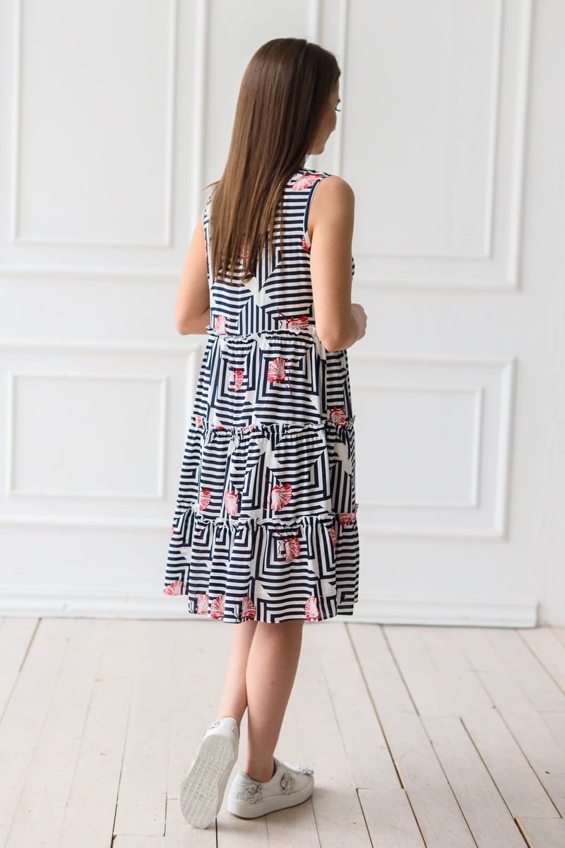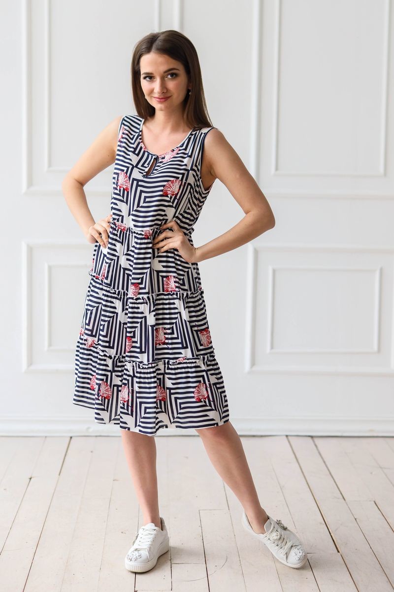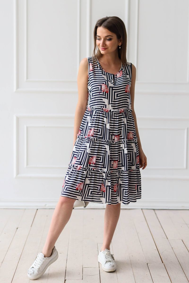 Легкое платье из 100% вискозы (штапель). Отрезное по талии, юбка расклешенная, из трех воланов. Застежка спереди на пуговку. Свободный силуэт скроет небольшие недостатки фигуры и подарит комфорт знойным днем.