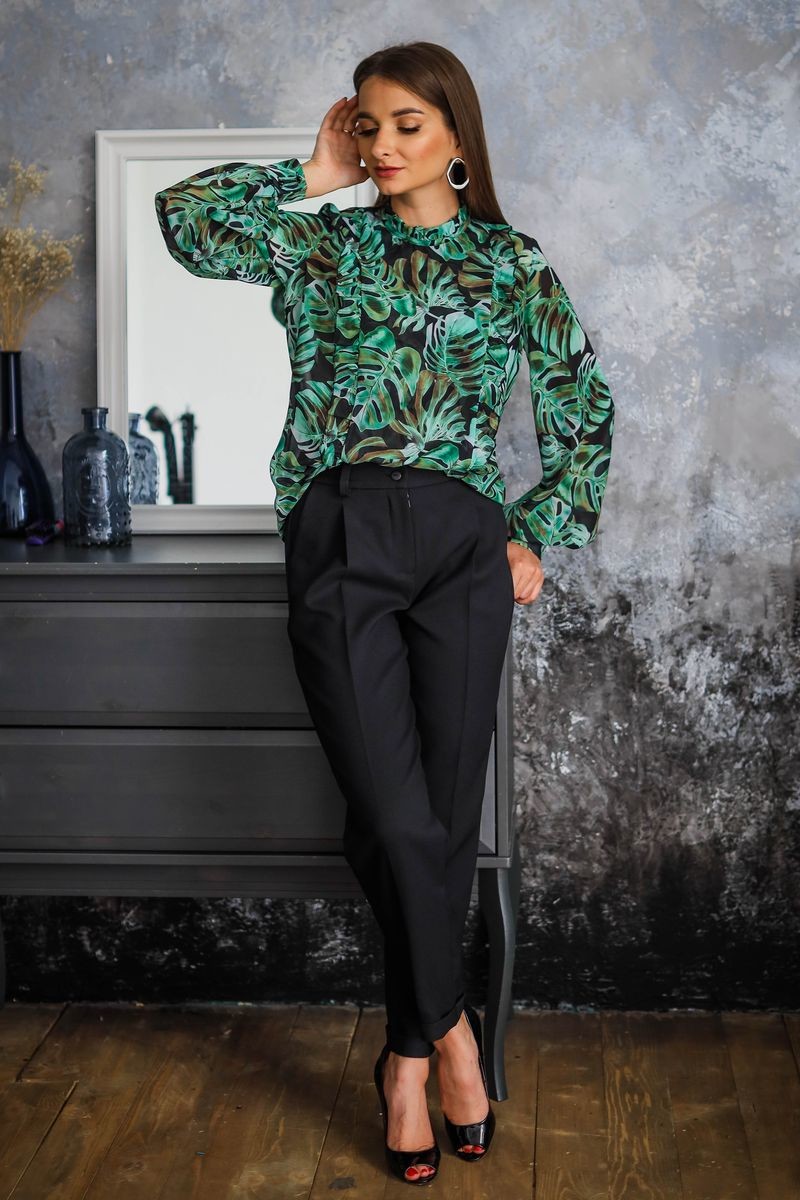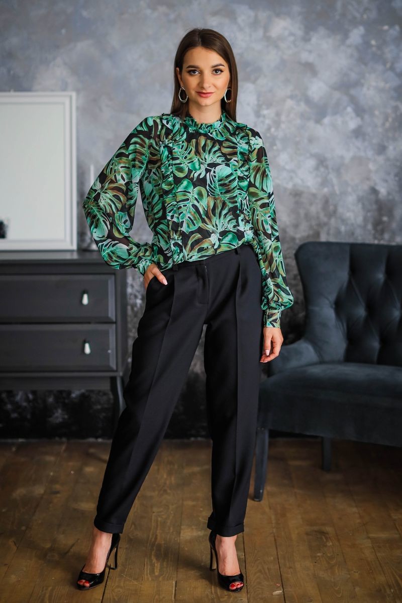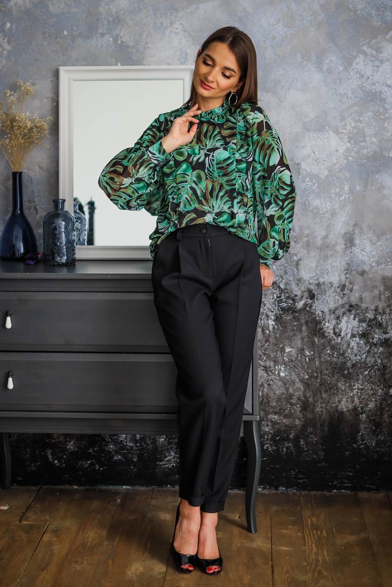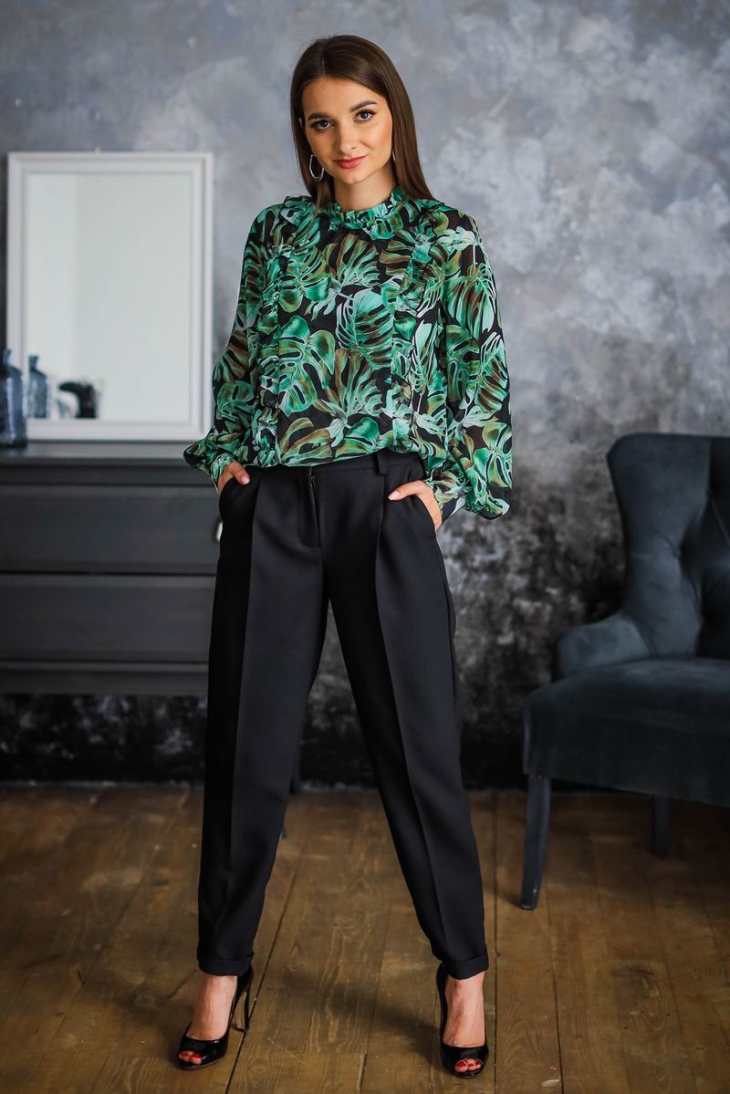 Брюки-бананы средней посадки. Модель свободная по бедрам, чуть заужена к низу. Брючины обработаны отворотами. Застежка спереди на молнию и пуговицу.