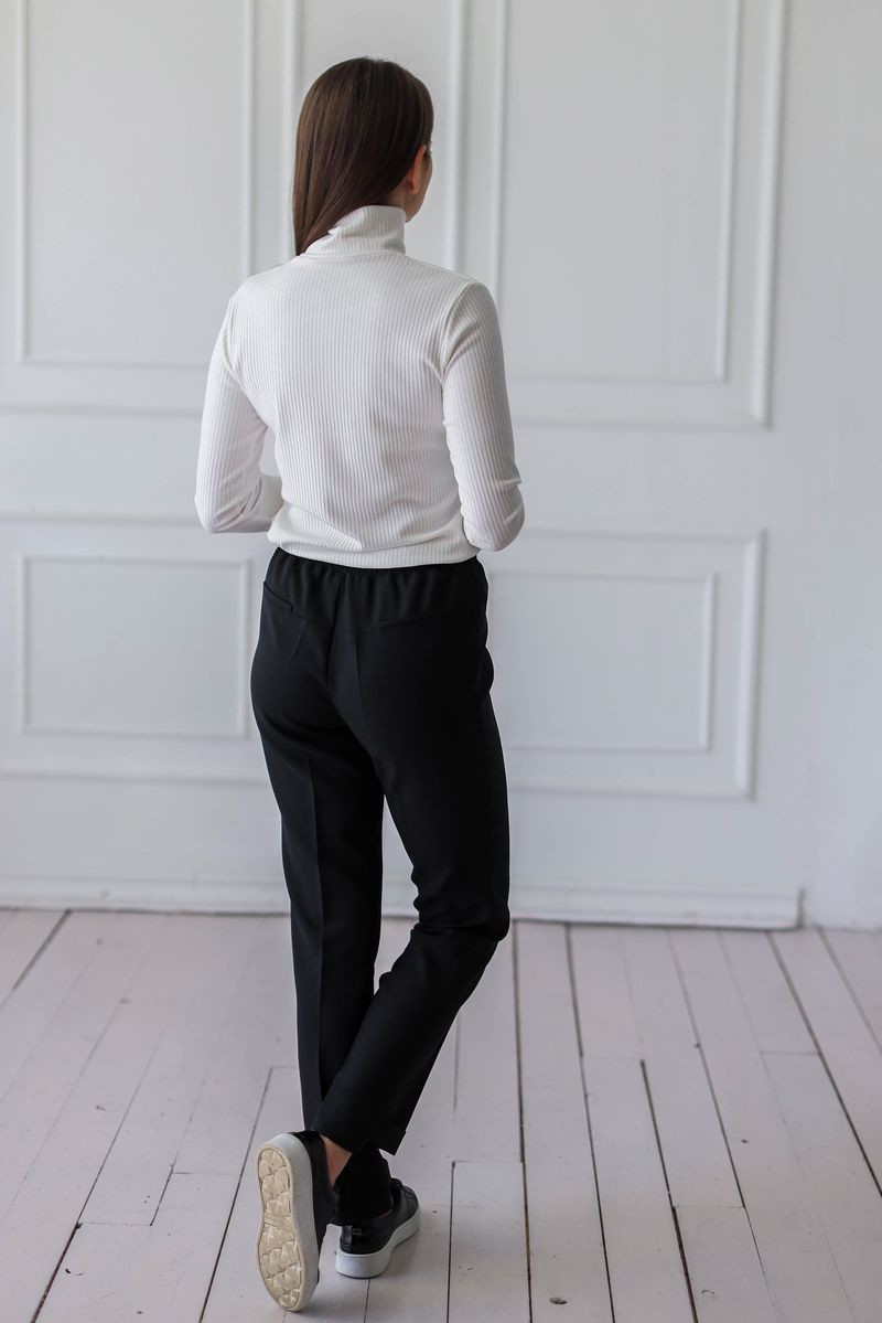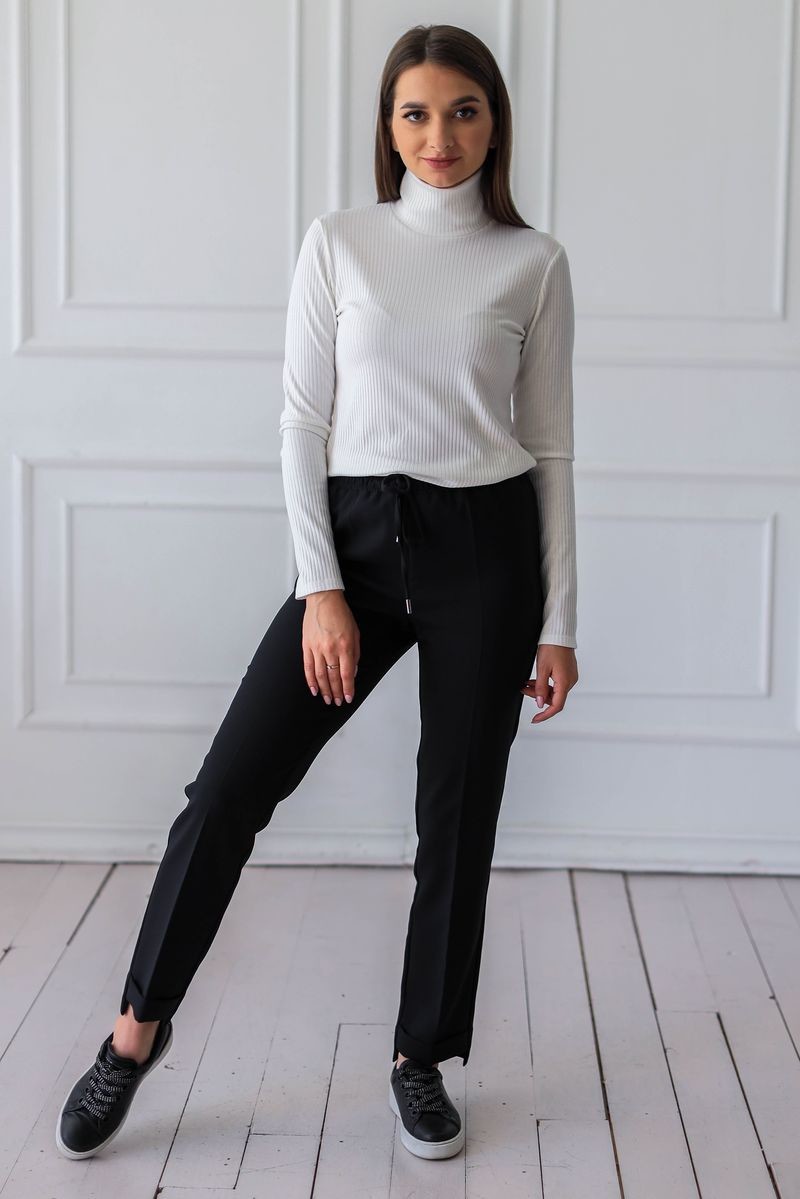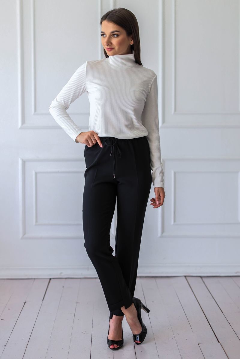 Комфортные брюки на резинке. Регулировка с помощью шнурка. Брюки чуть заужены к низу, брючины с перепадом длины - задняя половинка длинее, передняя обработана отворотом.