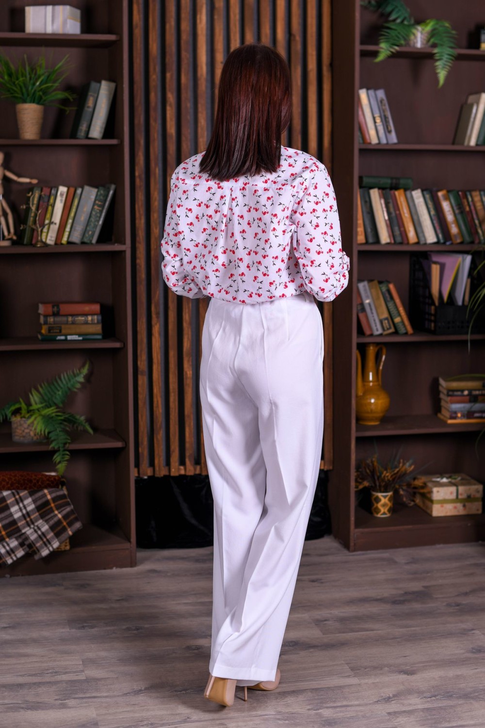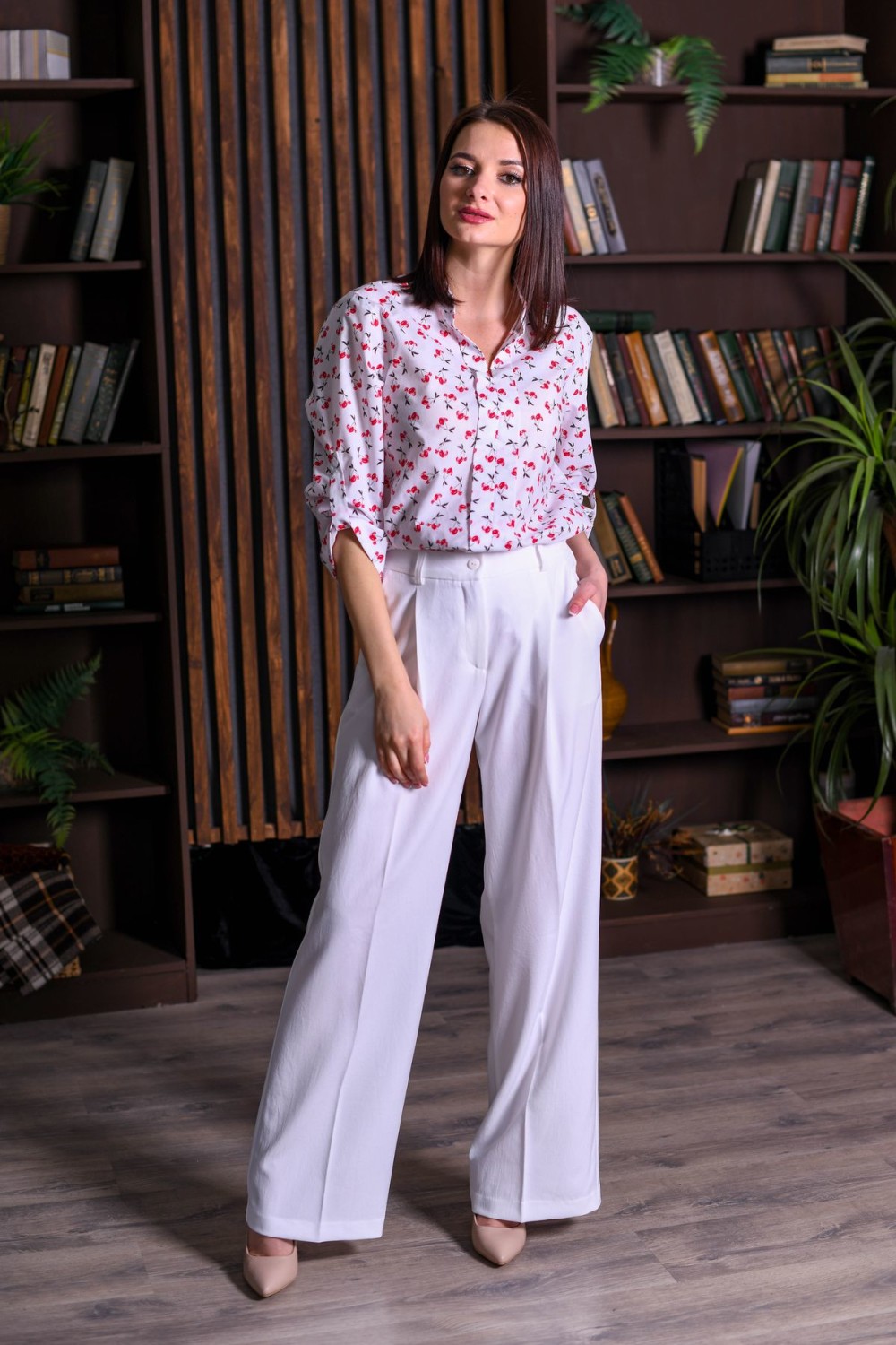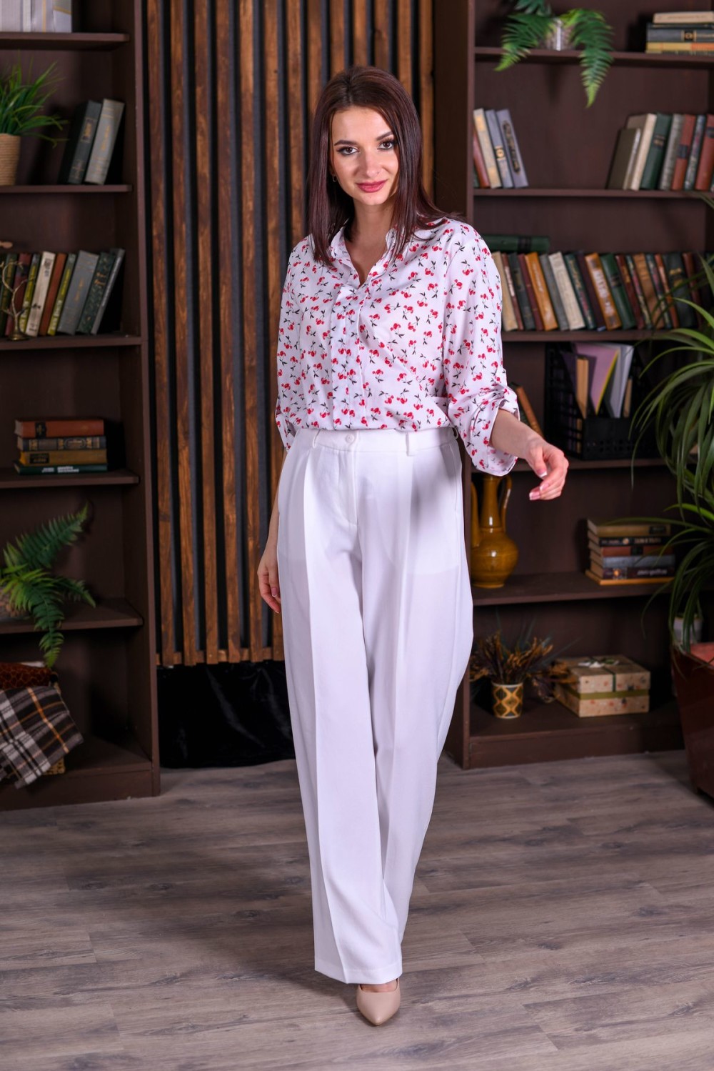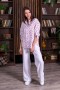 Брюки на поясе прямого силуэта, чуть расклешенные от бедра. Застежка на пуговицу и молнию.В задней части пояса вшитая резинка для удобства посадки.