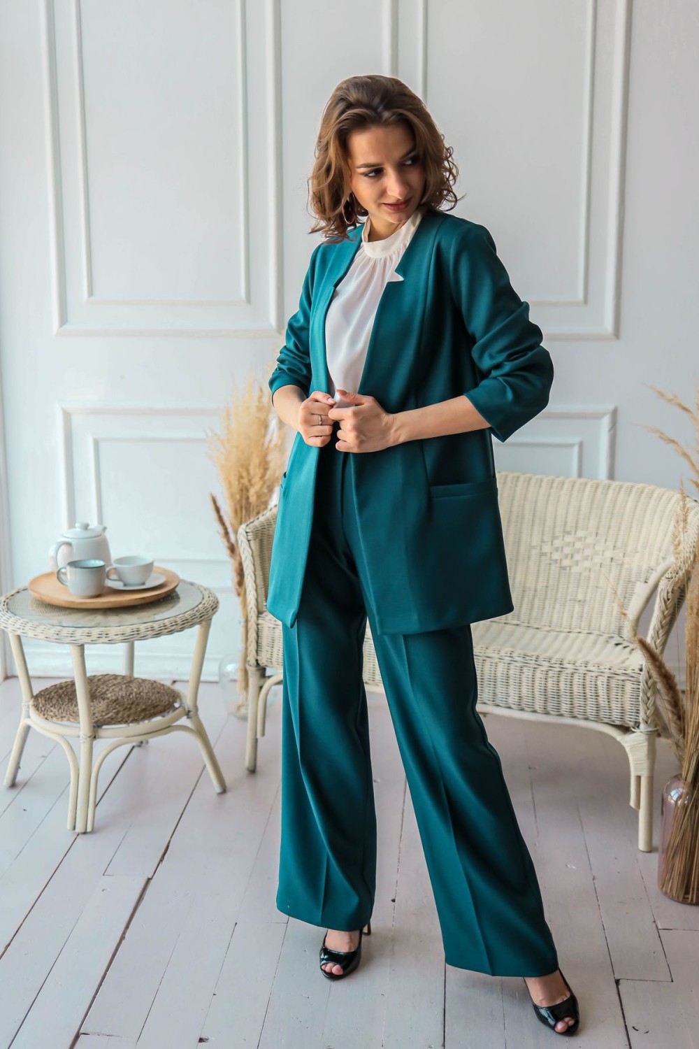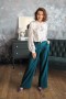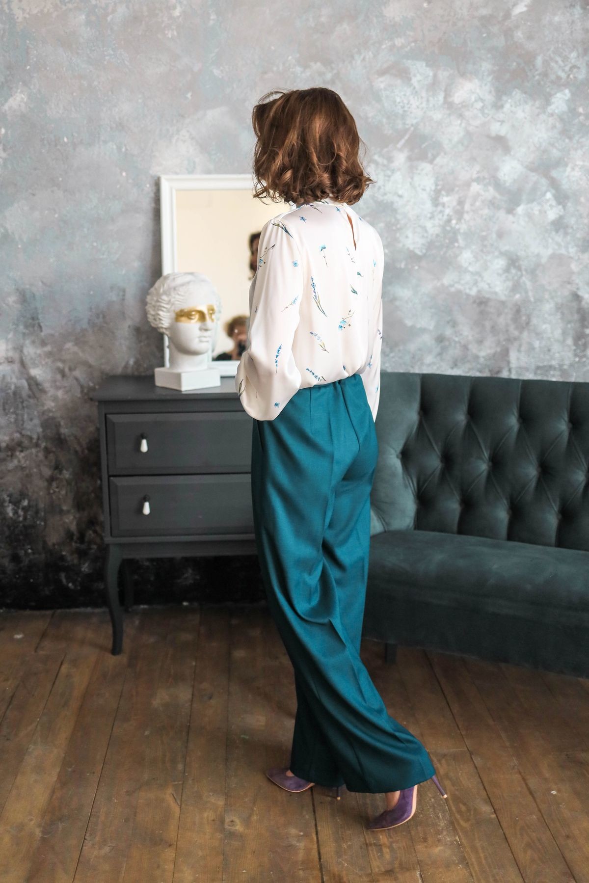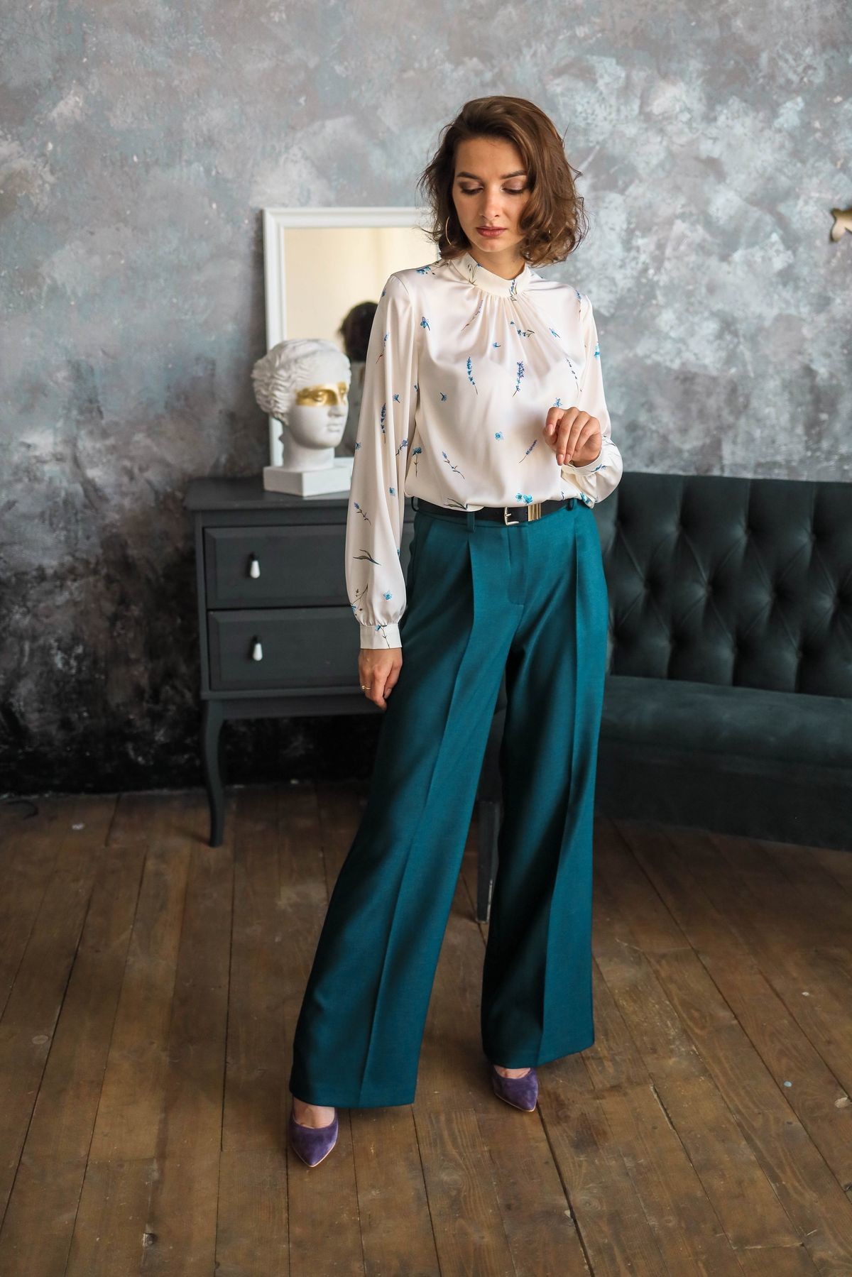 Широкие брюки прямого силуэта на поясе. Есть шлевки под ремень. Застежка на молнию и пуговицу.